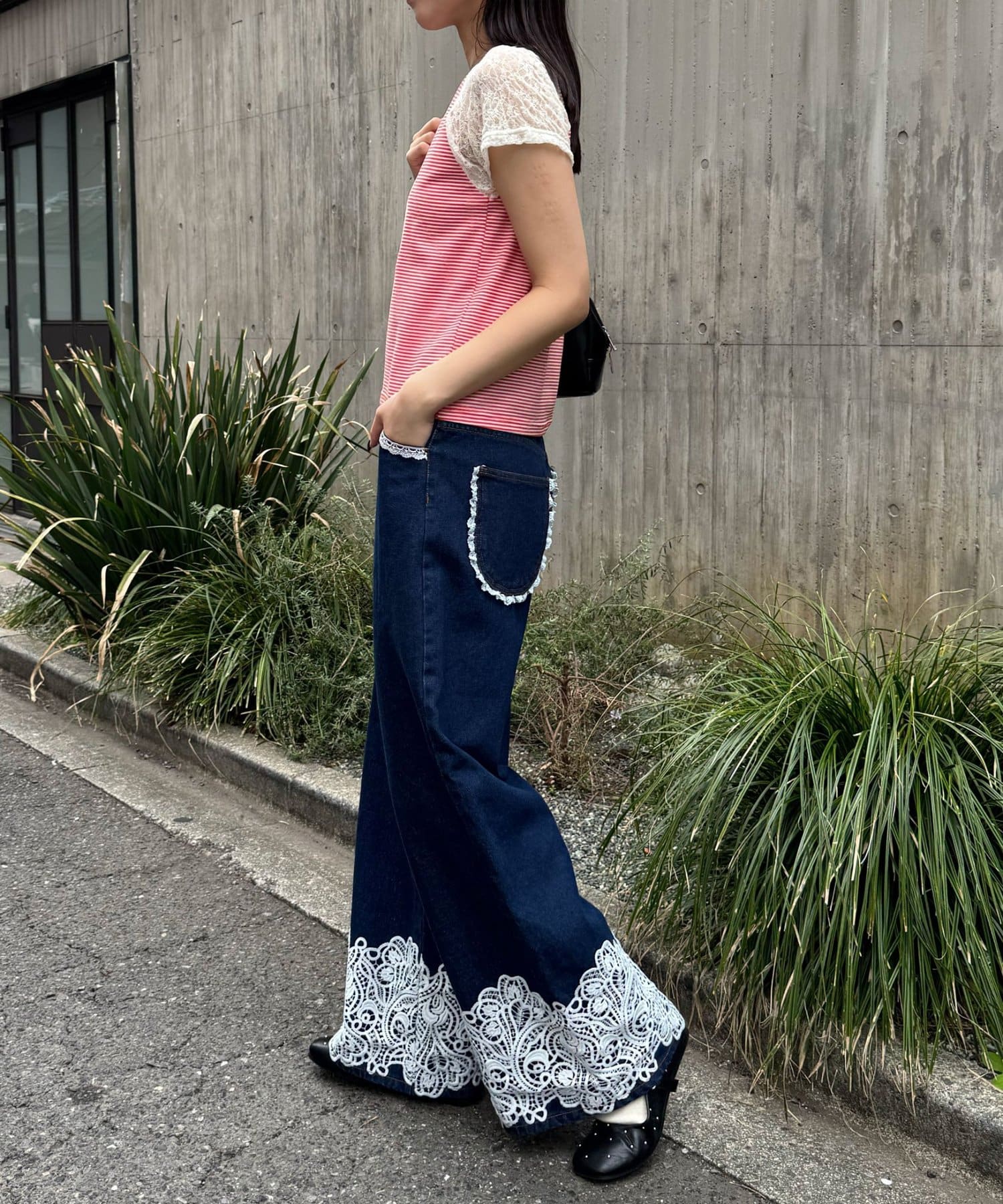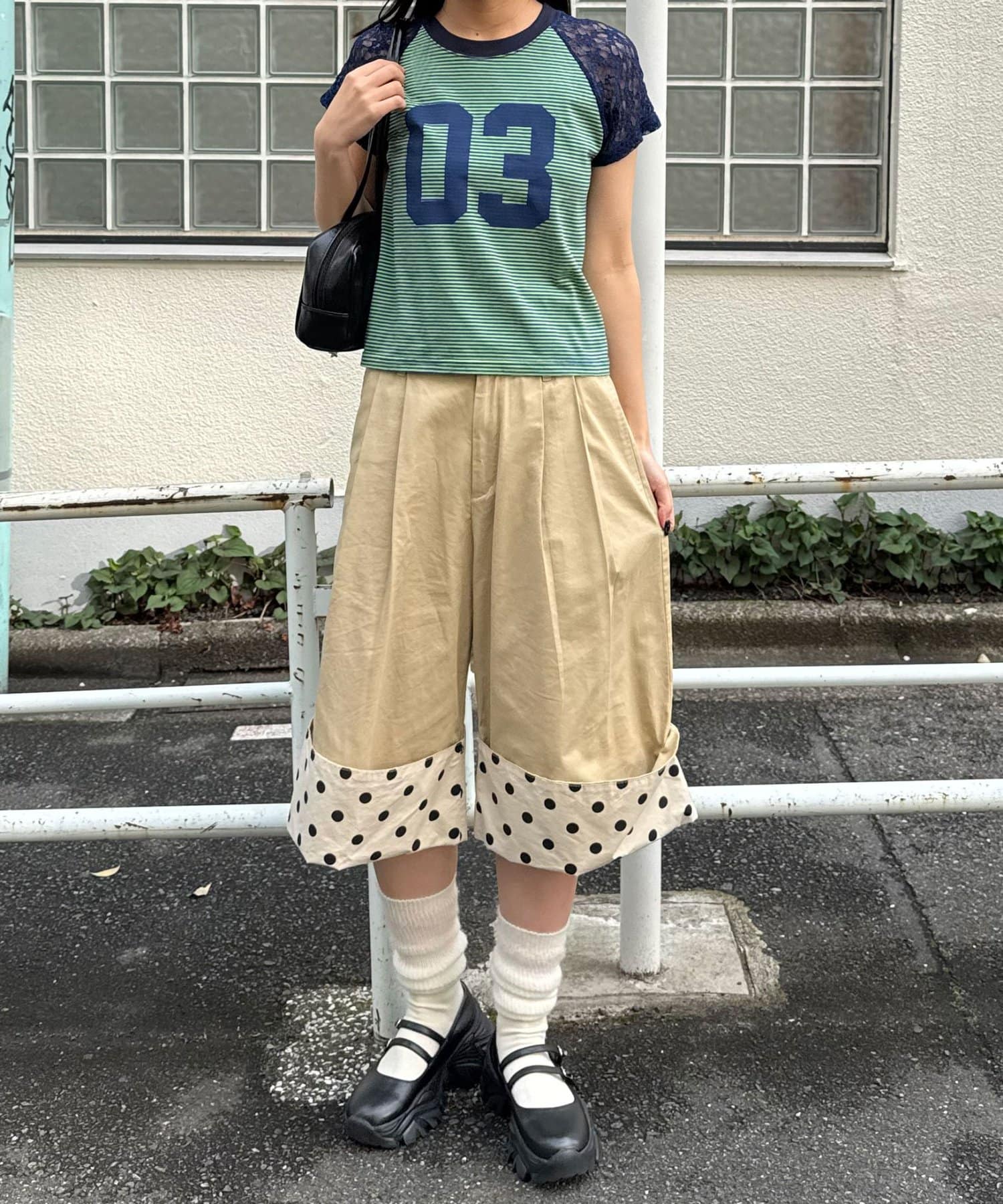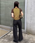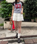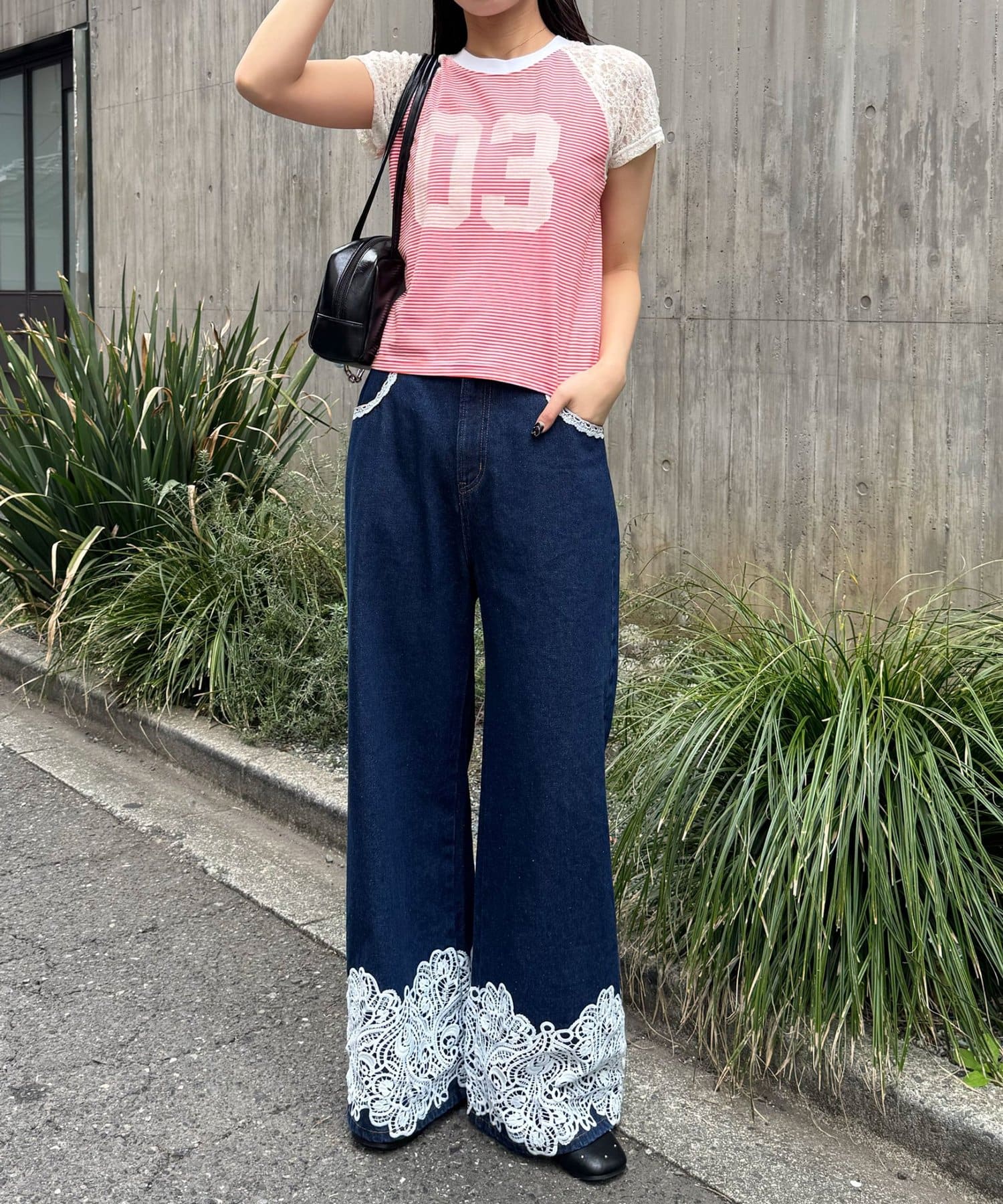 カジュアルな印象のラグランTをレースで切り替えることで、ストリート感の中に女の子らしさをプラスした一着。