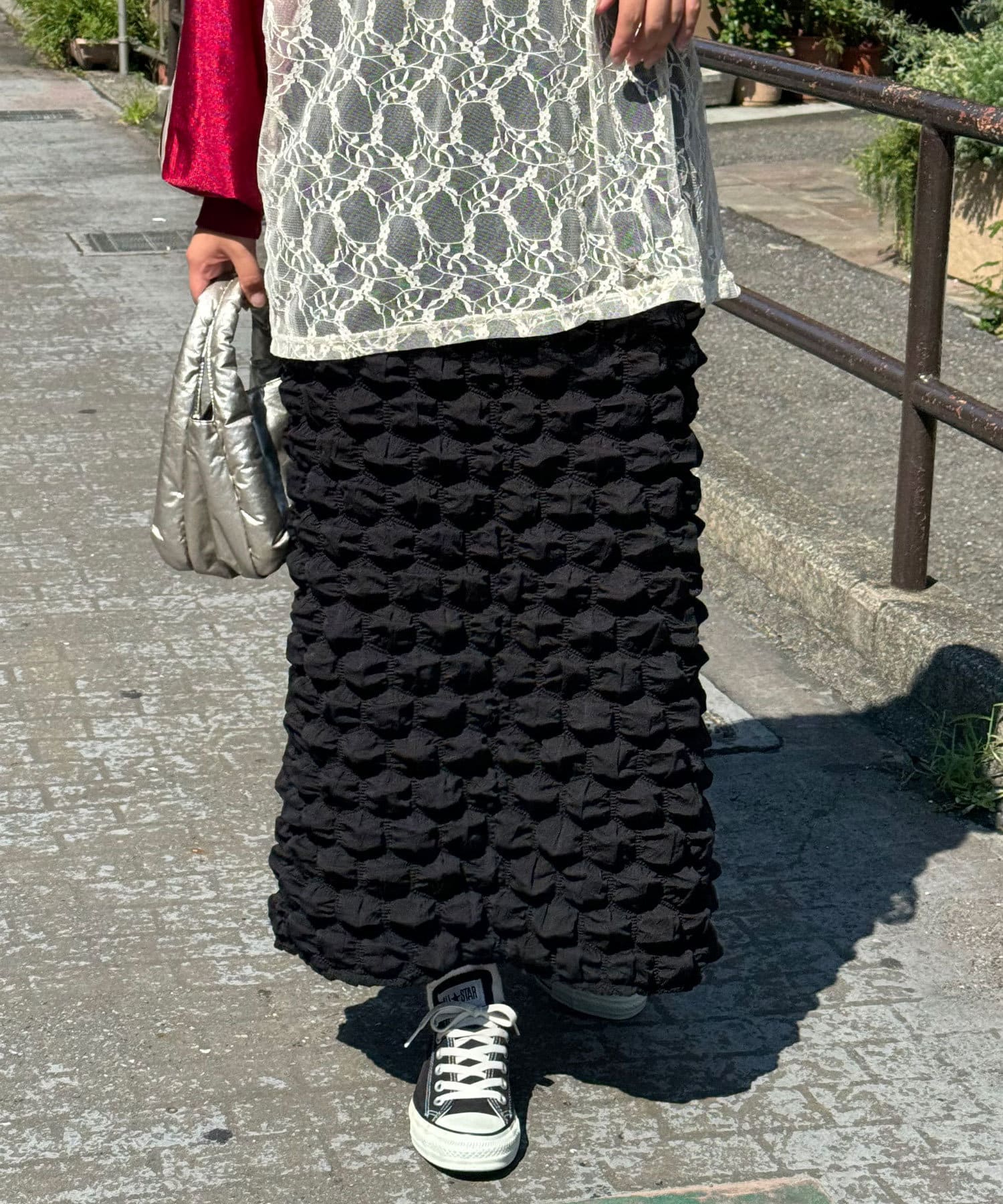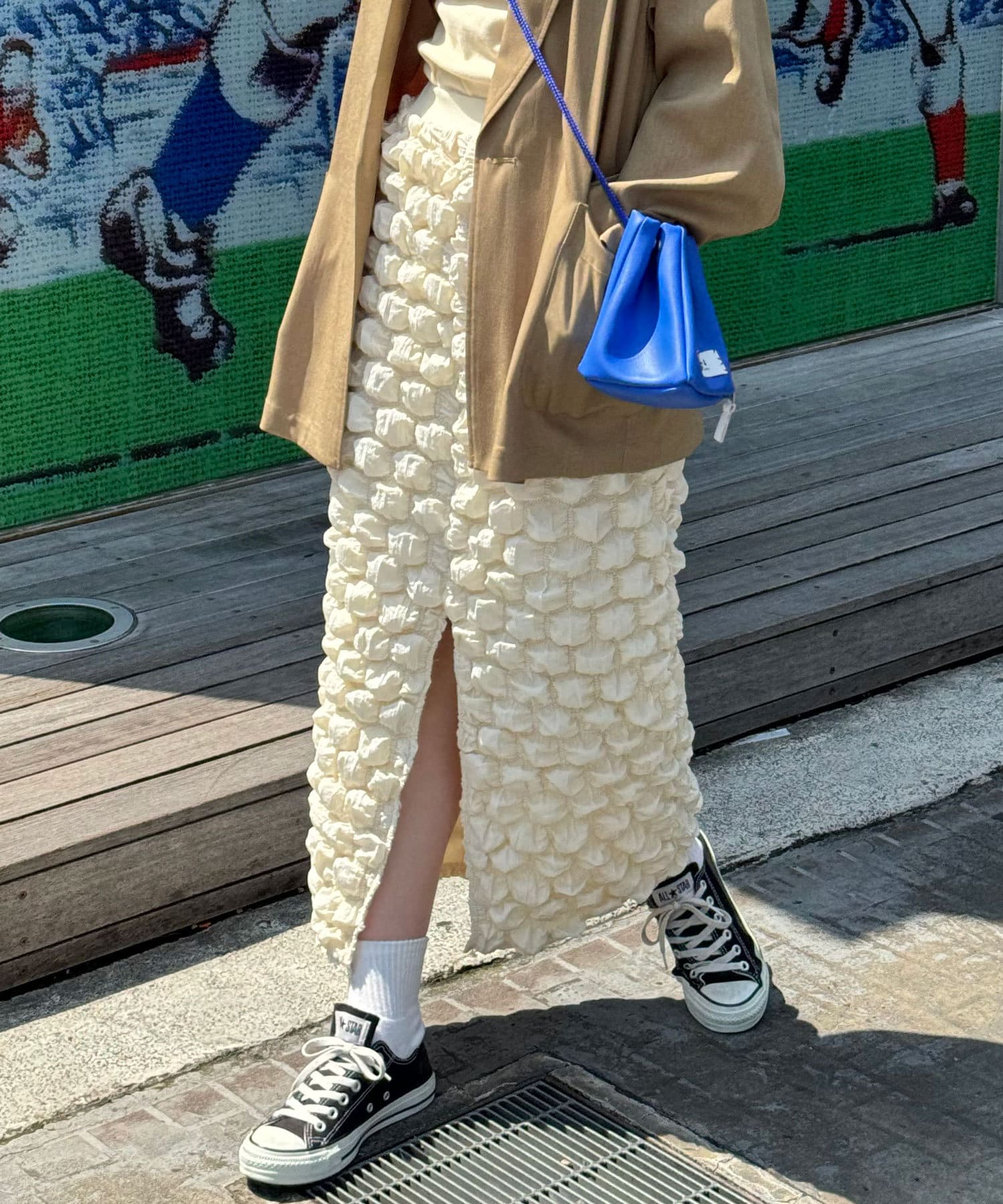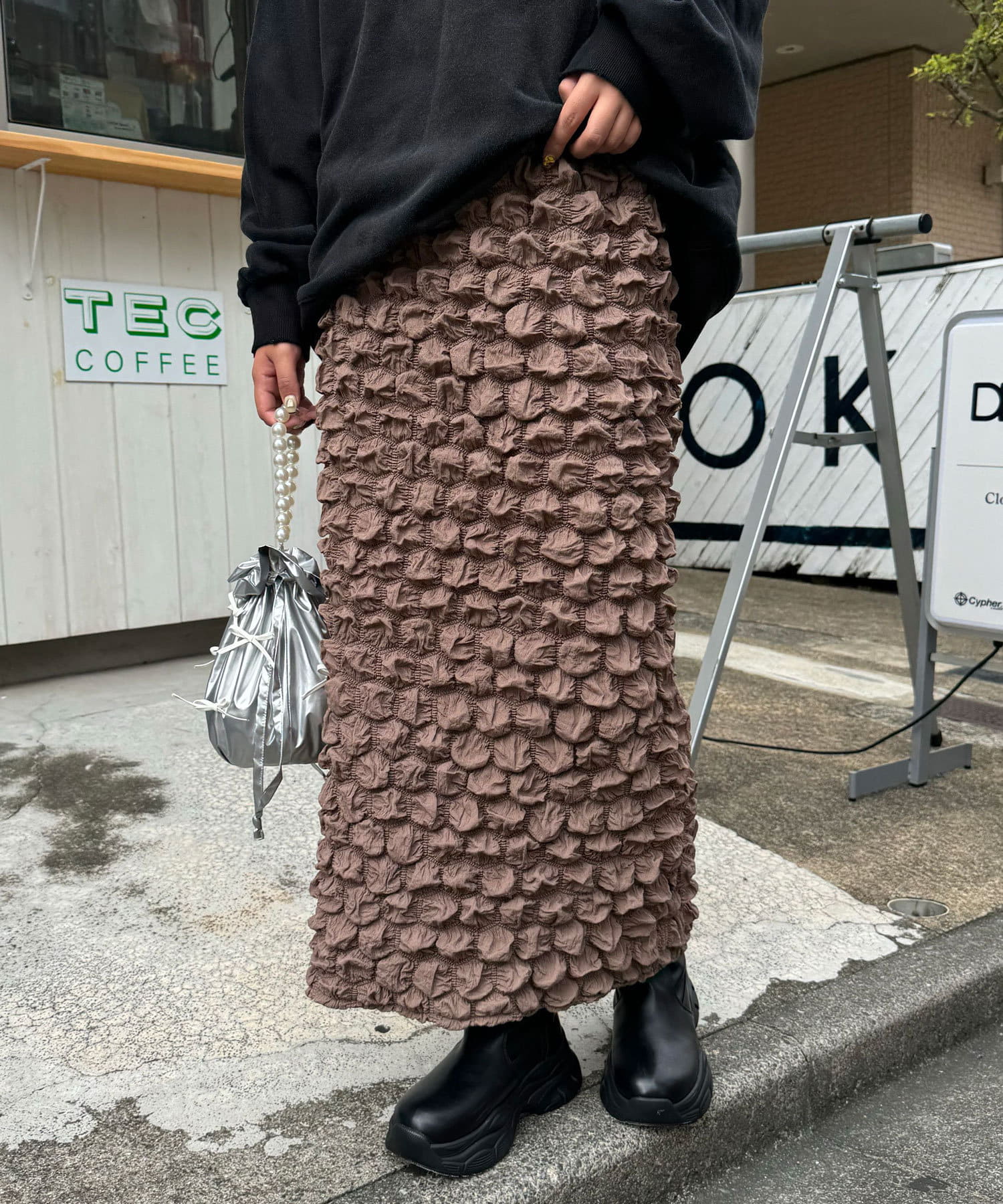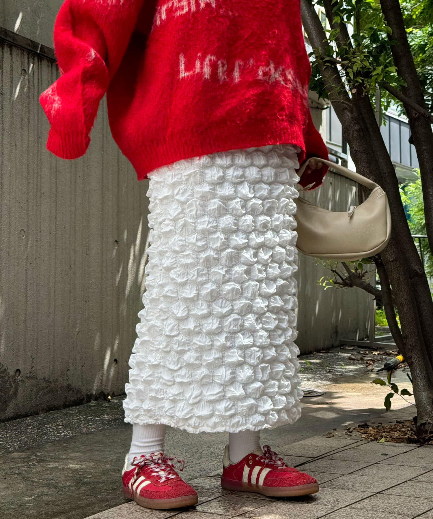 存在感のある立体的なふくれジャガード生地を使用したIラインスカート。