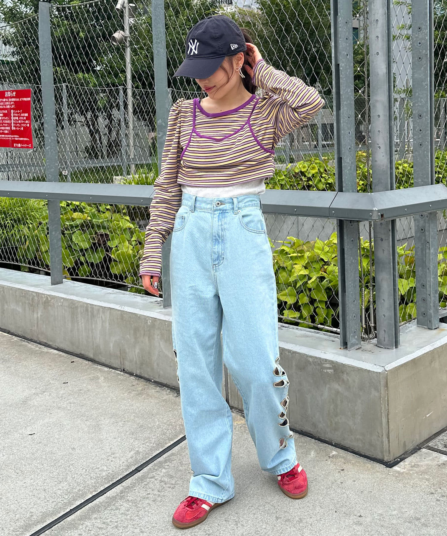 同素材のカットアウトデニムジャケットとのセットアップ着用もハロサン好きにはイチオシのスタイリングです。
