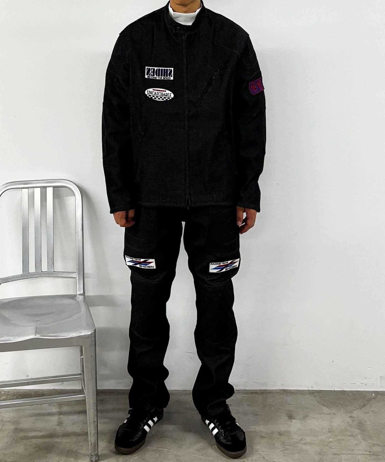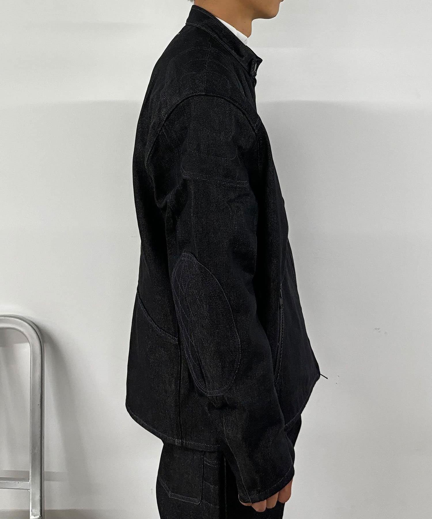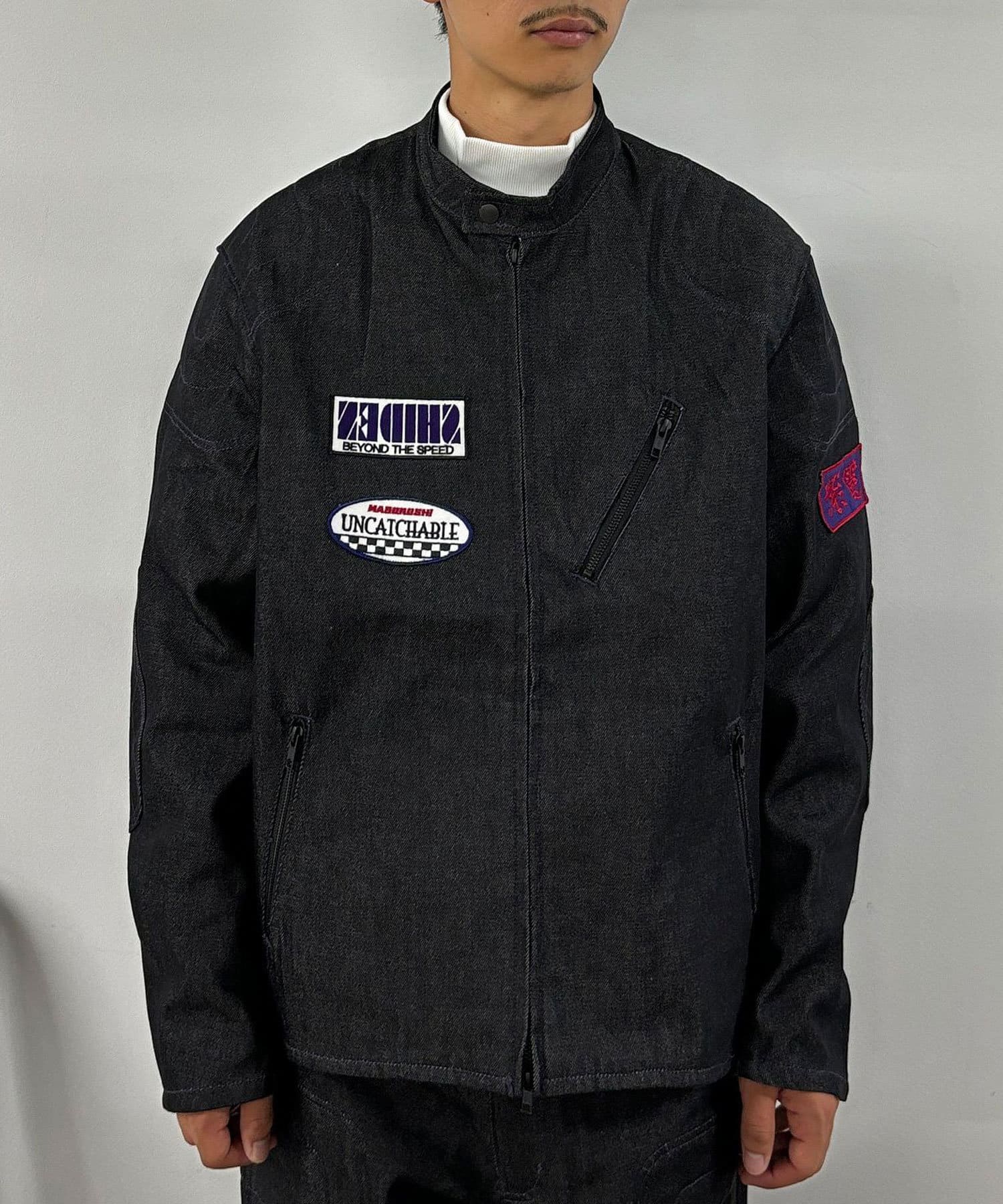 今シーズンからデビューした、日本独自のバイクカルチャーに焦点を当て展開するブランド〈SHIDEN(紫電)〉。コレクションの中でも特にアイコニックなアイテムが"モーターサイクルジャケット"です。ショルダーやエルボーの補強、ライディングスタイルを考慮した短いレングスや立体的なシルエットなど、無骨なデザインが特徴的な一着。すっきりとした立ち襟、胸やスリーブに縫い付けたオリジナルのワッペンと、装飾的なアレンジによってファッション性の高い仕上がりとなっています。ベーシックな表情の13.5ozデニム素材を採用しています。