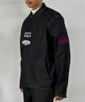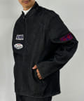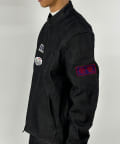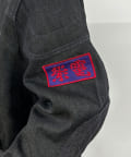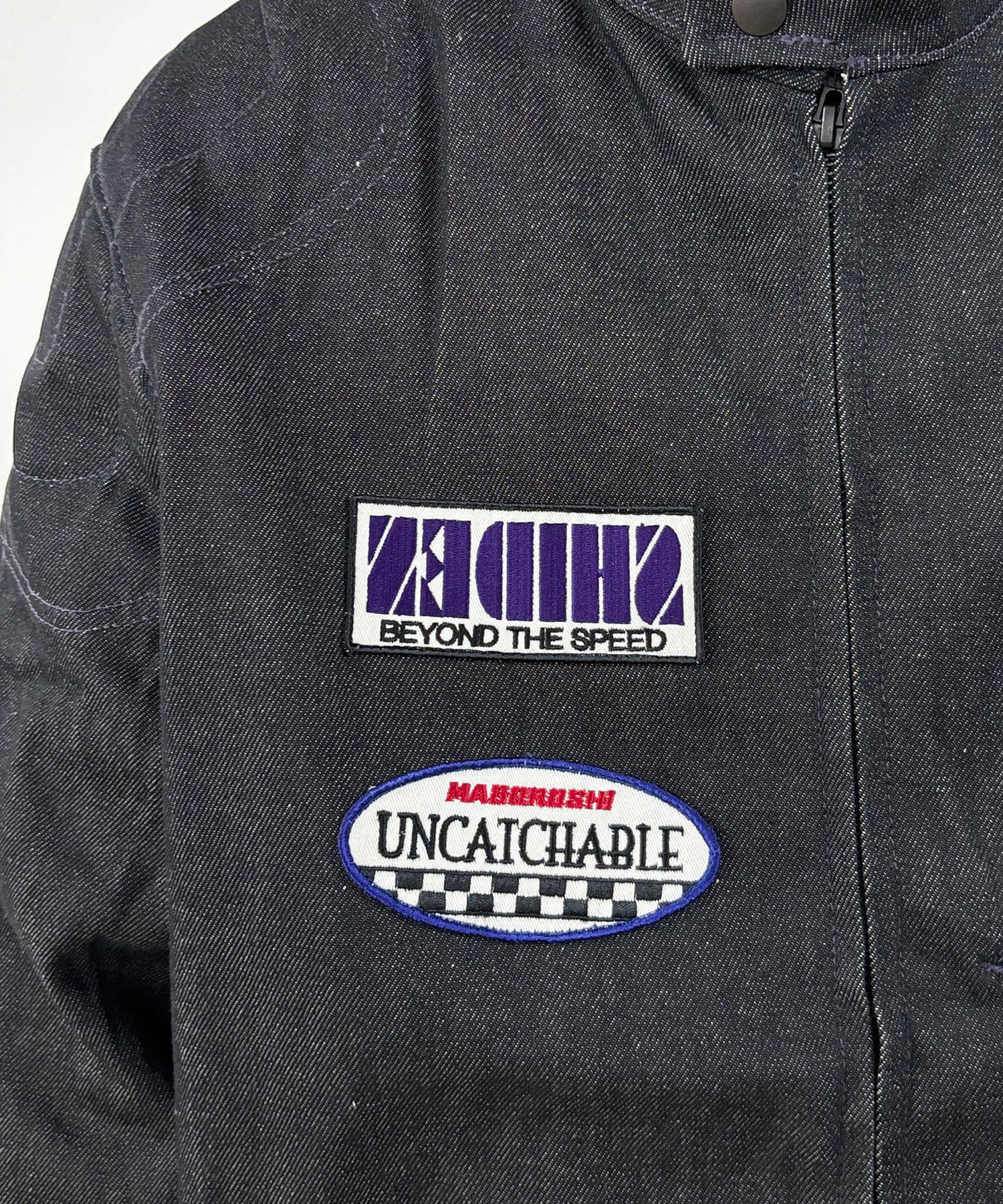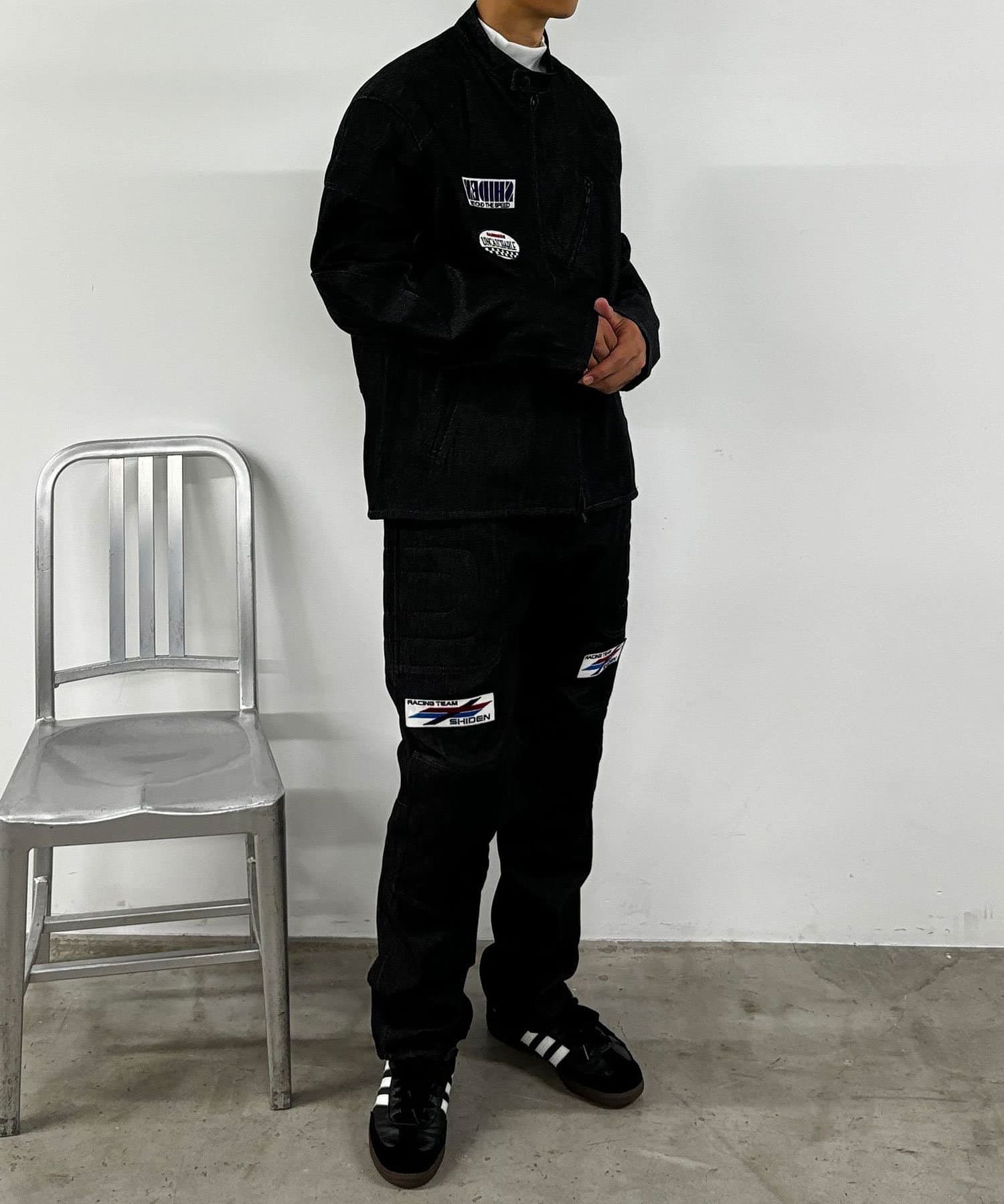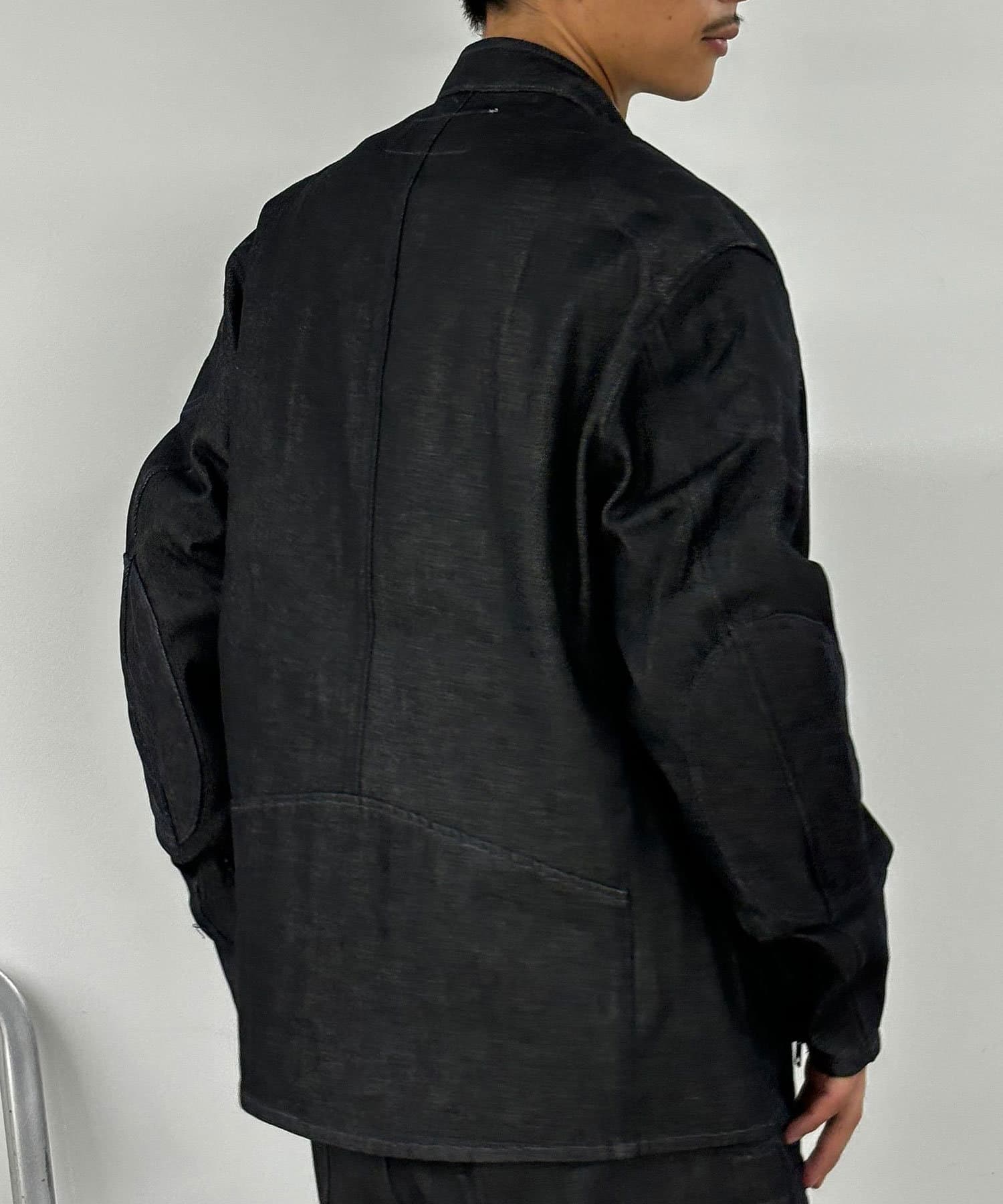 今シーズンからデビューした、日本独自のバイクカルチャーに焦点を当て展開するブランド〈SHIDEN(紫電)〉。コレクションの中でも特にアイコニックなアイテムが"モーターサイクルジャケット"です。ショルダーやエルボーの補強、ライディングスタイルを考慮した短いレングスや立体的なシルエットなど、無骨なデザインが特徴的な一着。すっきりとした立ち襟、胸やスリーブに縫い付けたオリジナルのワッペンと、装飾的なアレンジによってファッション性の高い仕上がりとなっています。ベーシックな表情の13.5ozデニム素材を採用しています。