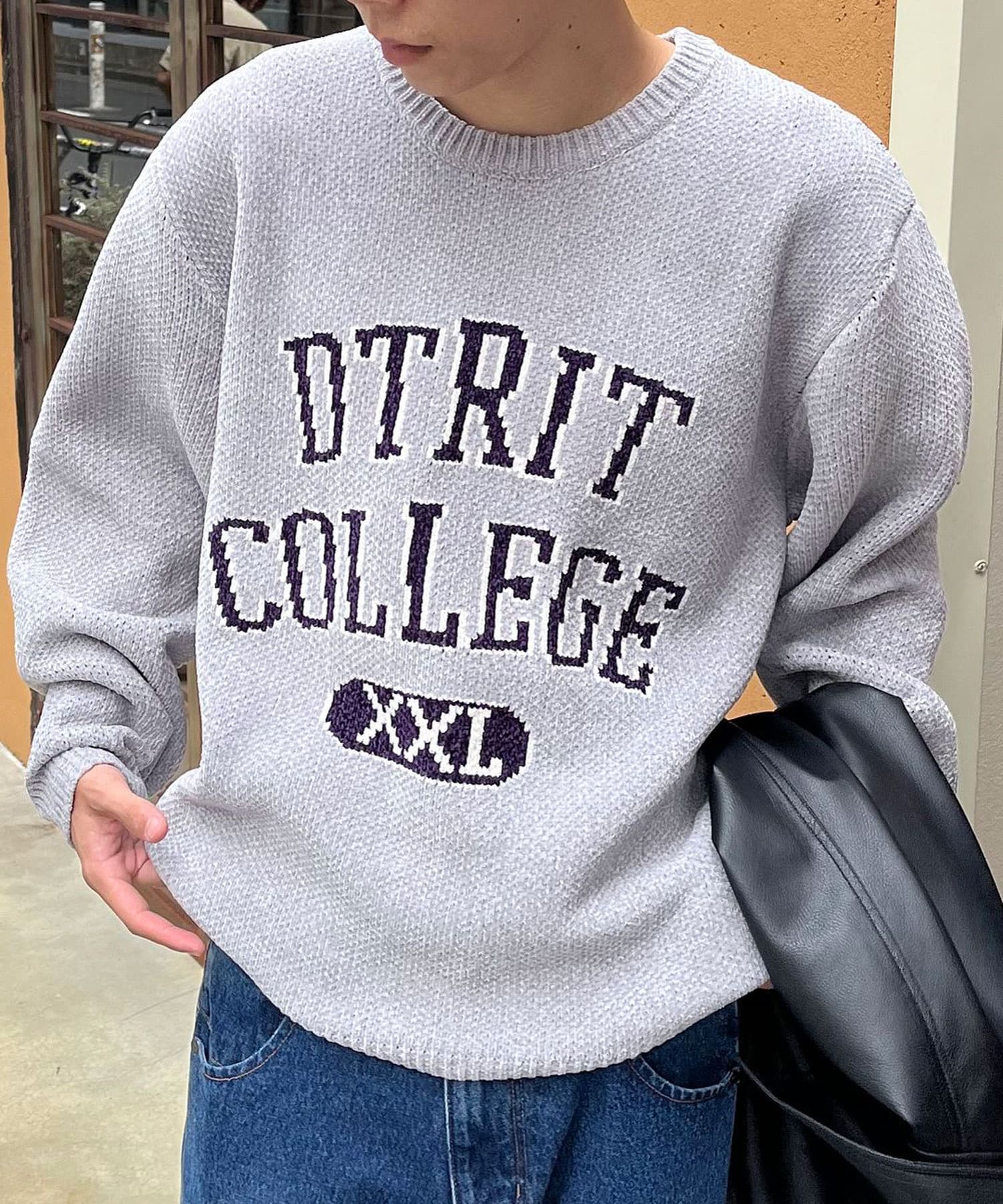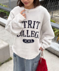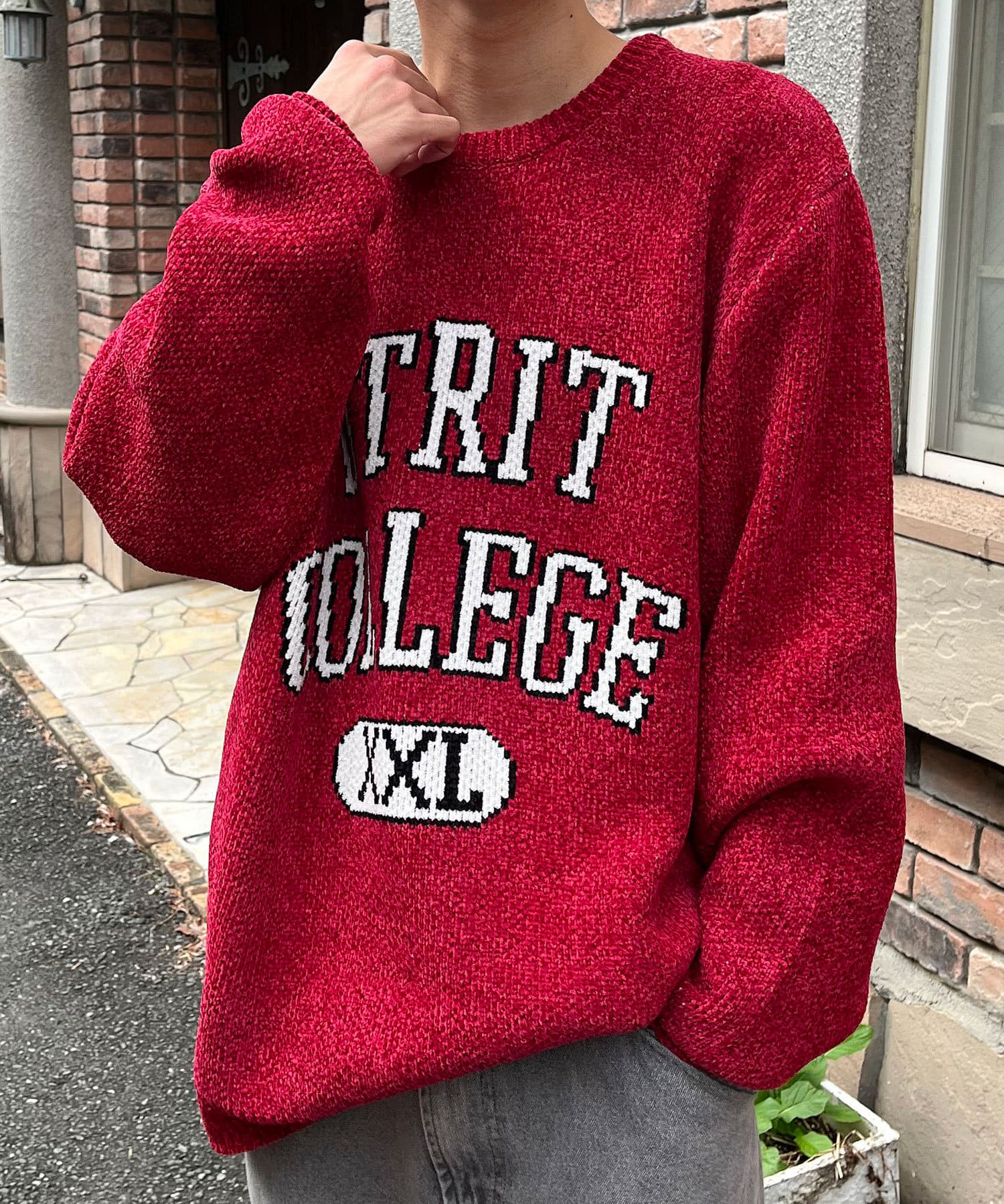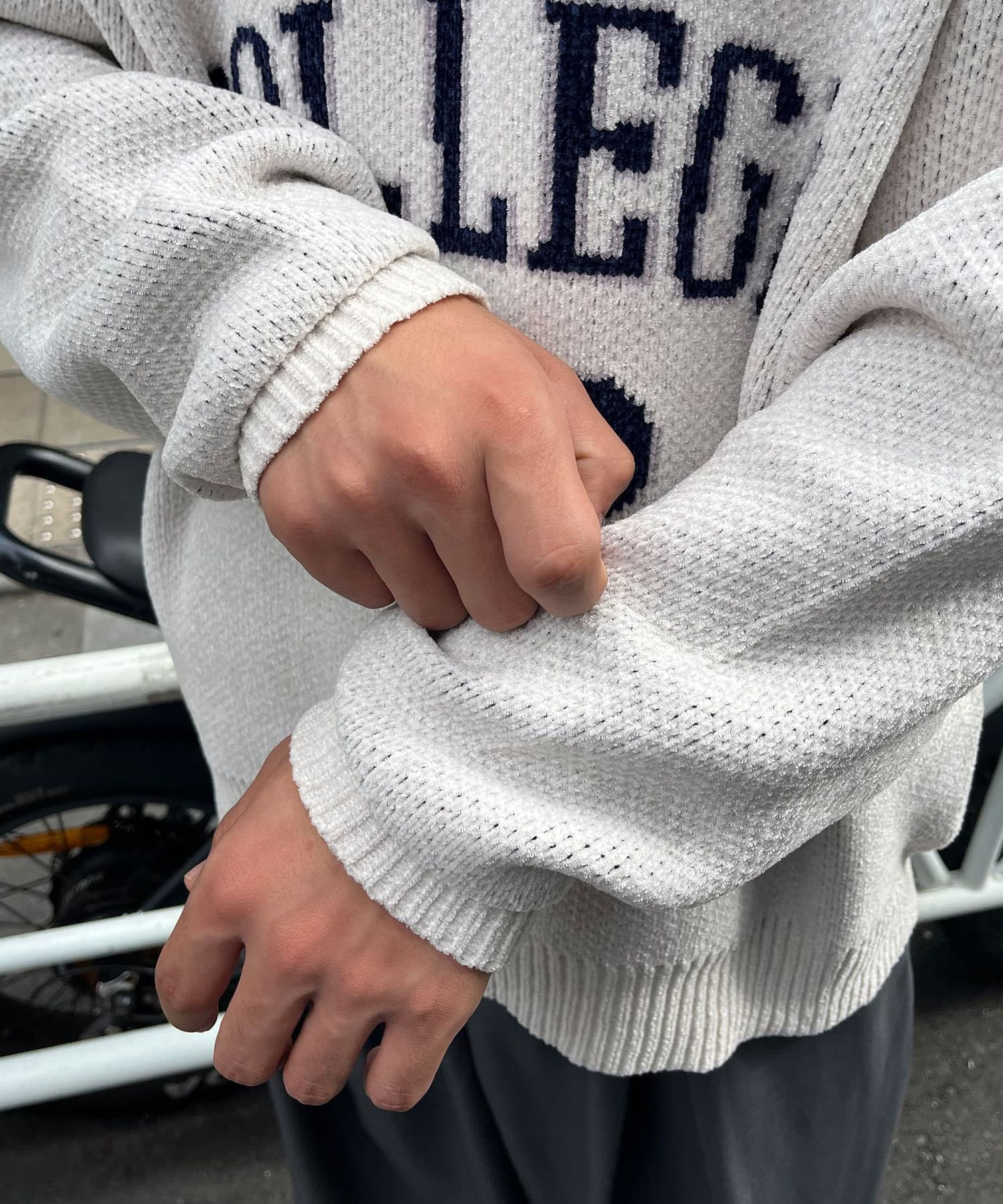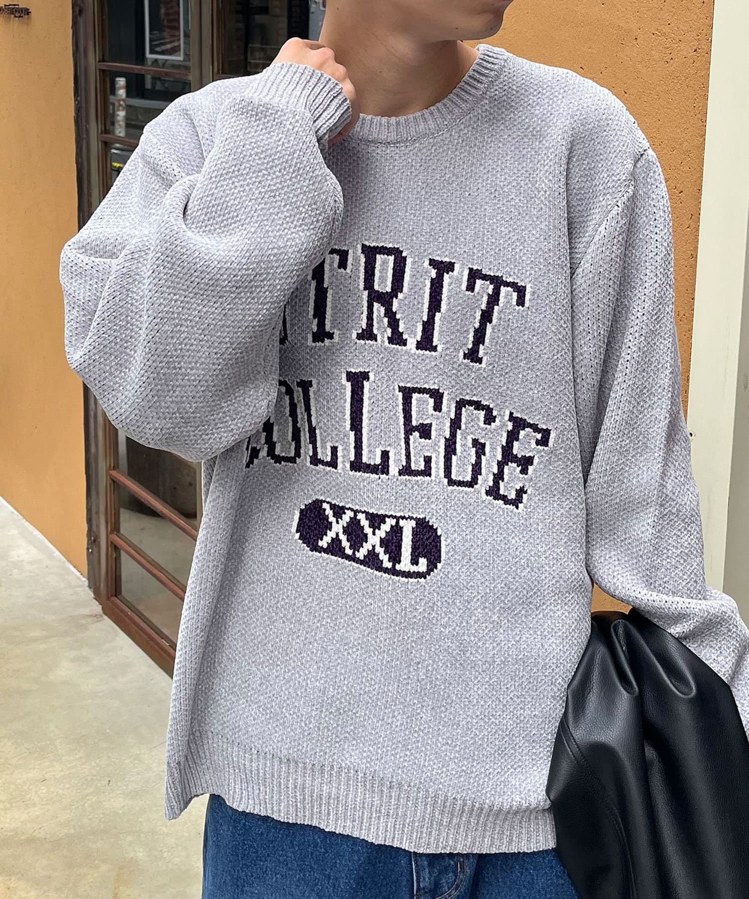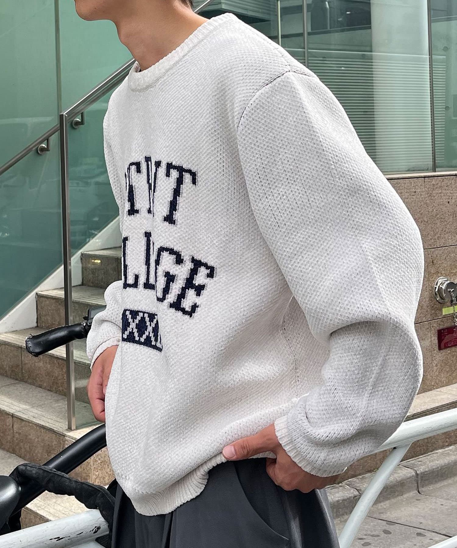 ヴィンテージ風のフロントロゴが目を惹く、カレッジ風ニット。