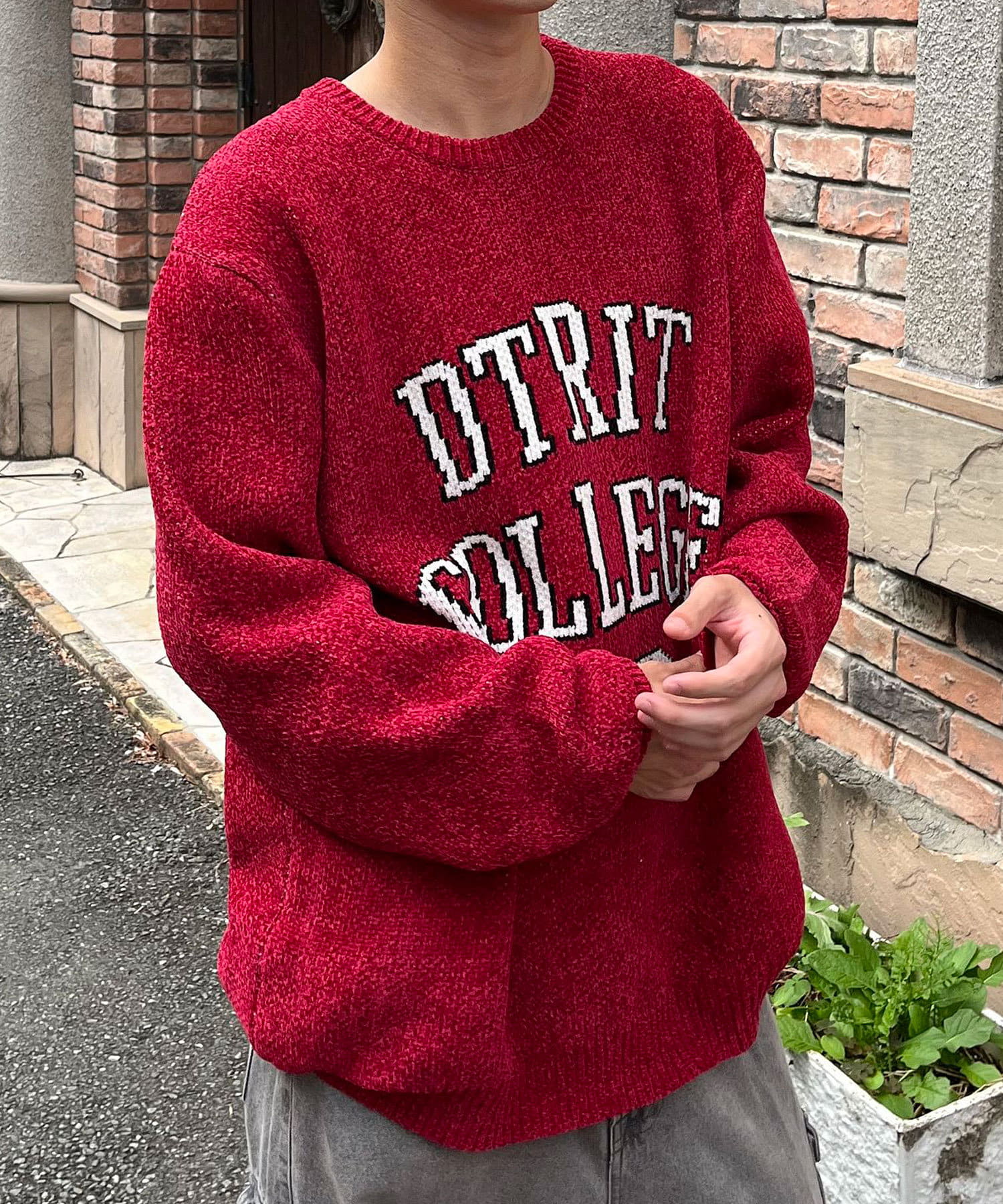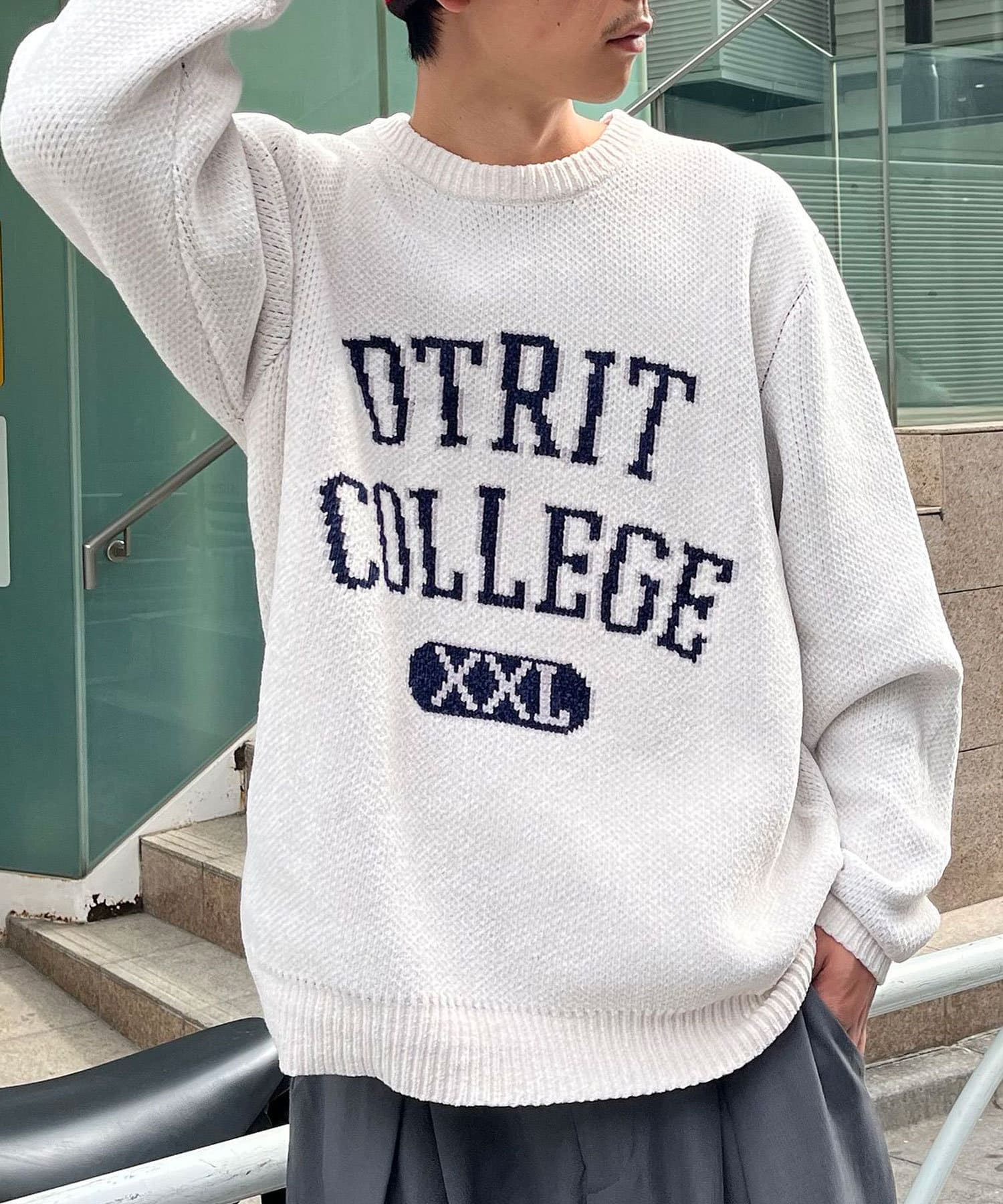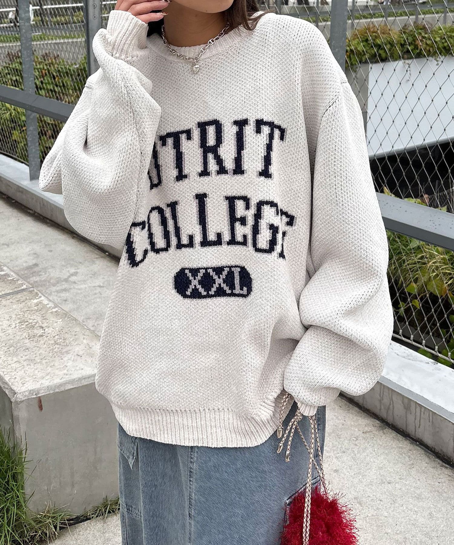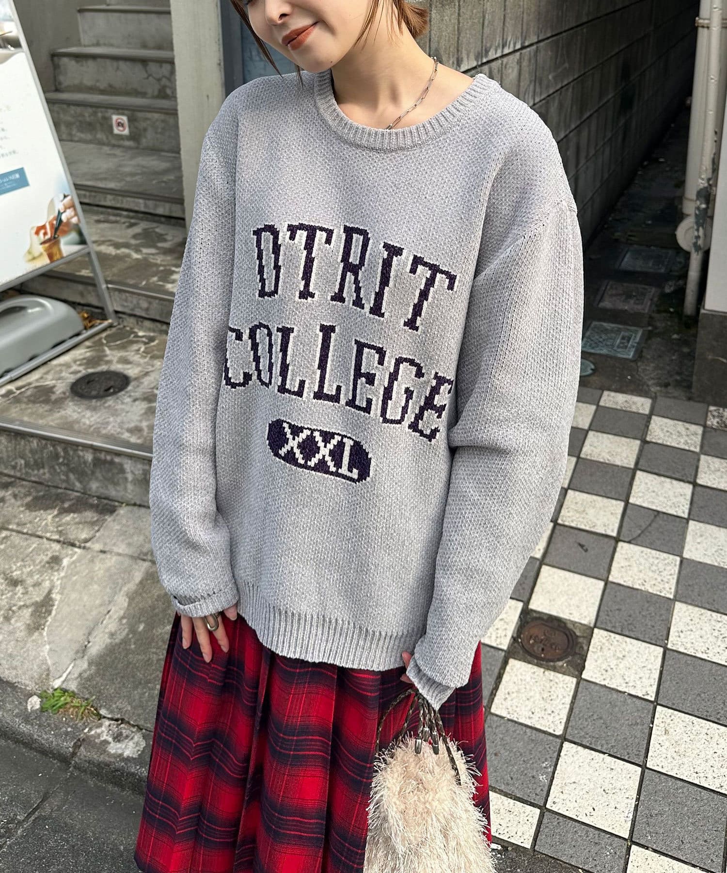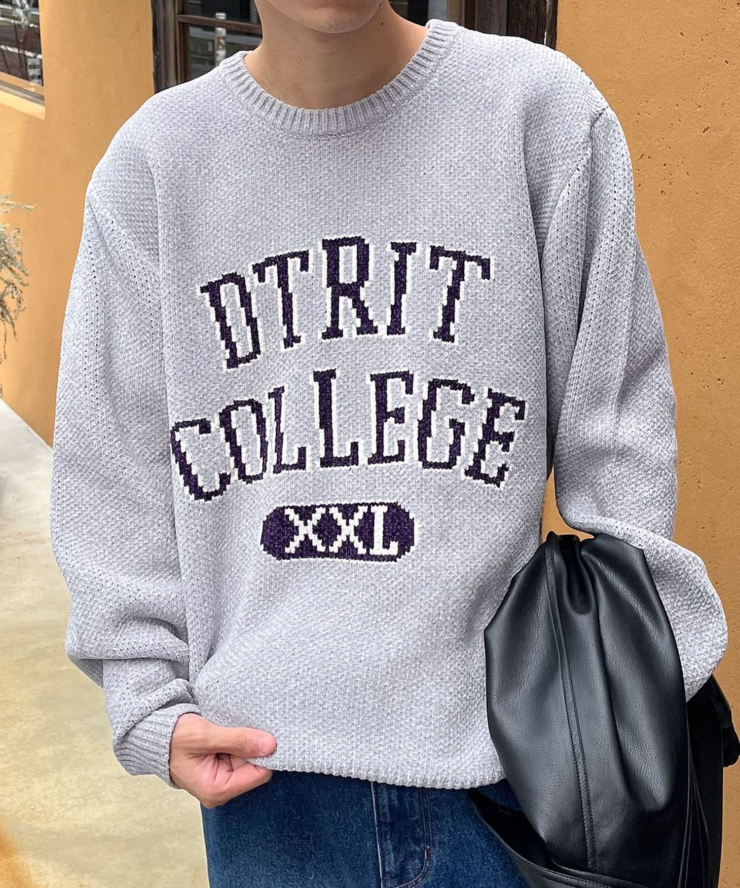 ヴィンテージ風のフロントロゴが目を惹く、カレッジ風ニット。