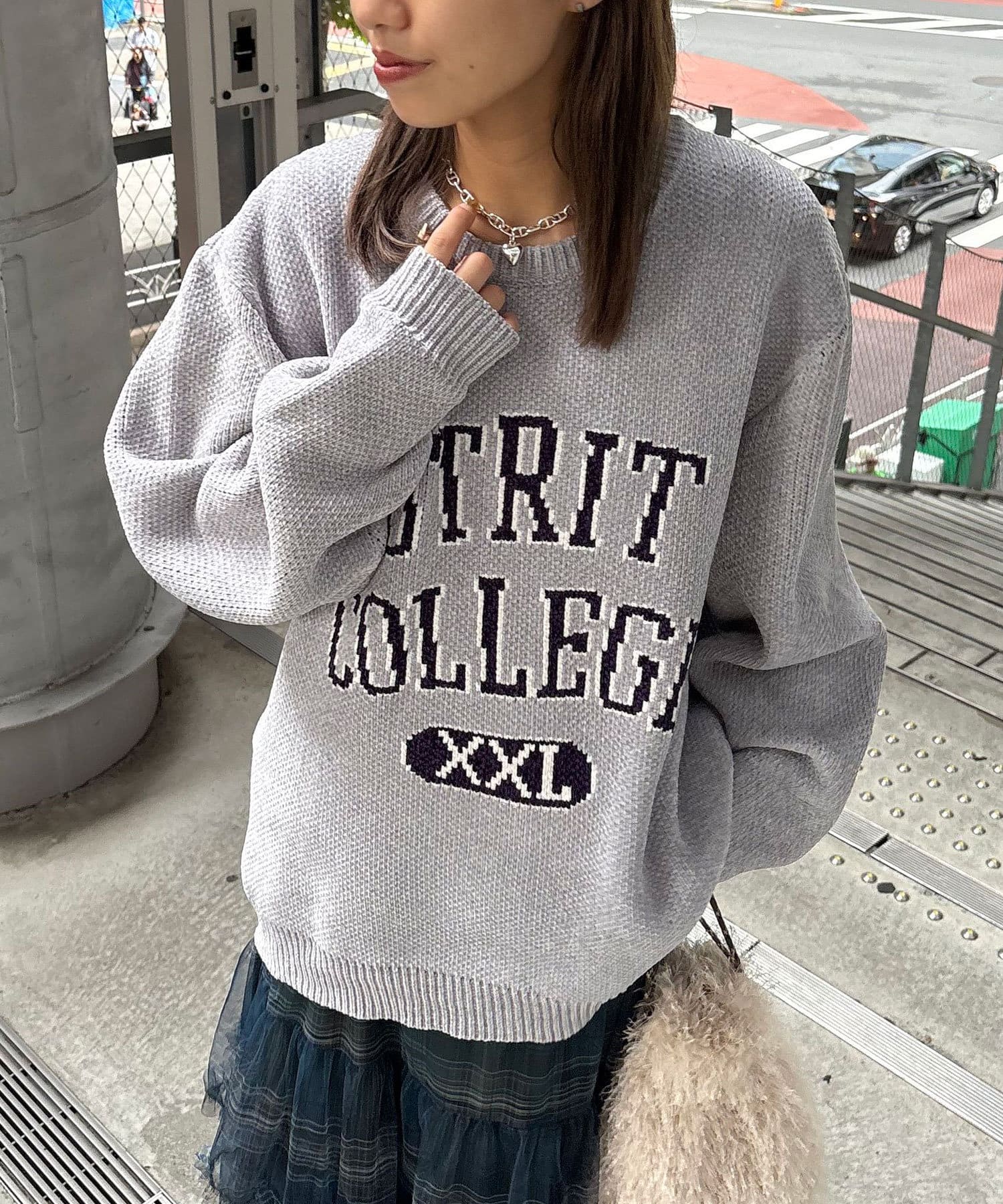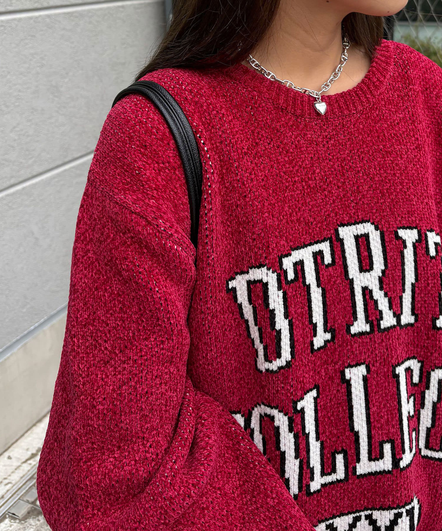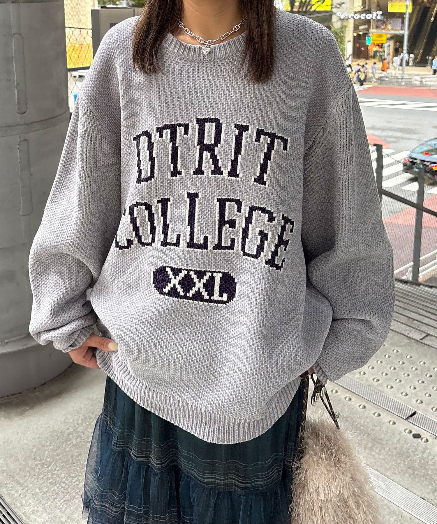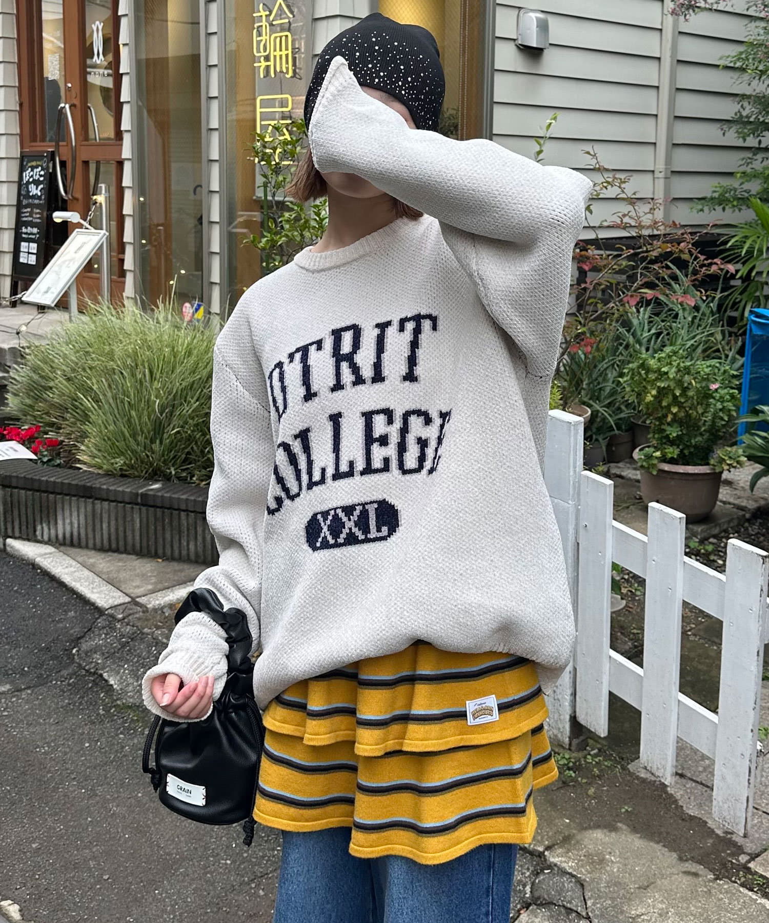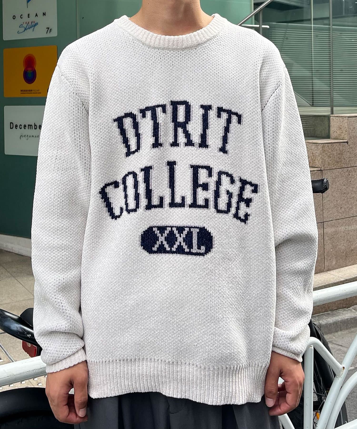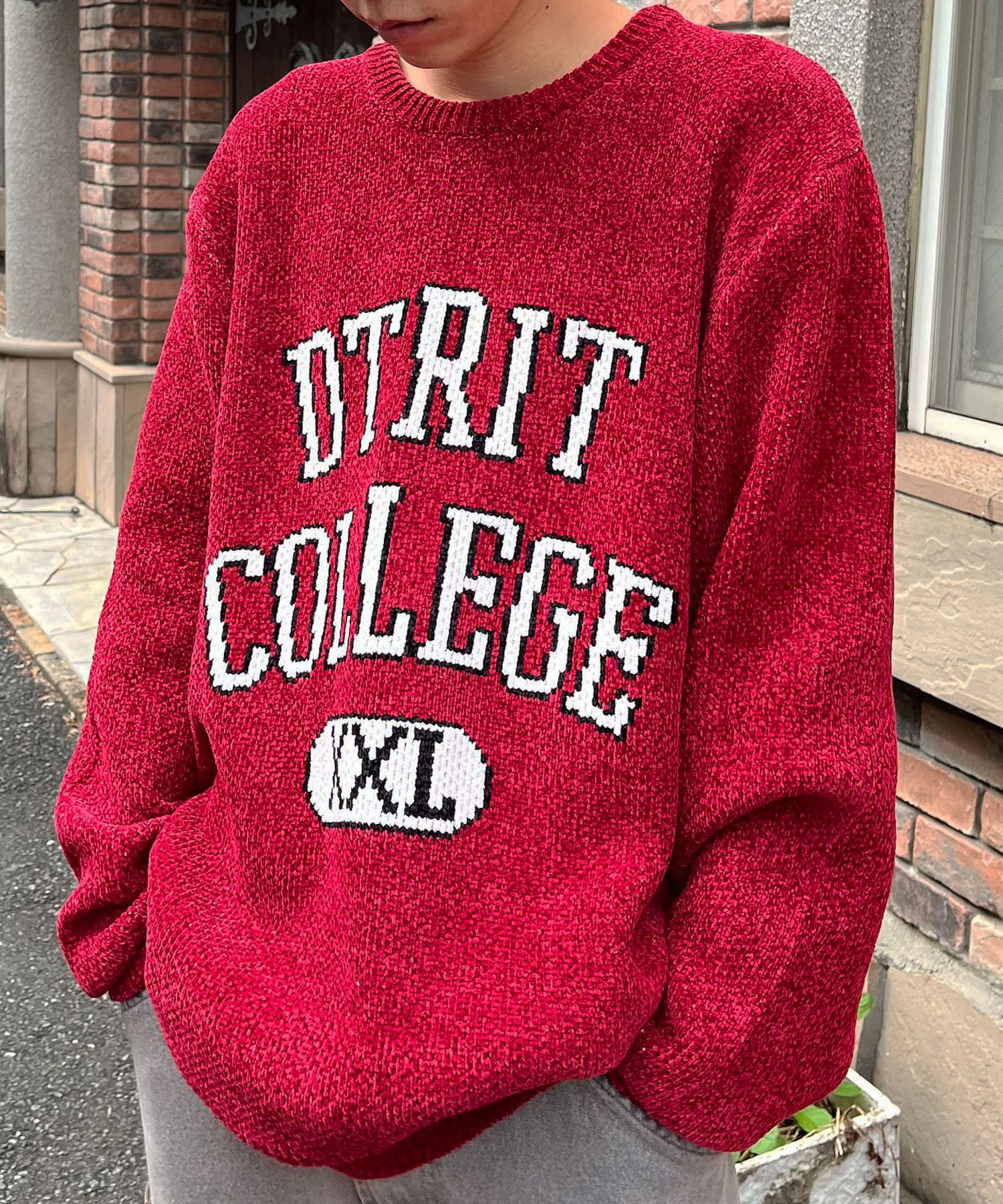 ヴィンテージ風のフロントロゴが目を惹く、カレッジ風ニット。