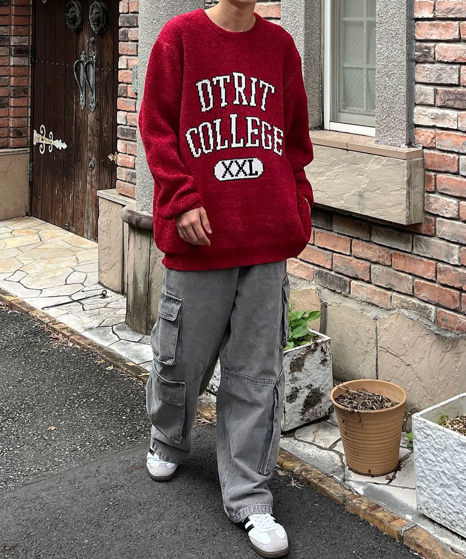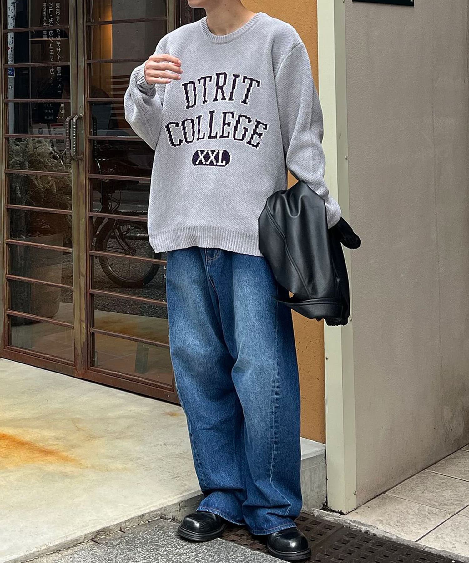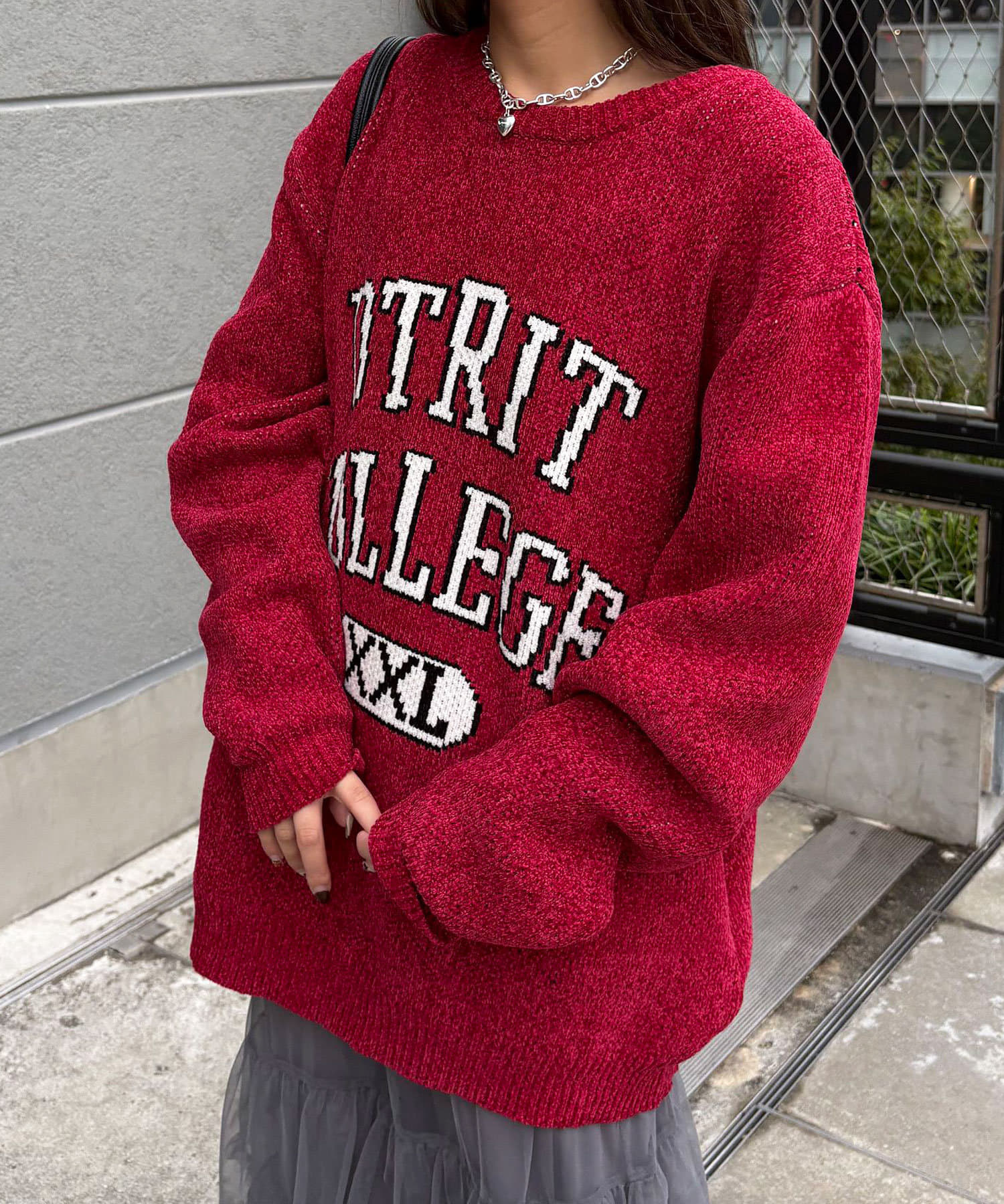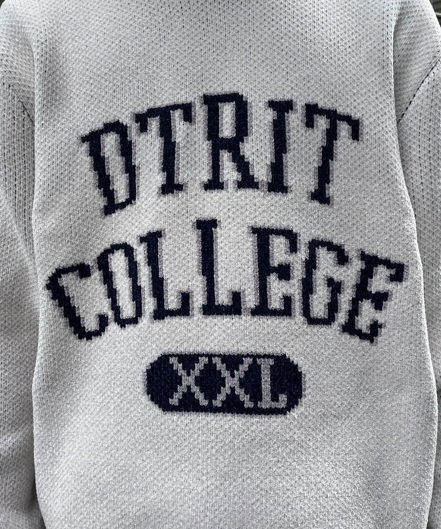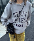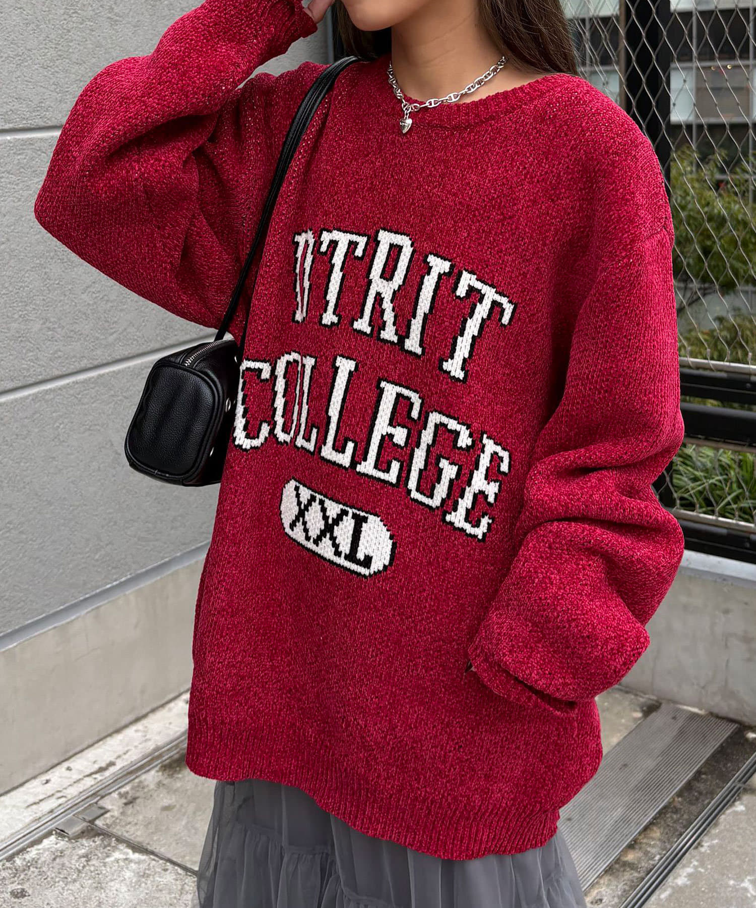 ヴィンテージ風のフロントロゴが目を惹く、カレッジ風ニット。