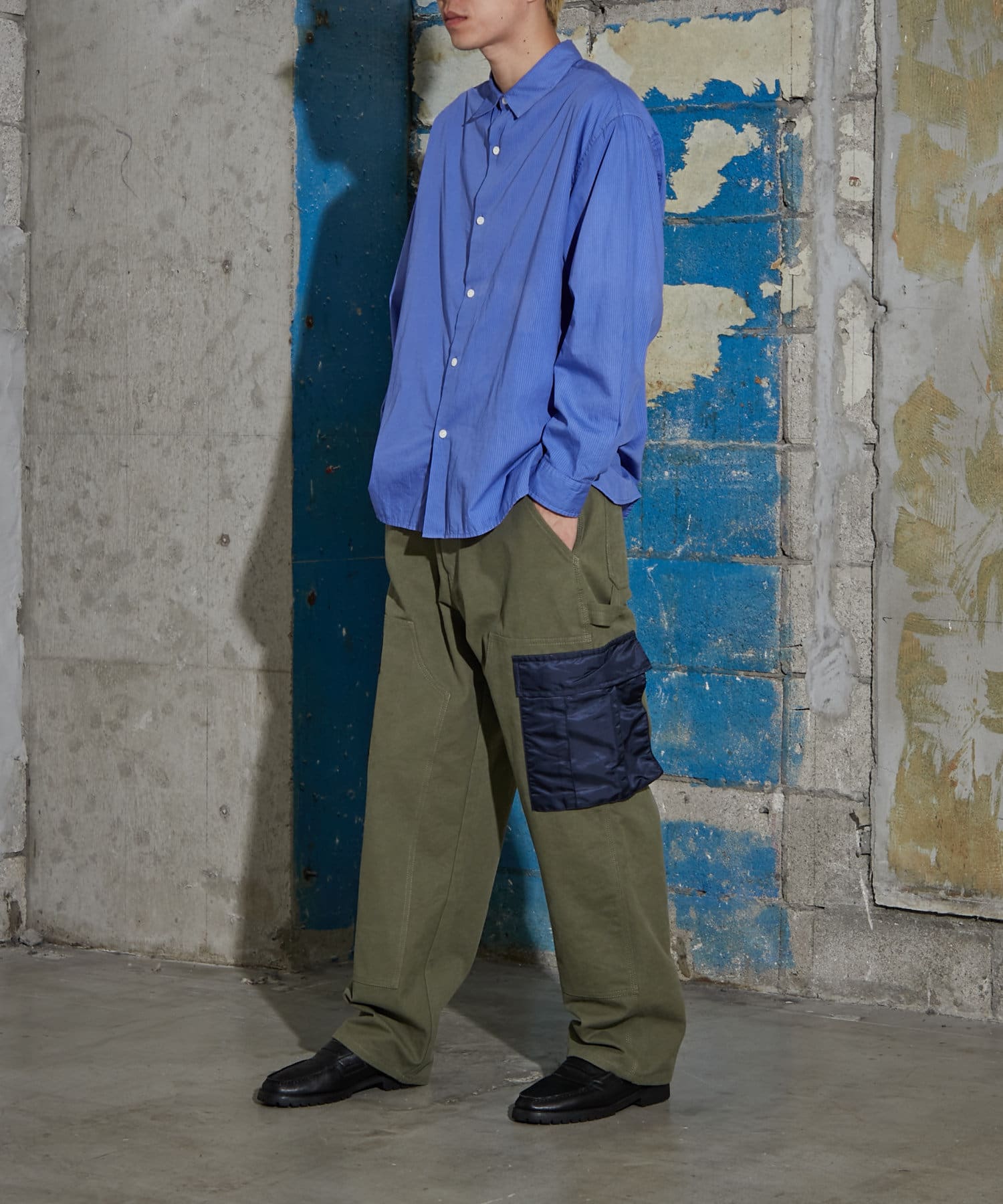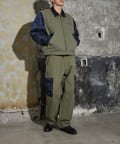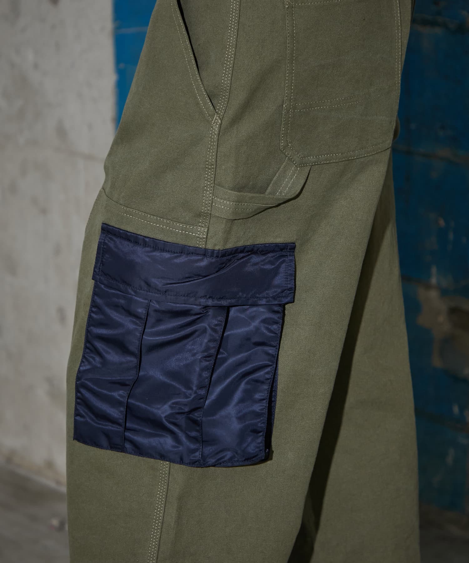 ハリのあるダック地と光沢感のあるナイロンツイルを使用したダブルニーカーゴパンツ。