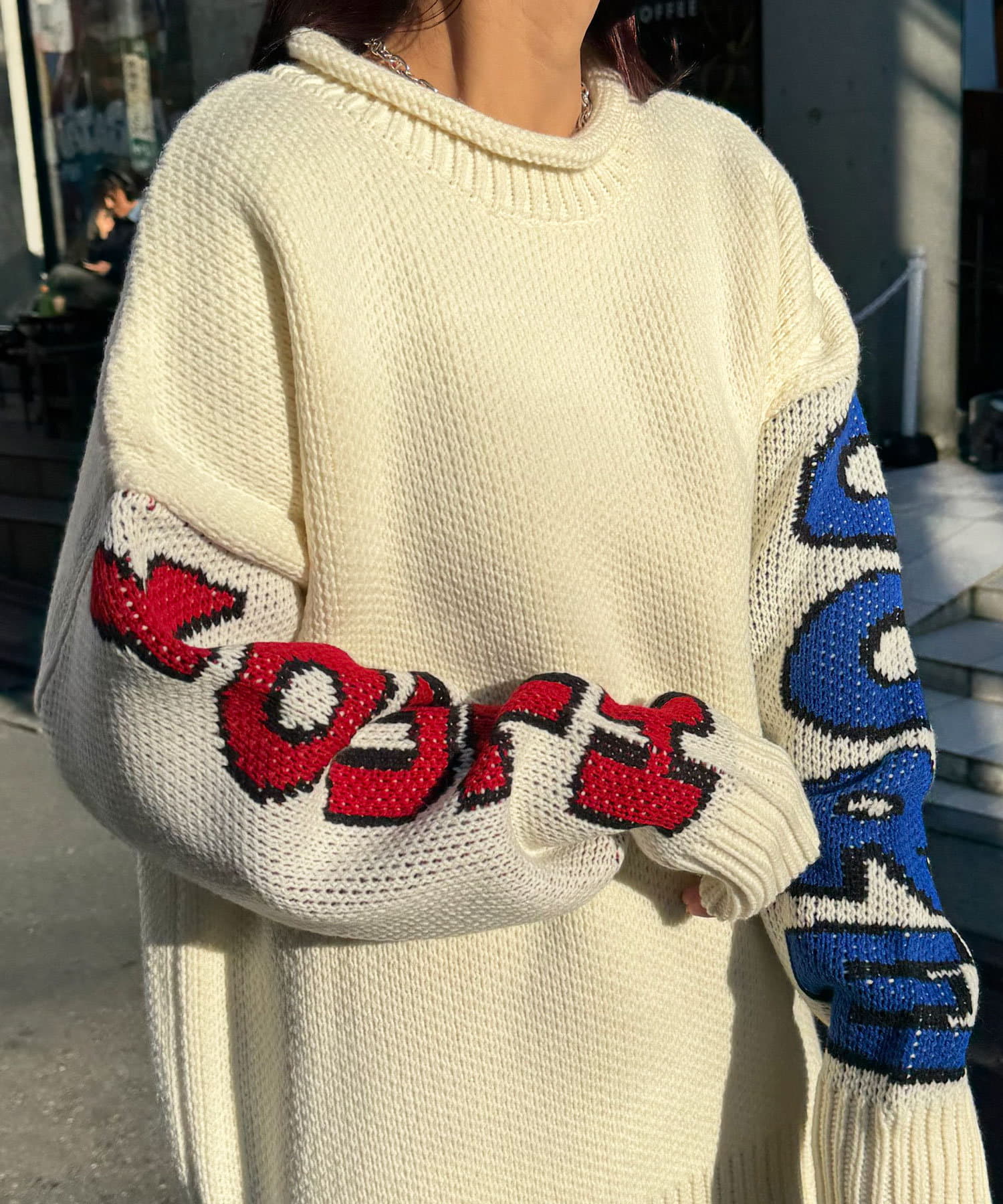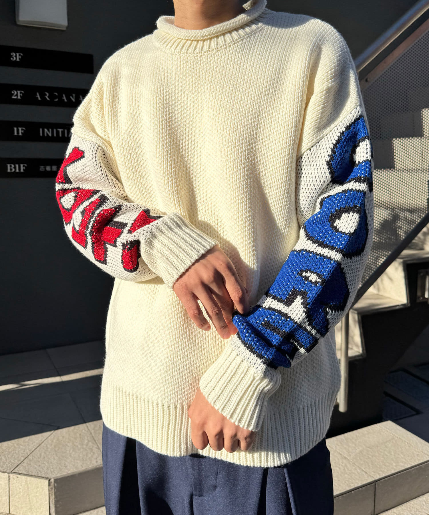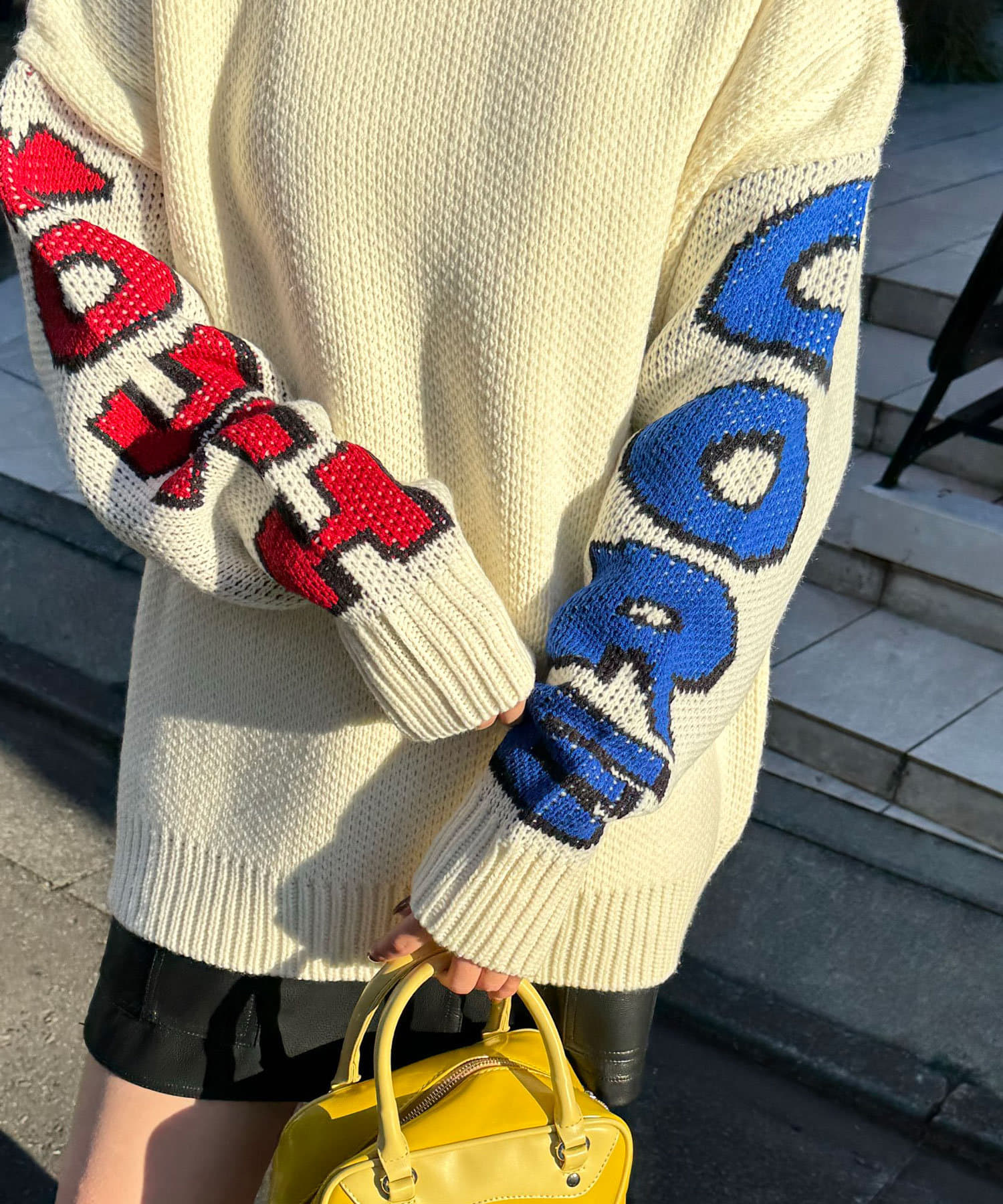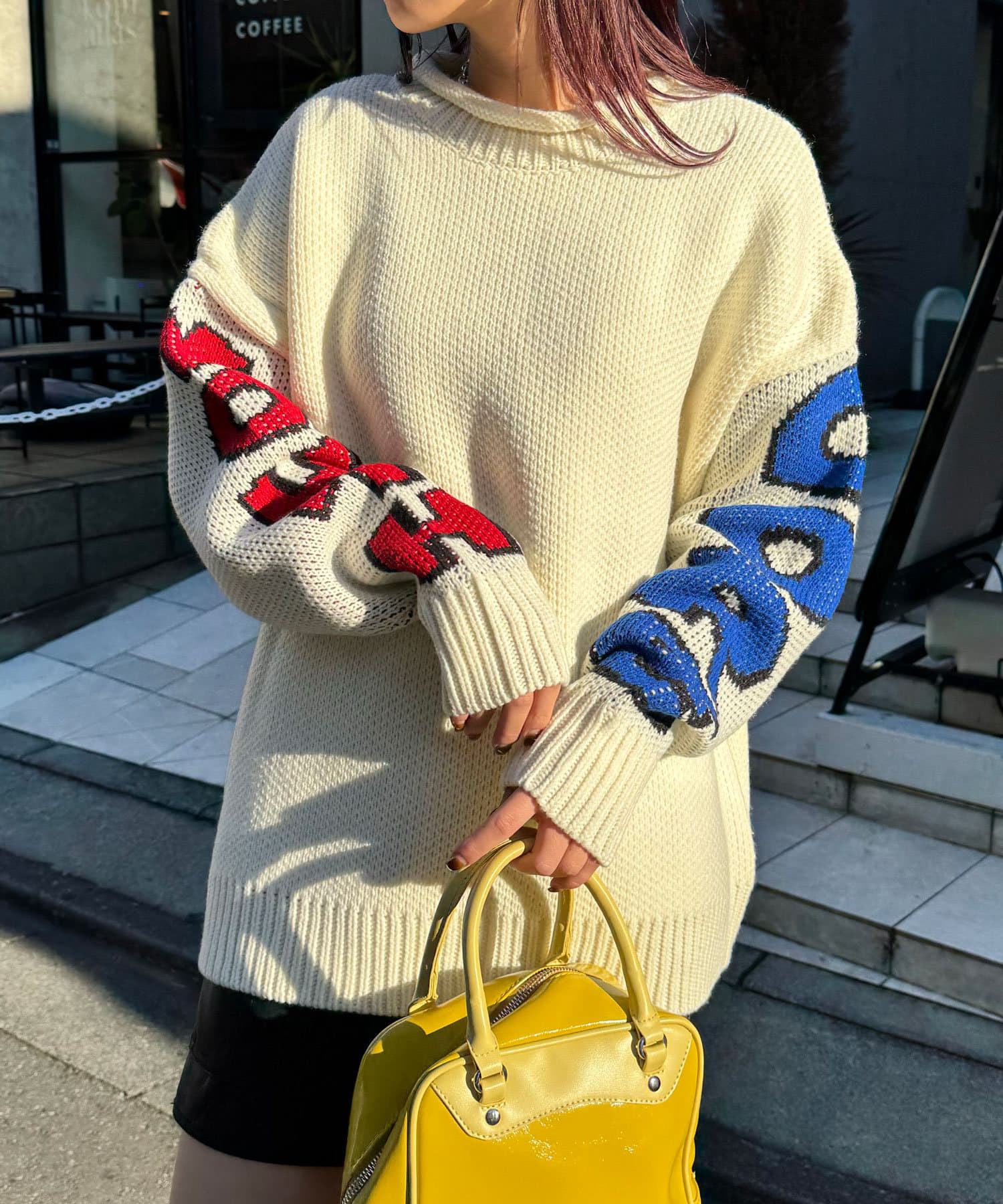 カラフルでポップな袖デザインが目を引くニットプルオーバー。