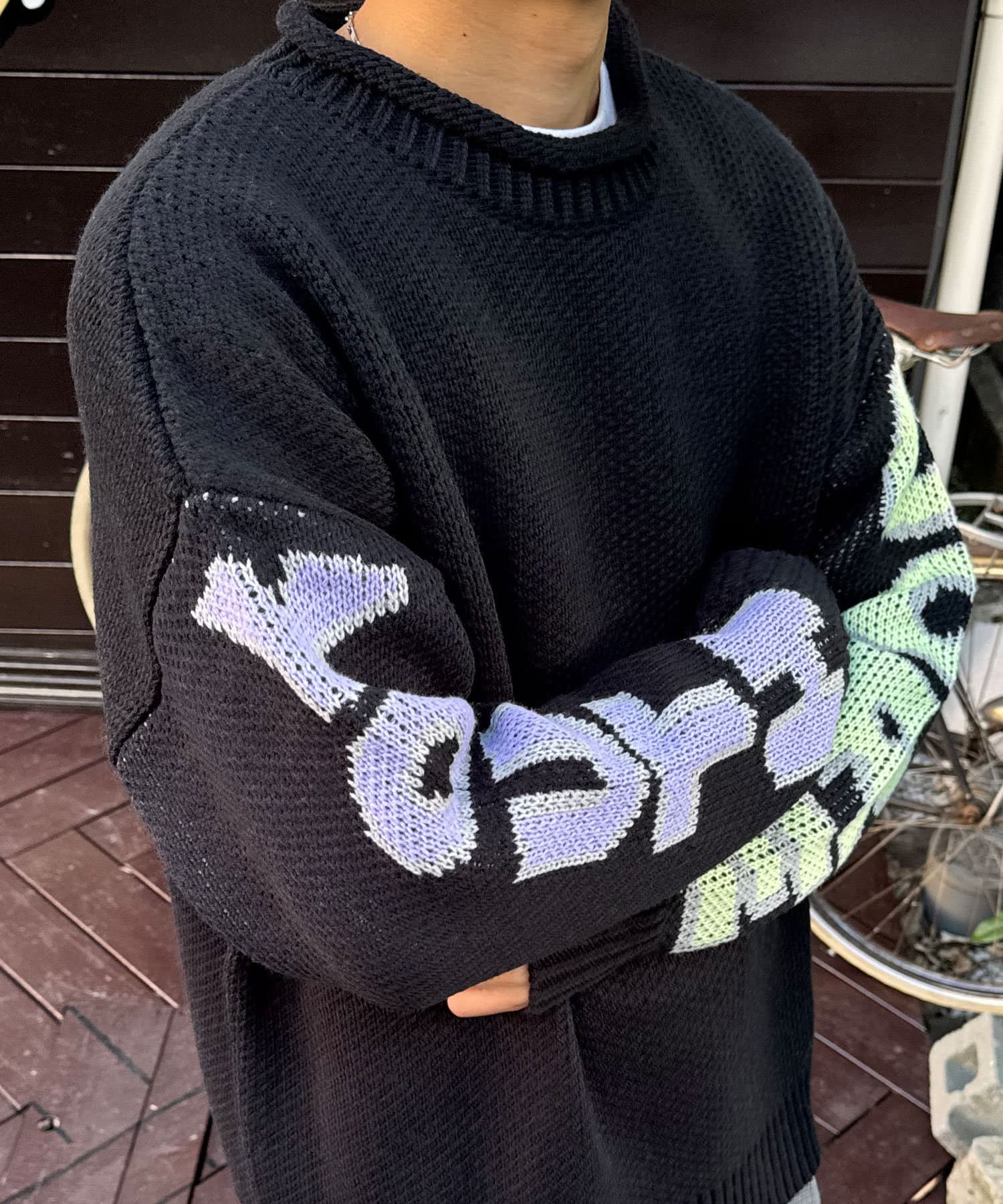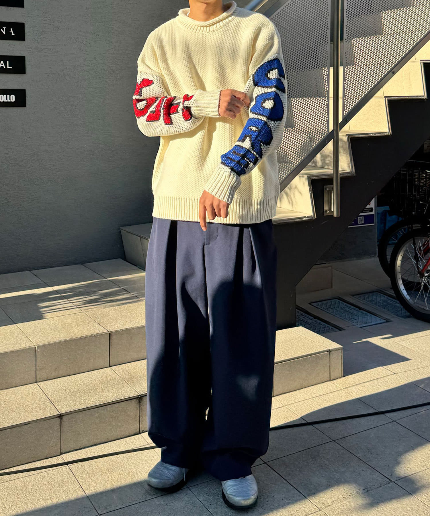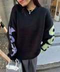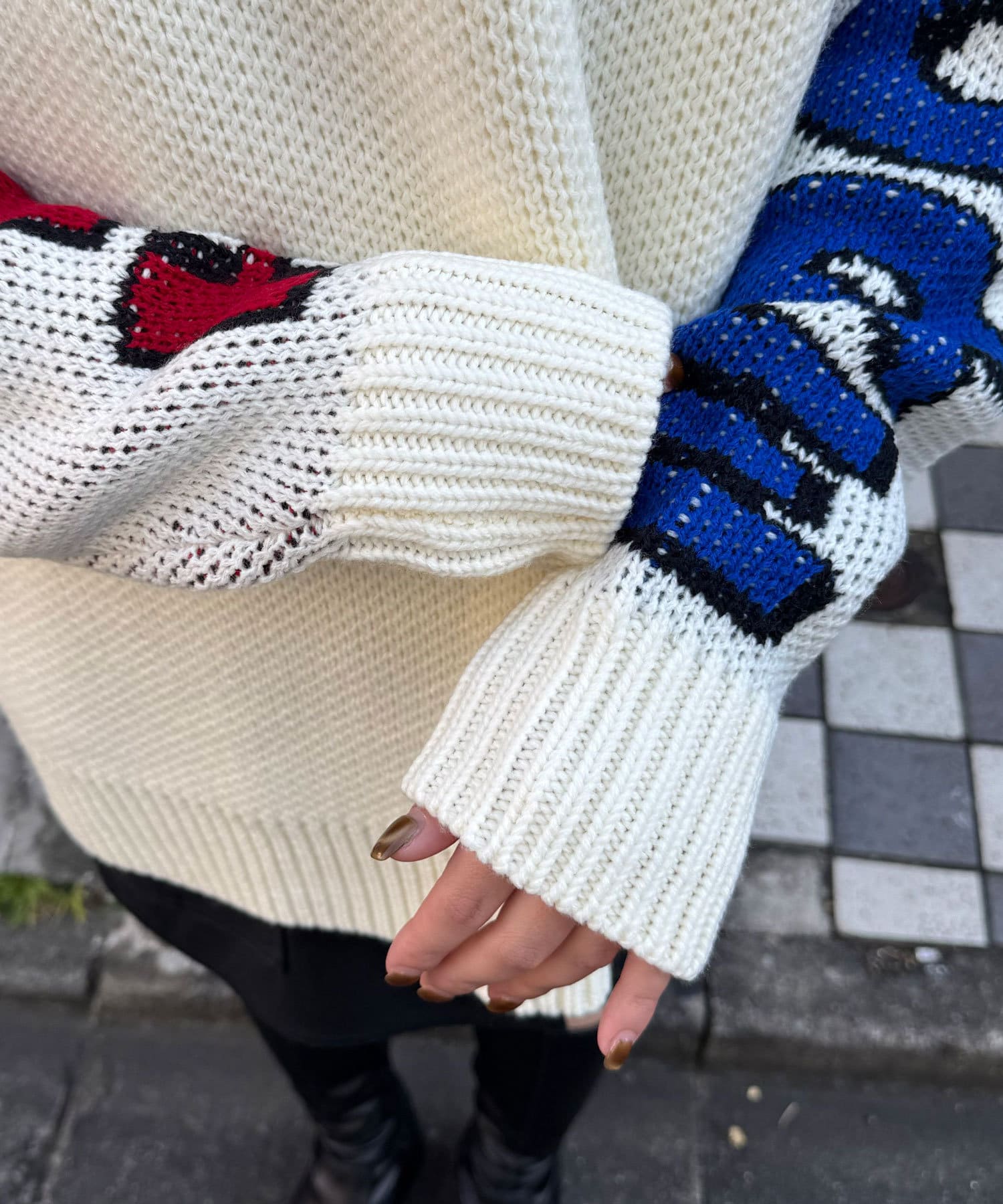 カラフルでポップな袖デザインが目を引くニットプルオーバー。