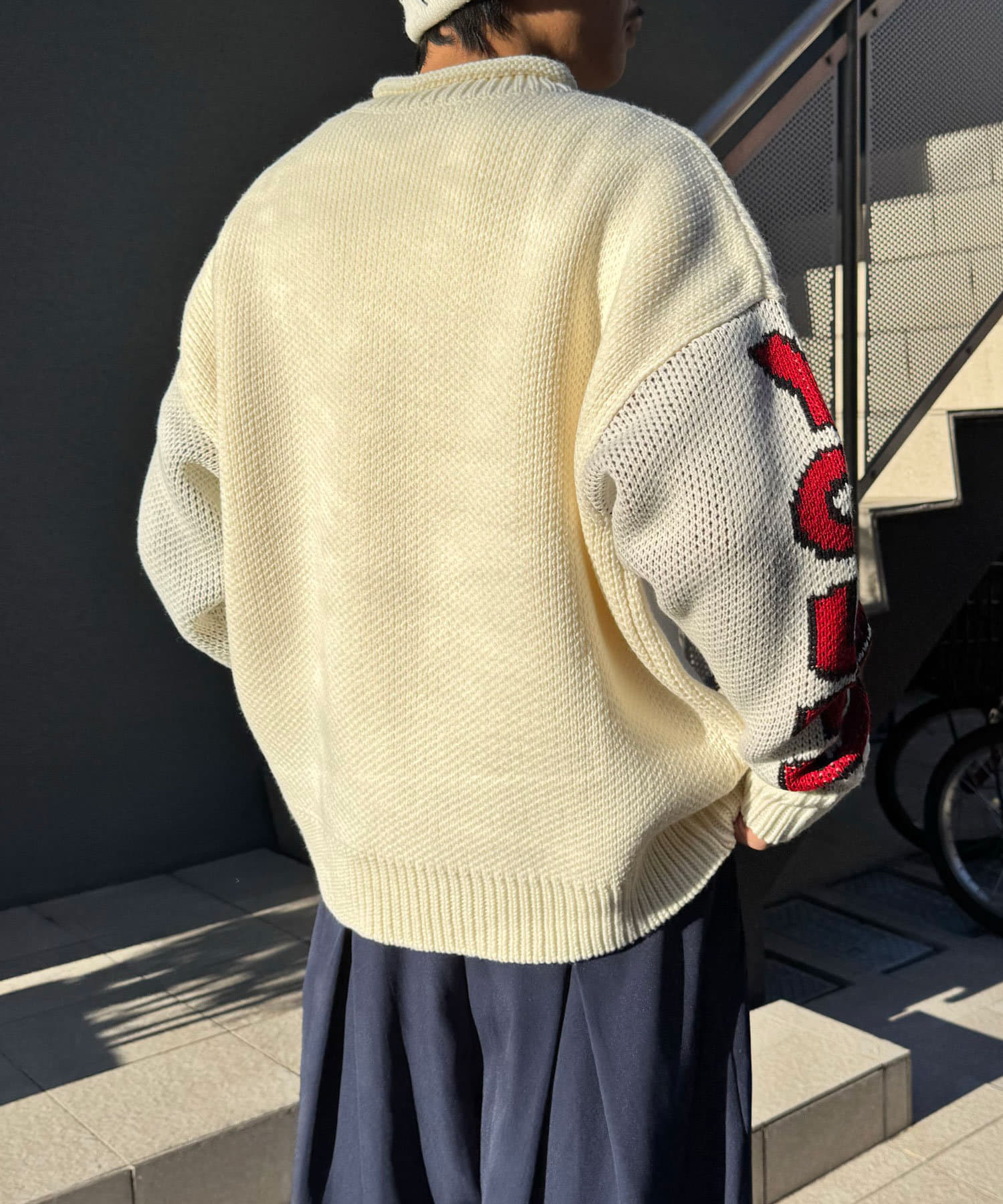 手編み風のローゲージと抜け感のあるロールネック仕様で、デザイン性と防寒を兼ね備えた冬に活躍するアイテムです。
