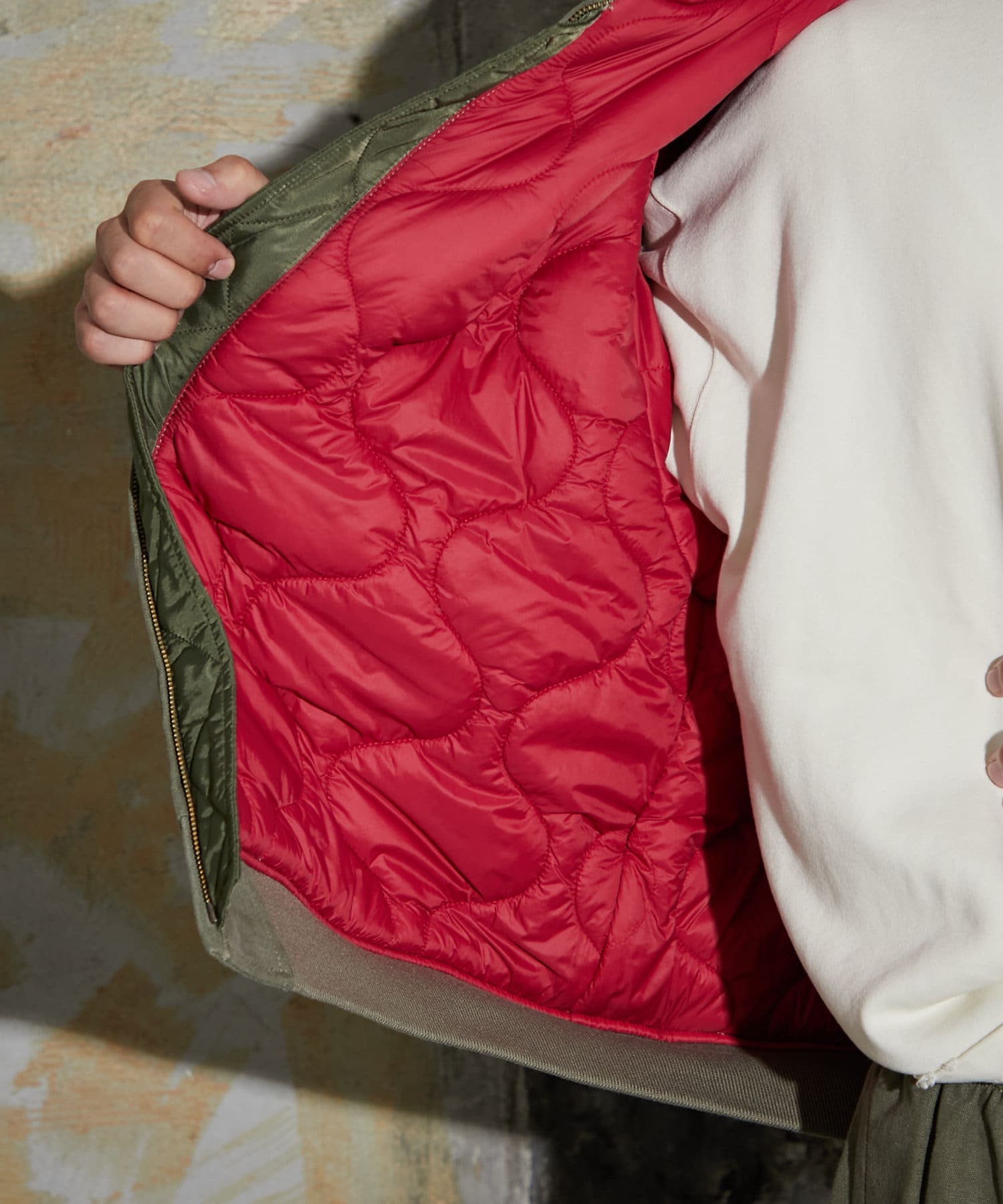 色鮮やかな赤色のキルティング裏地を採用し、暖かさとファッション性を両立させた一着に。