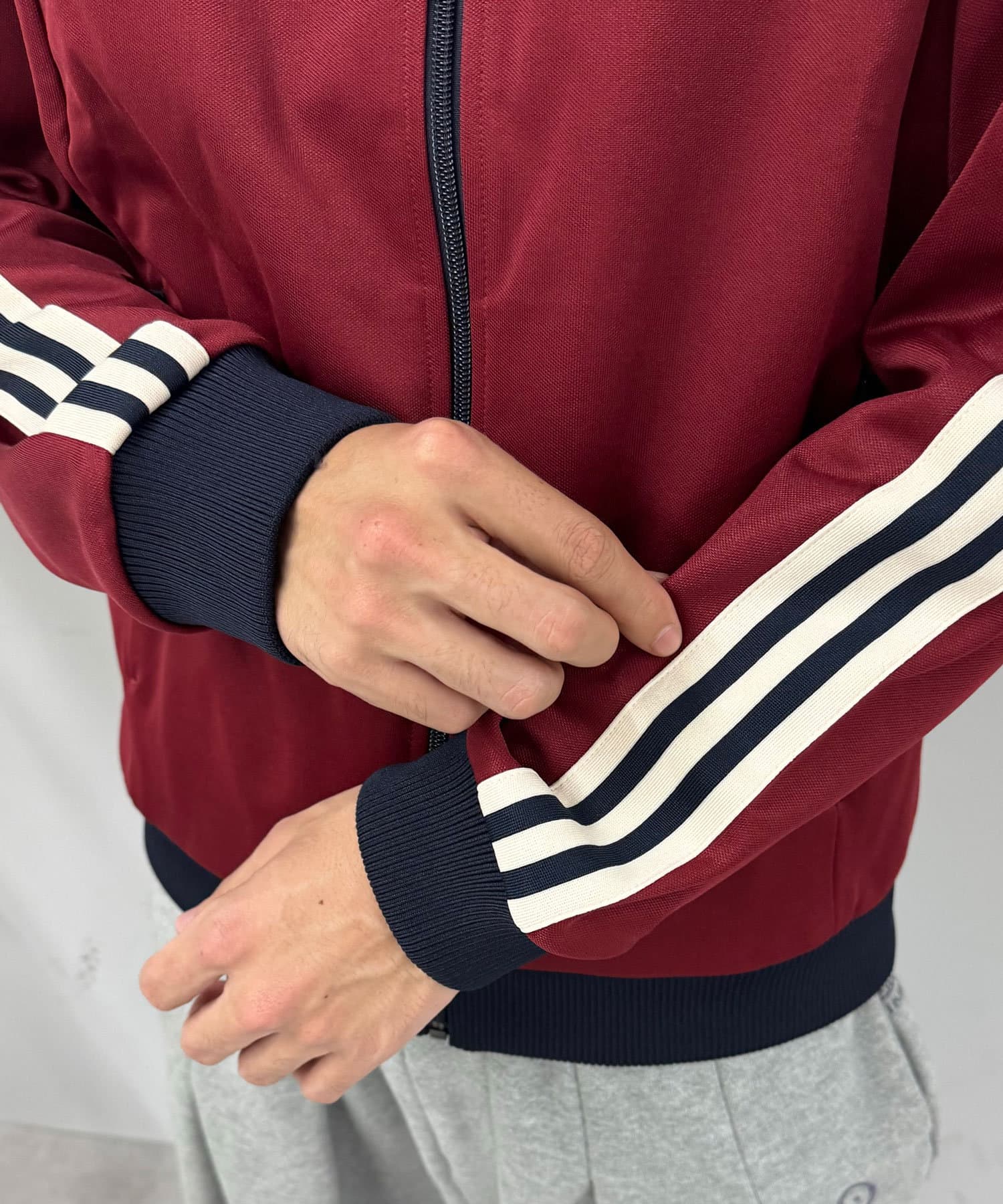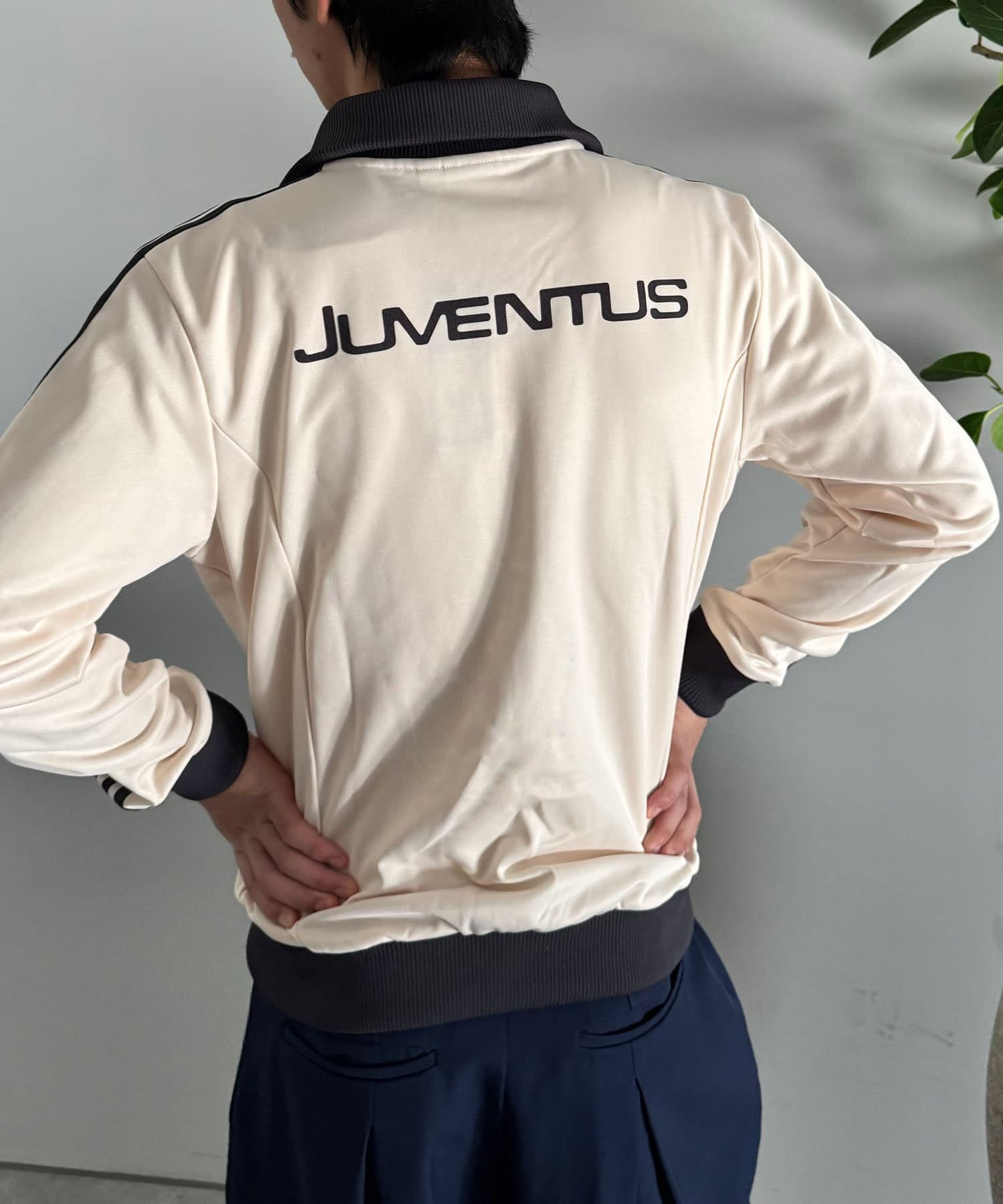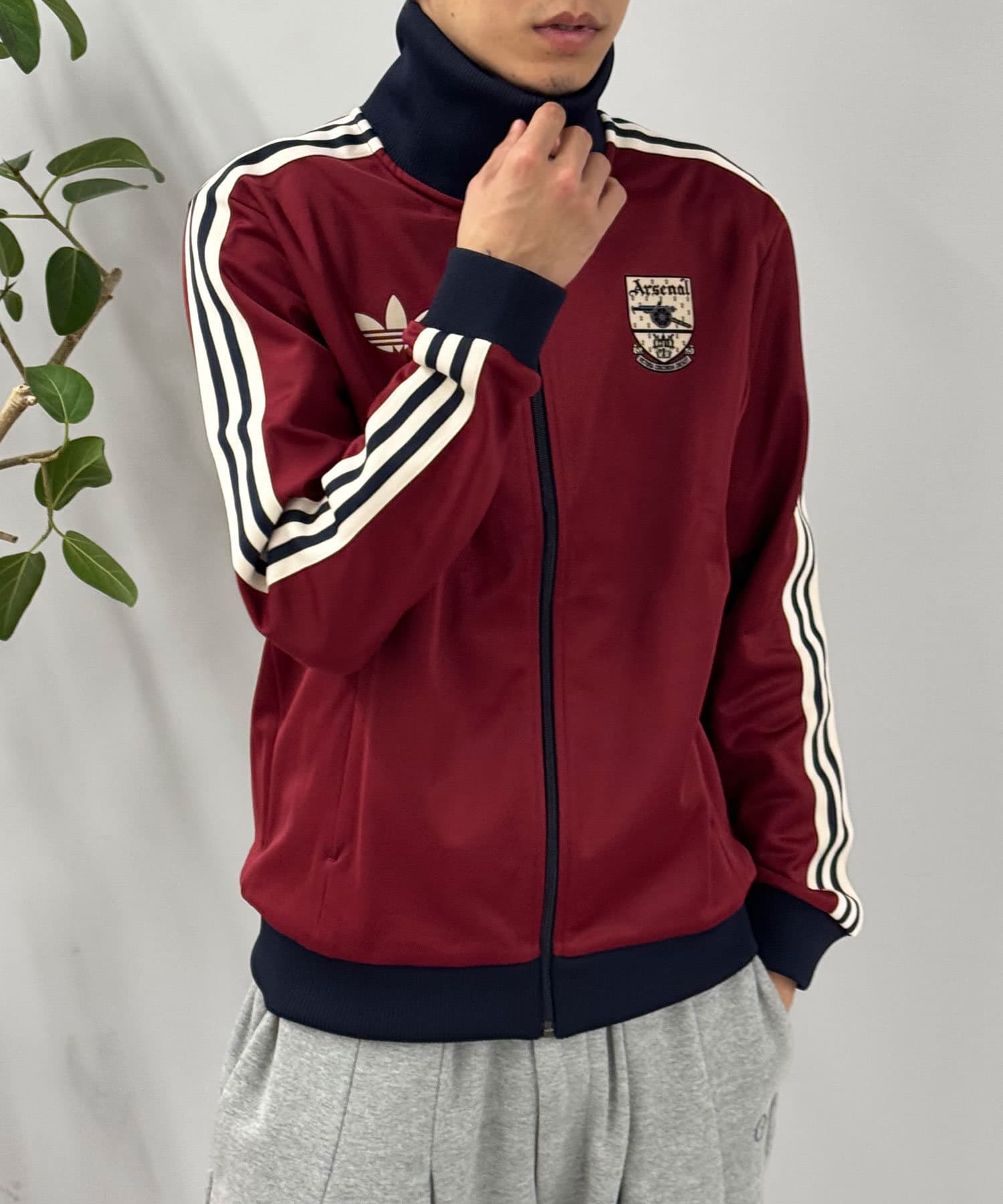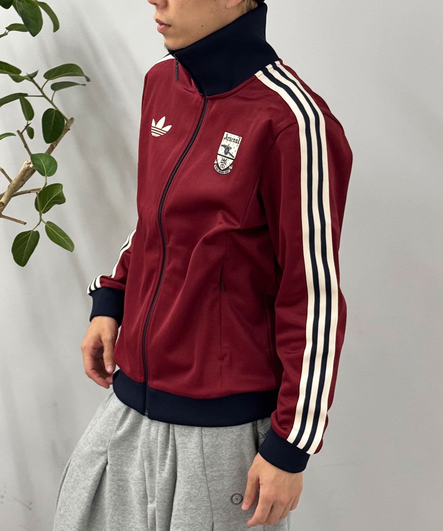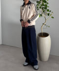 トラックジャケットを軽く羽織り、中には白Tシャツを合わせるだけで抜け感のあるスタイルに。