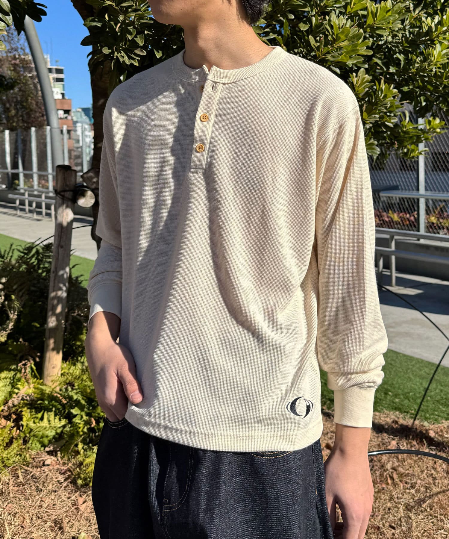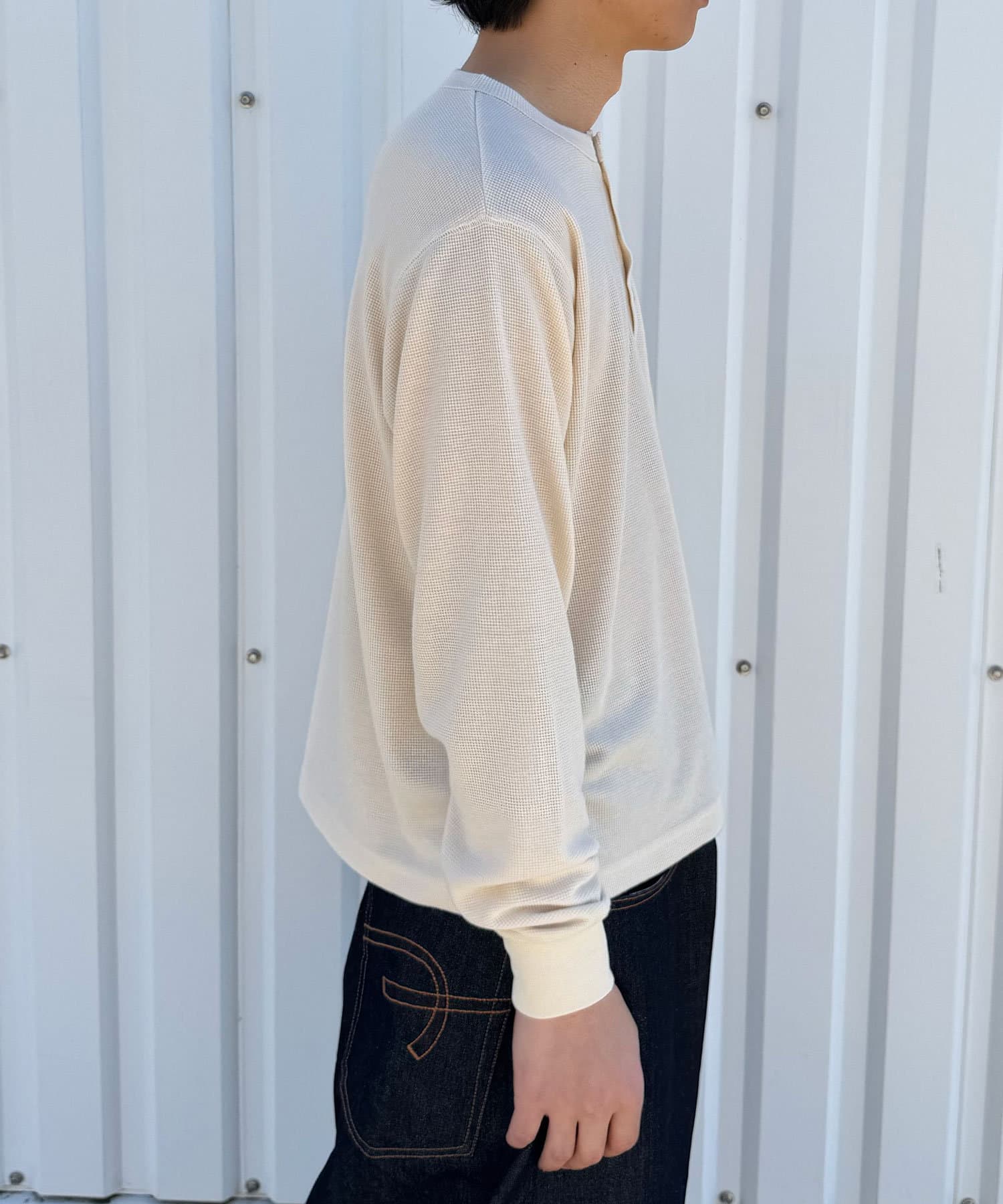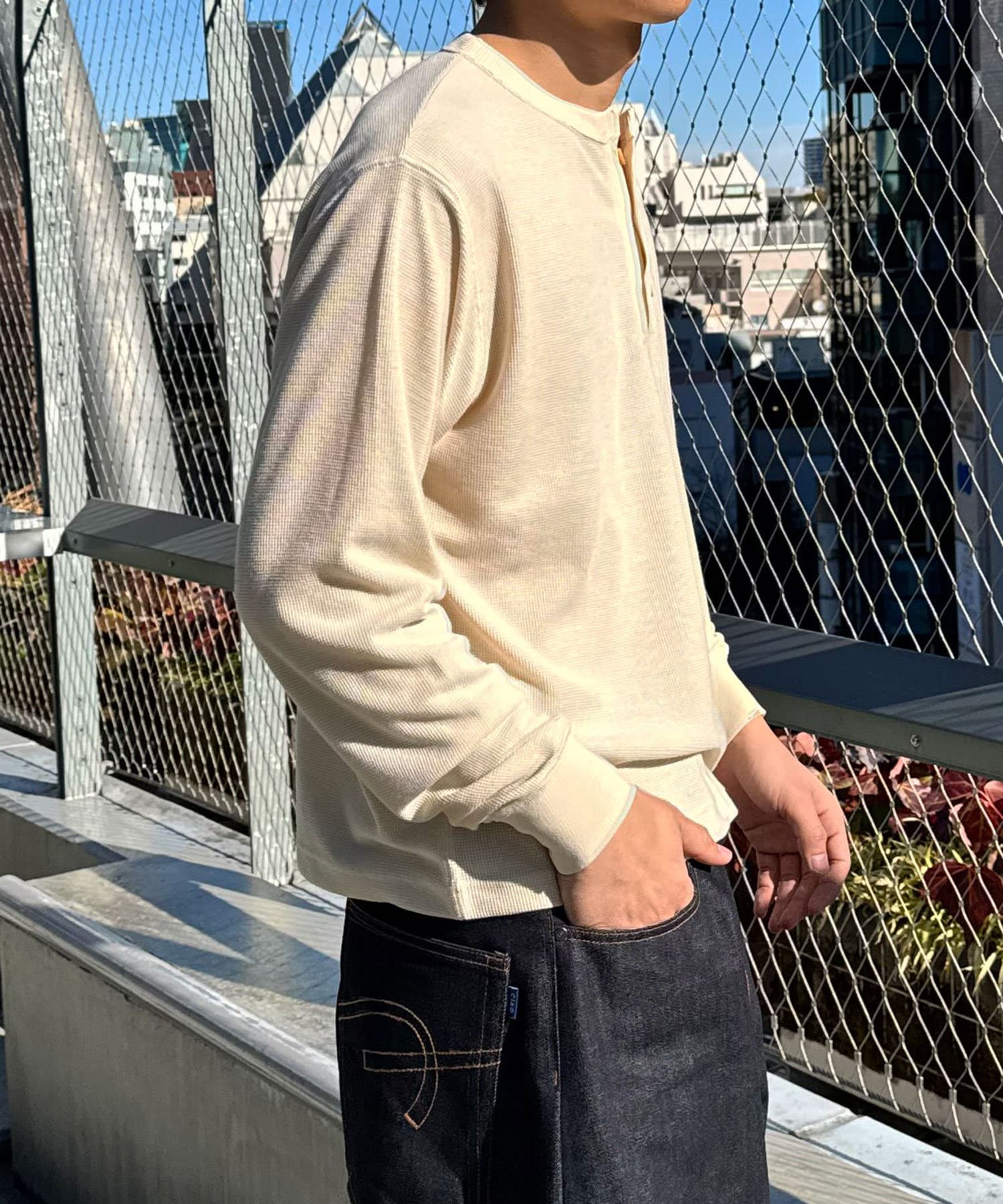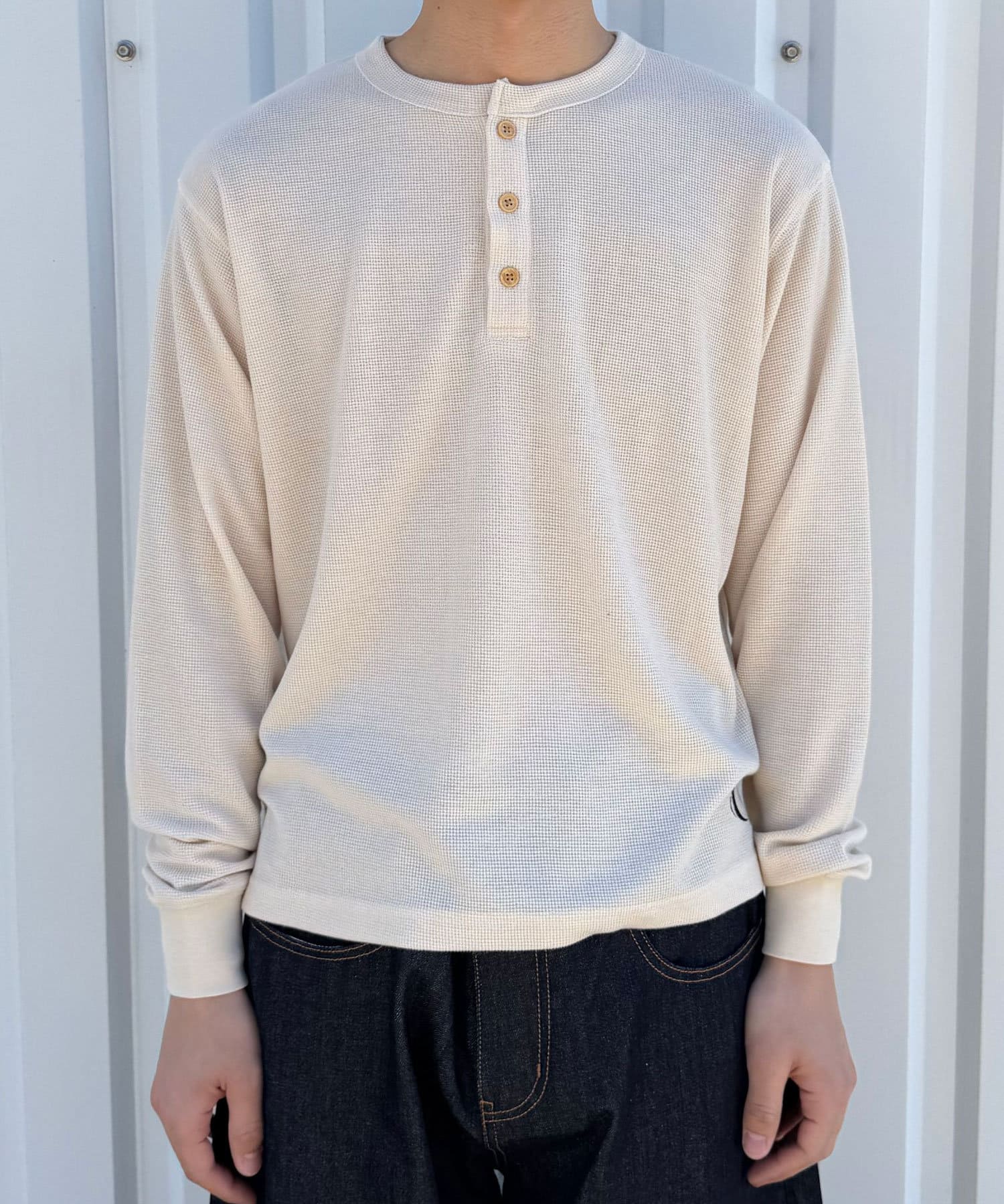 短丈デザインが特徴のヘンリーネックサーマルロンTEE。