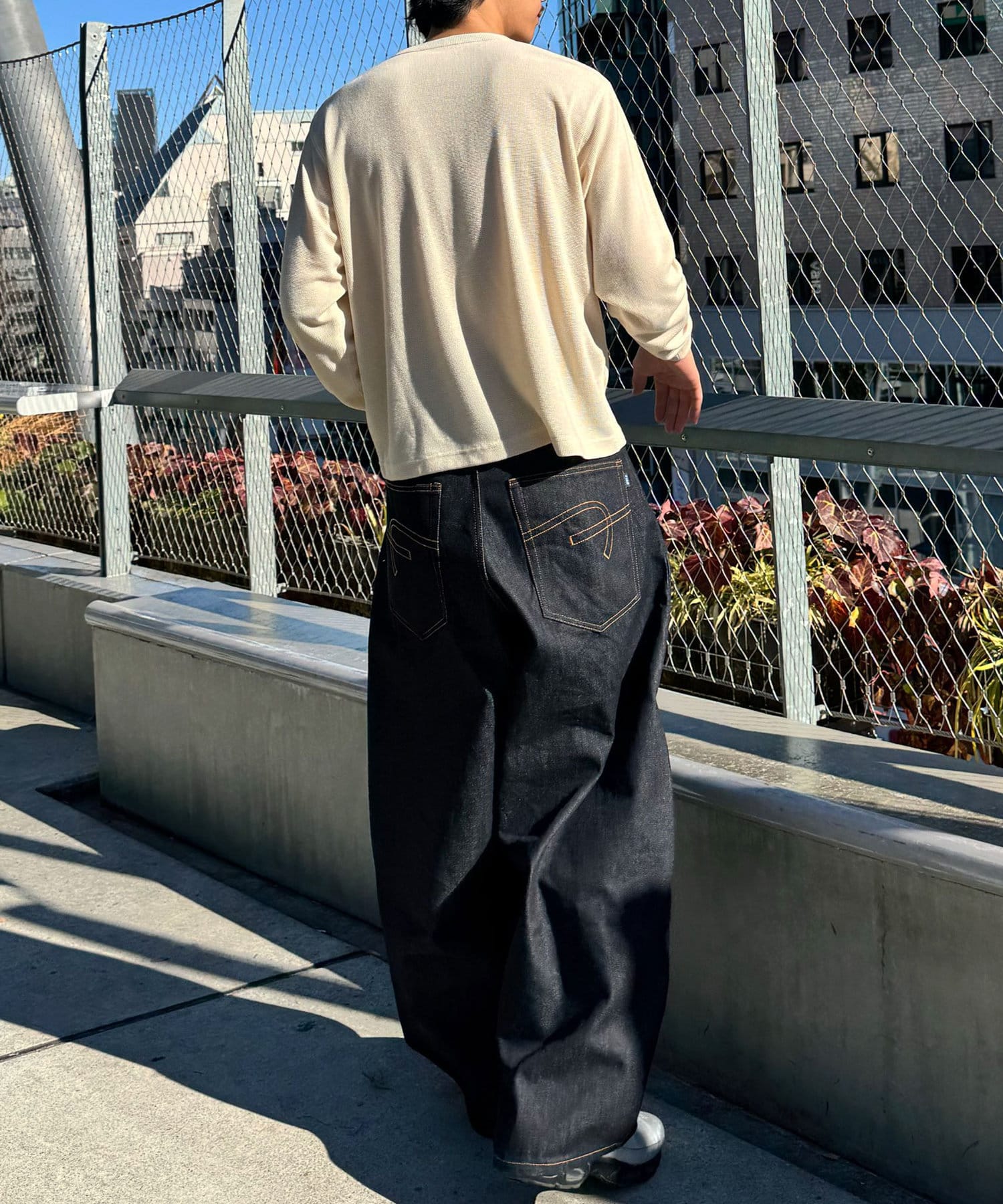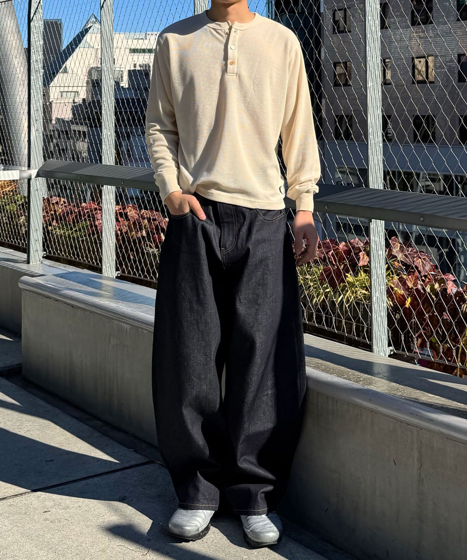 ワイドなデニムやスラックスと合わせてラフでこなれたミニマルなコーデの完成。