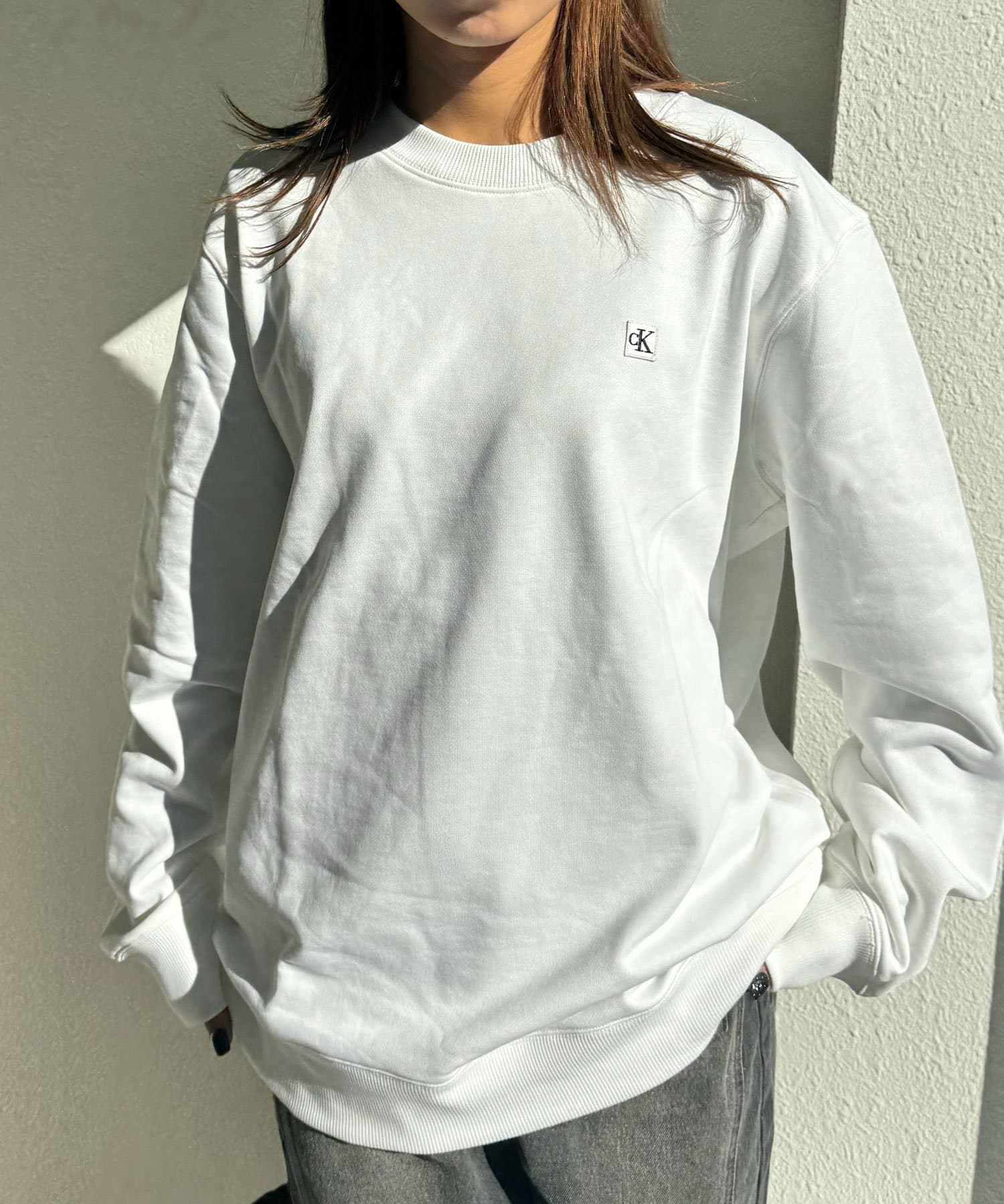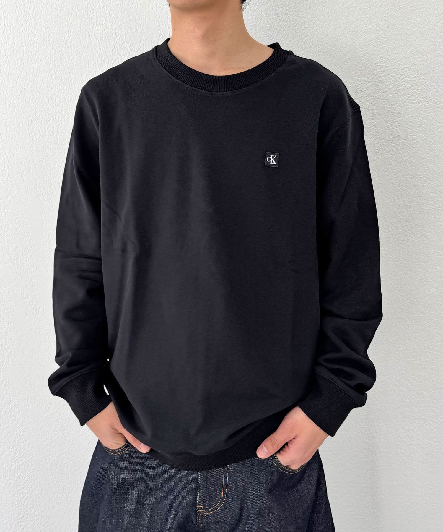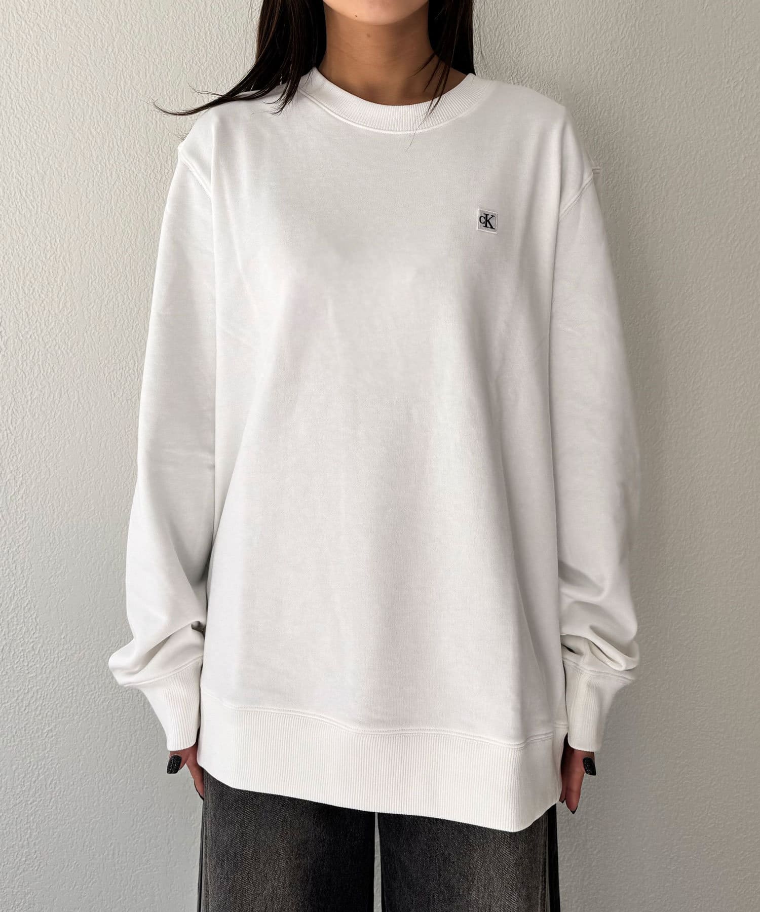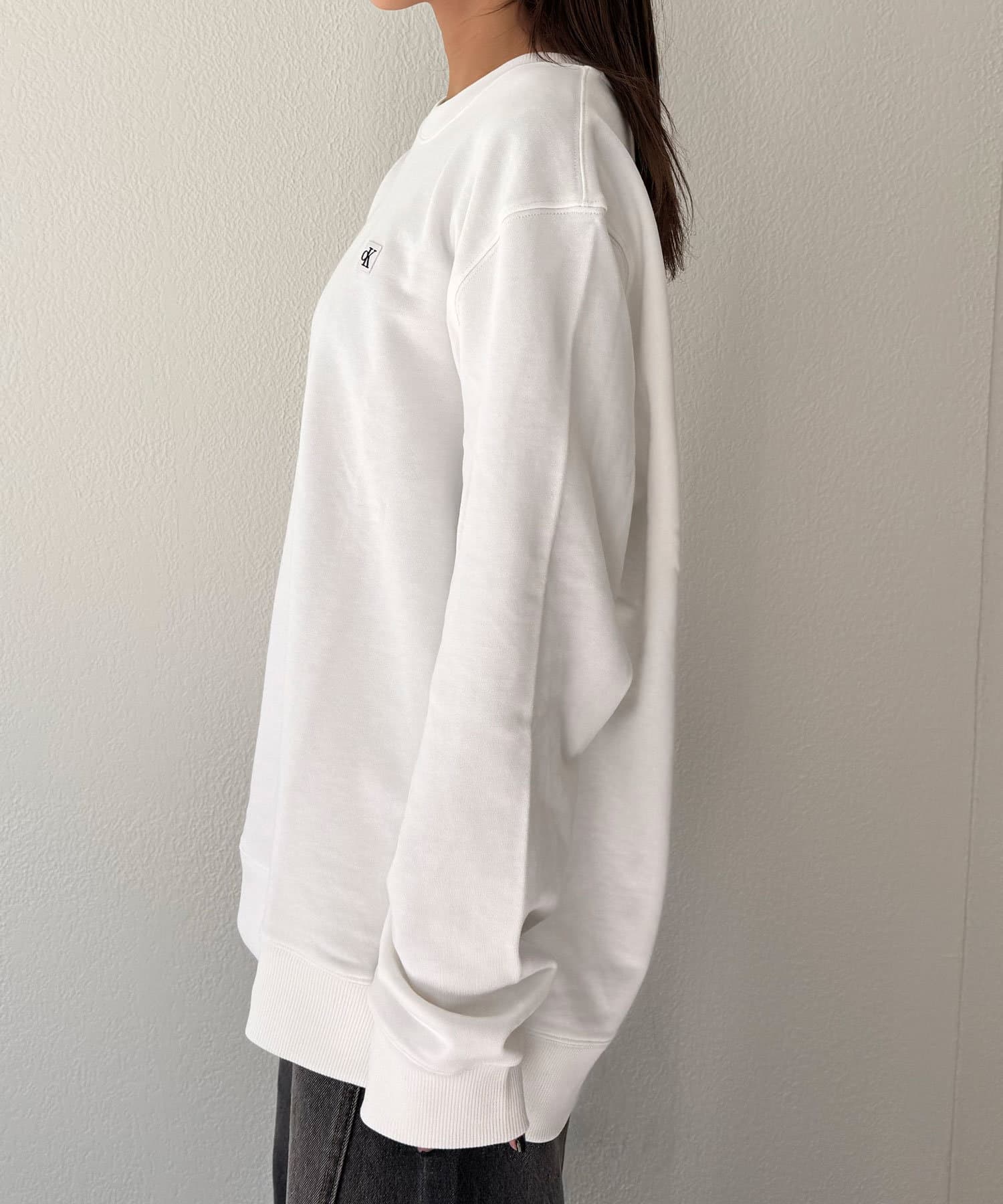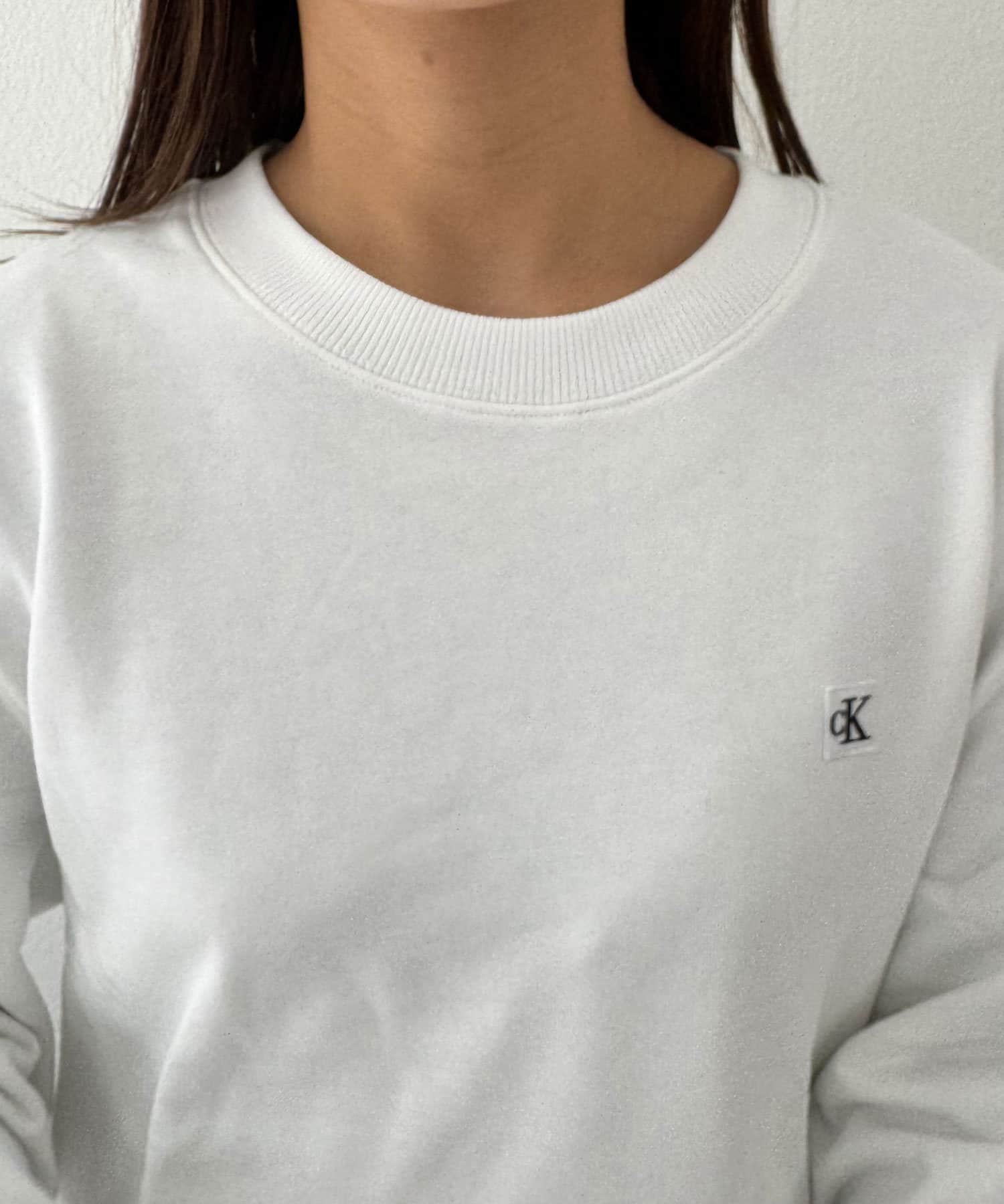 CKバッジを左胸に飾ったクルーネックトレーナー。