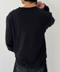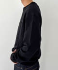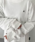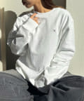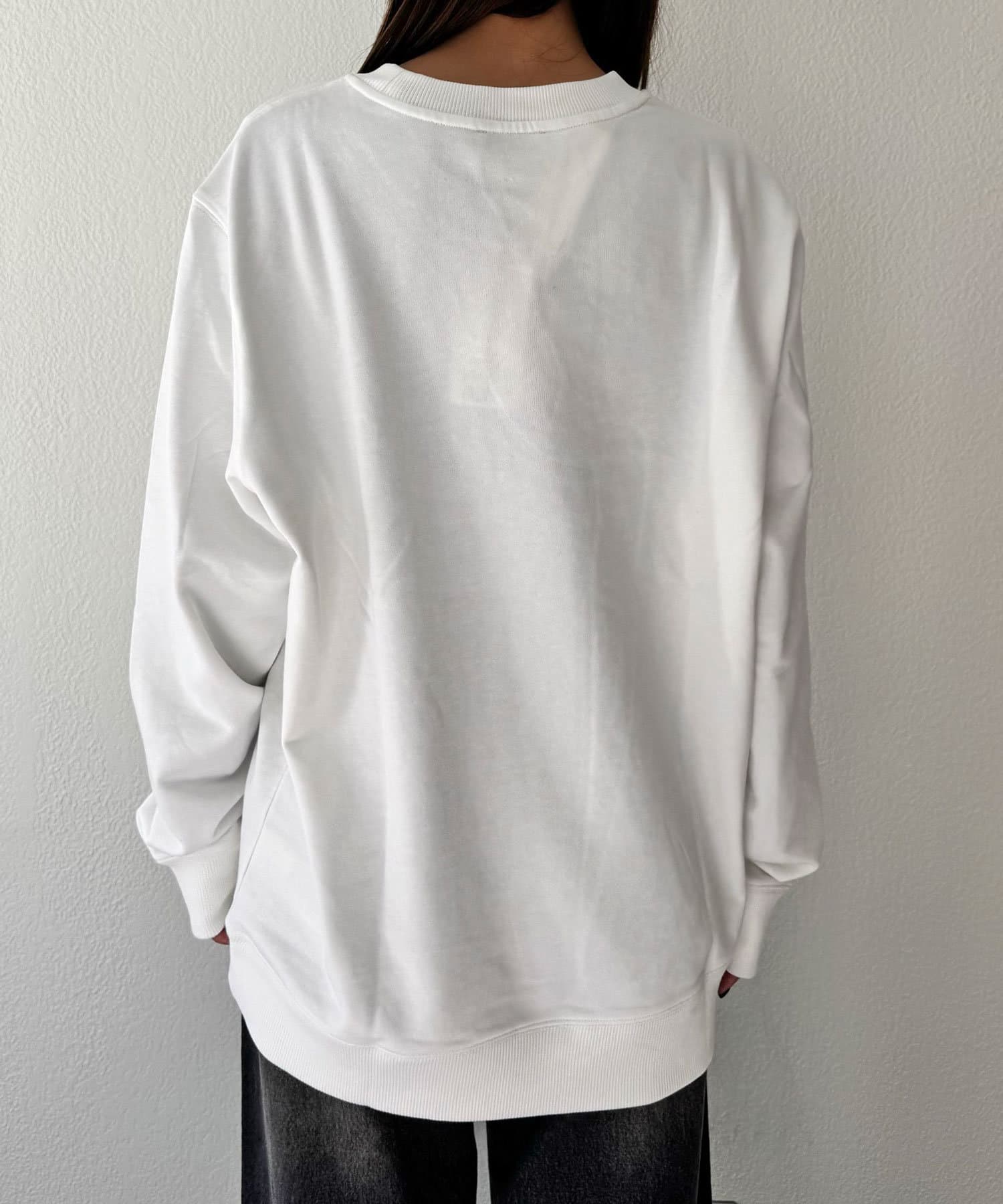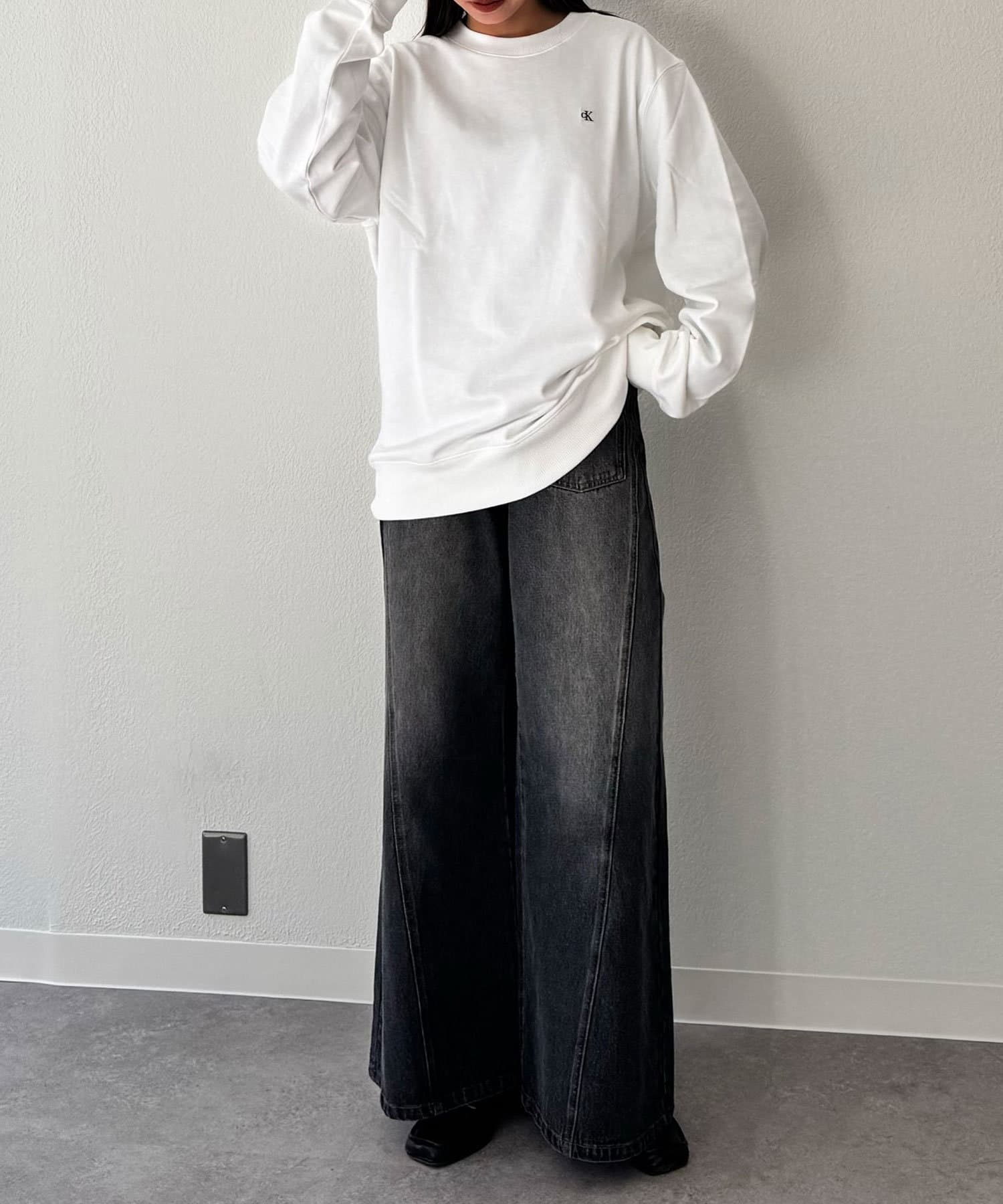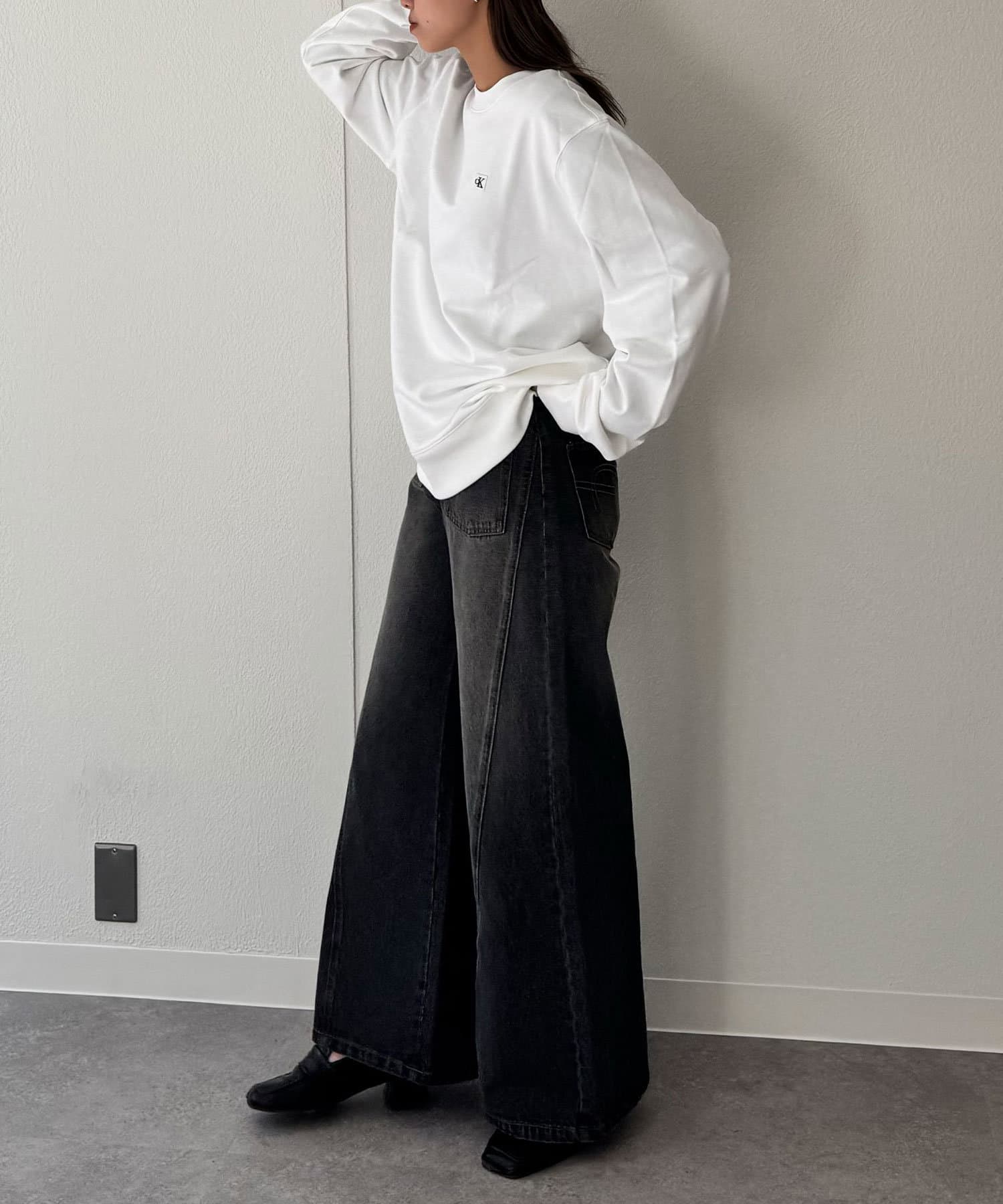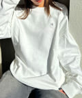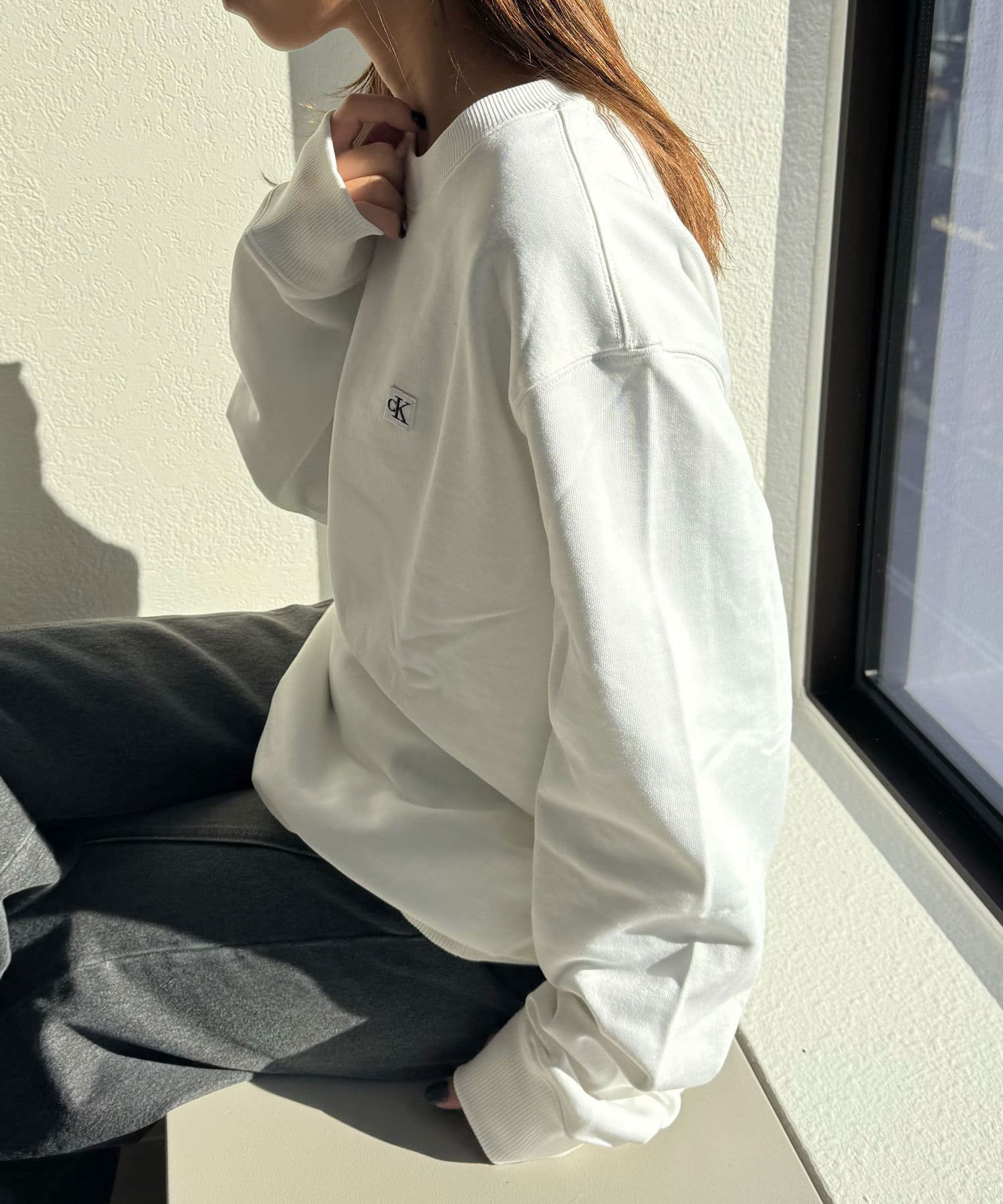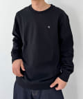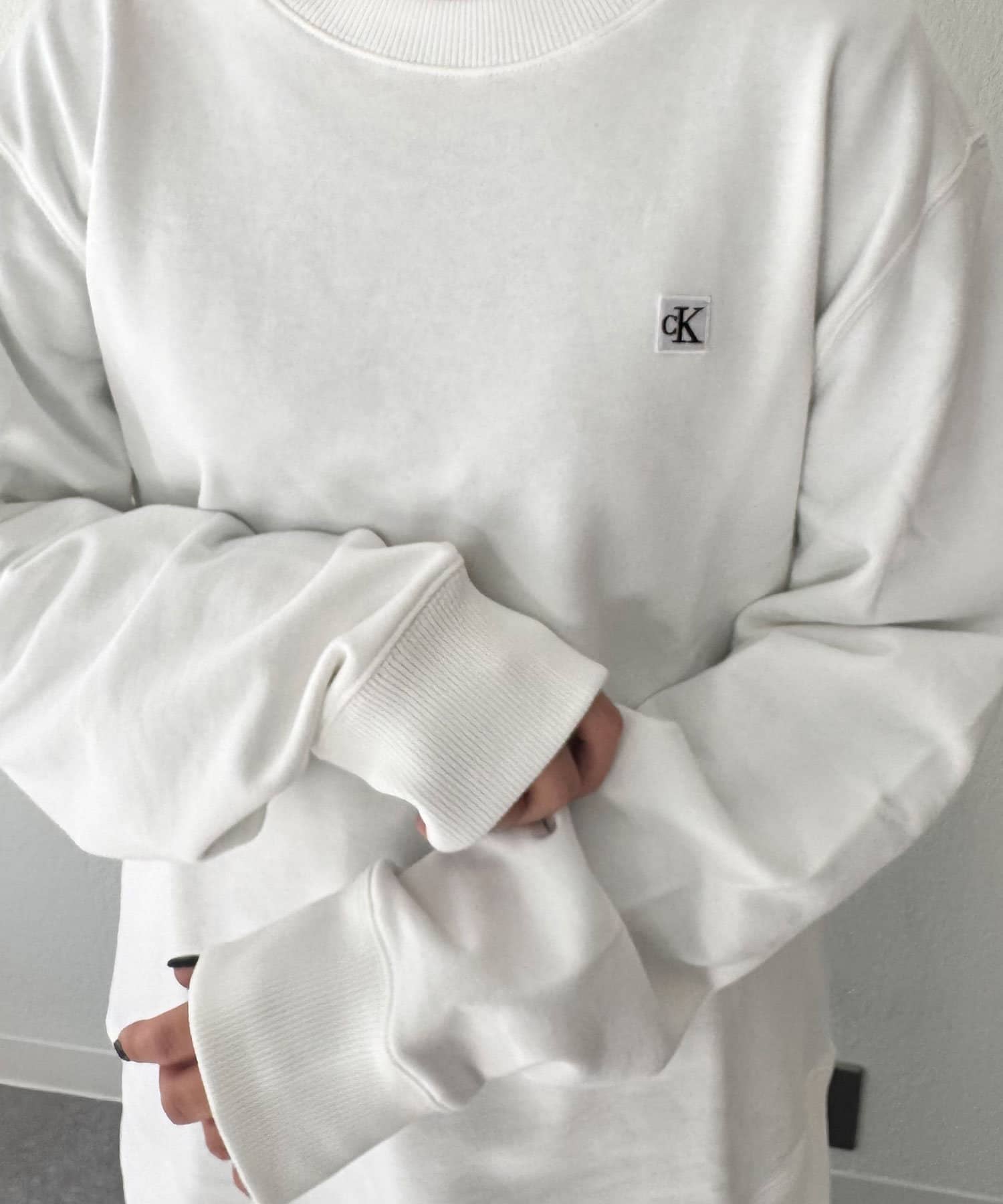 CKバッジを左胸に飾ったクルーネックトレーナー。