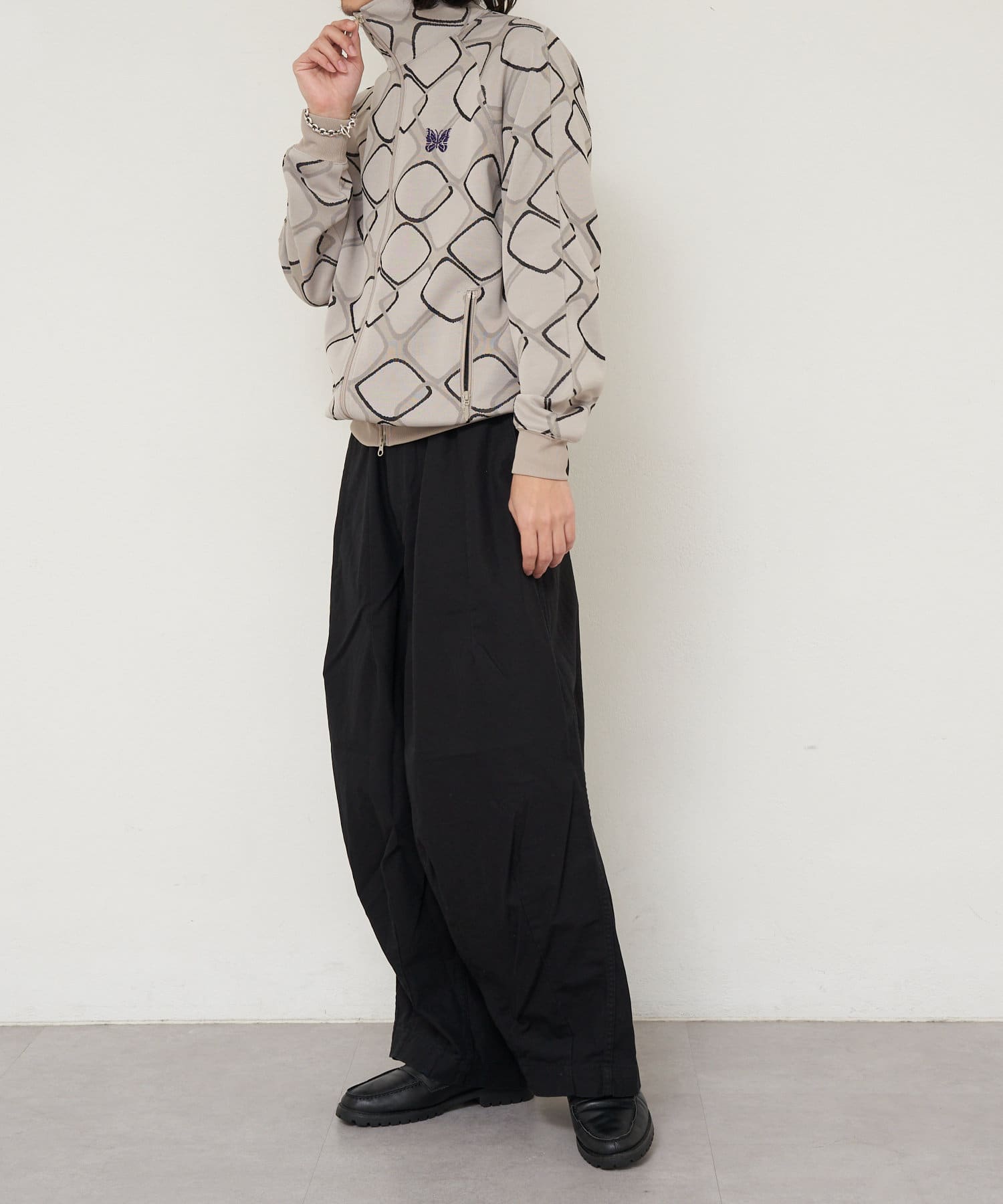 〈NEEDLES〉のトラックシリーズの中でも、特に強い個性を放つポリエステルジャカードのトラックジャケット。インパクトのある素材の魅力を引き出す、サイドラインなどのディテールをあえて省いたシンプルなデザインが特徴です。通気性、伸縮性など着心地の良さも兼ね備えており、ファッション性と機能性を併せ持ったアイテムとなっています。