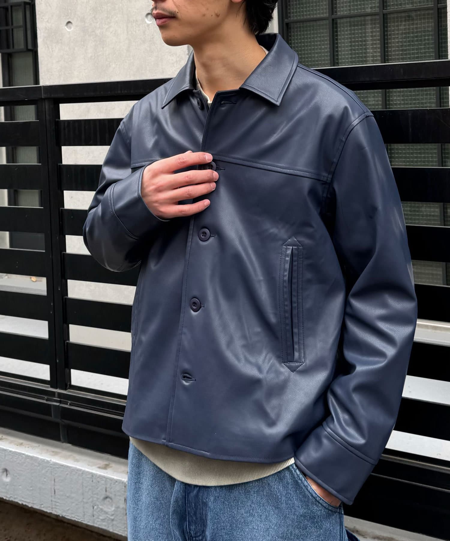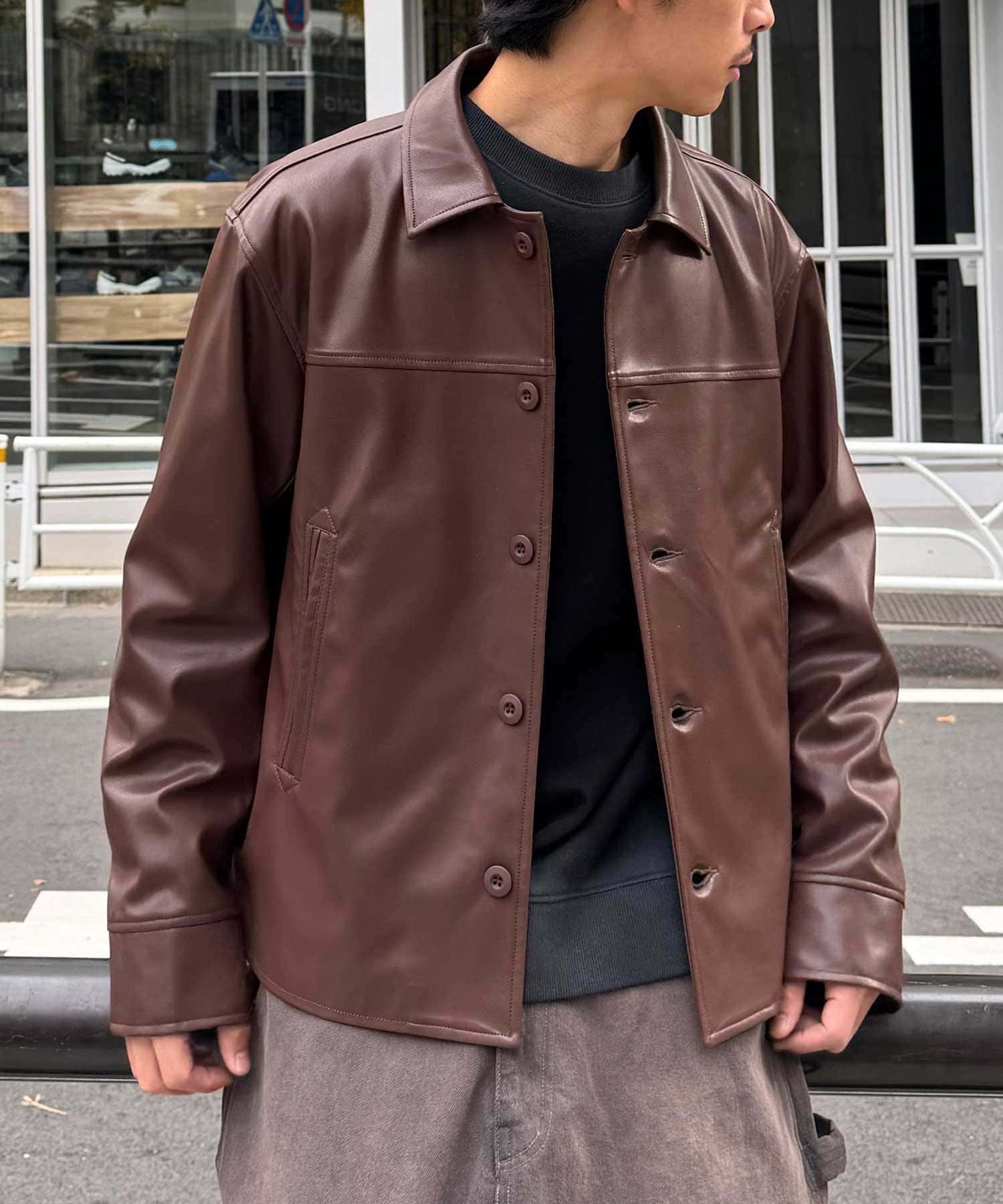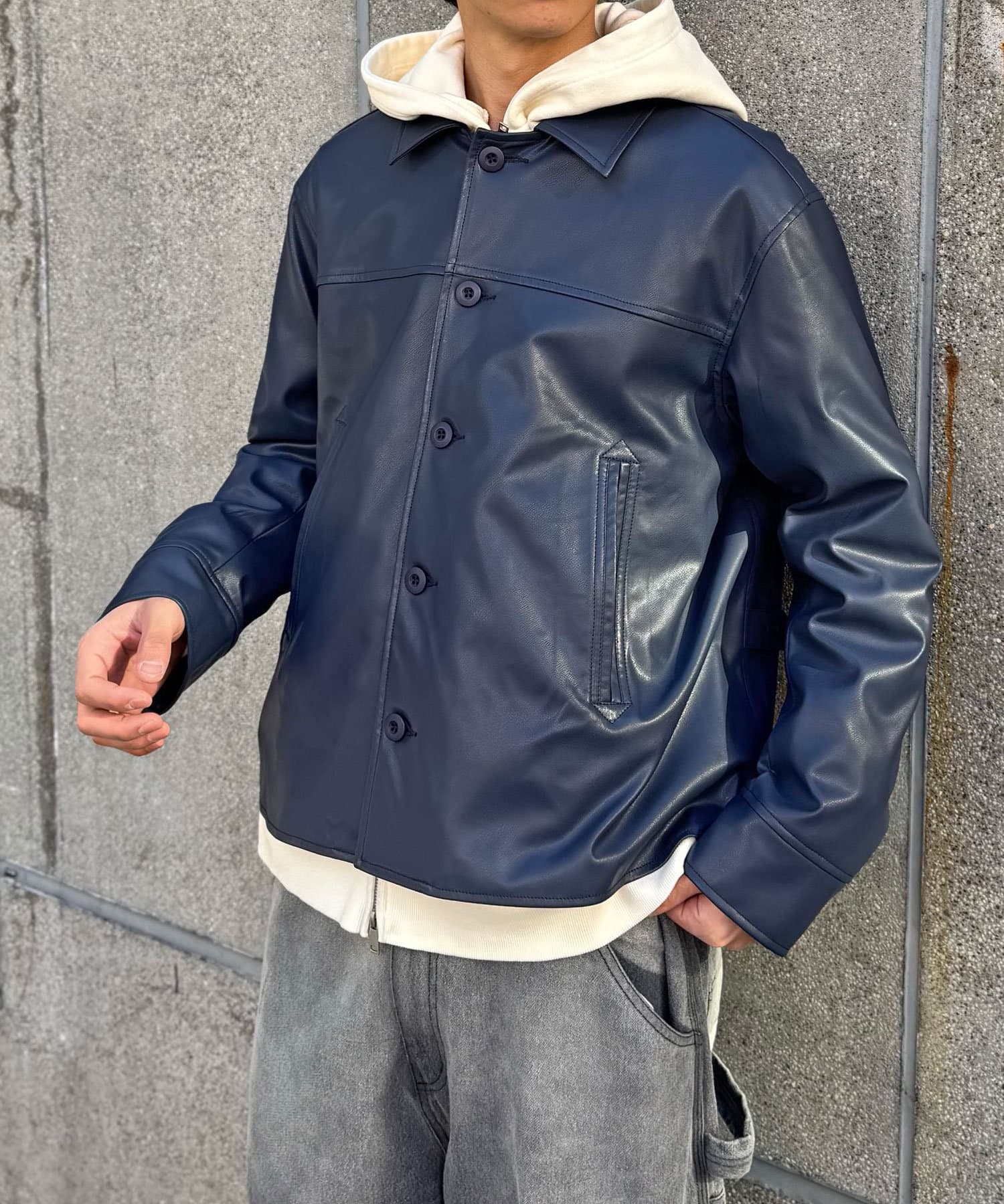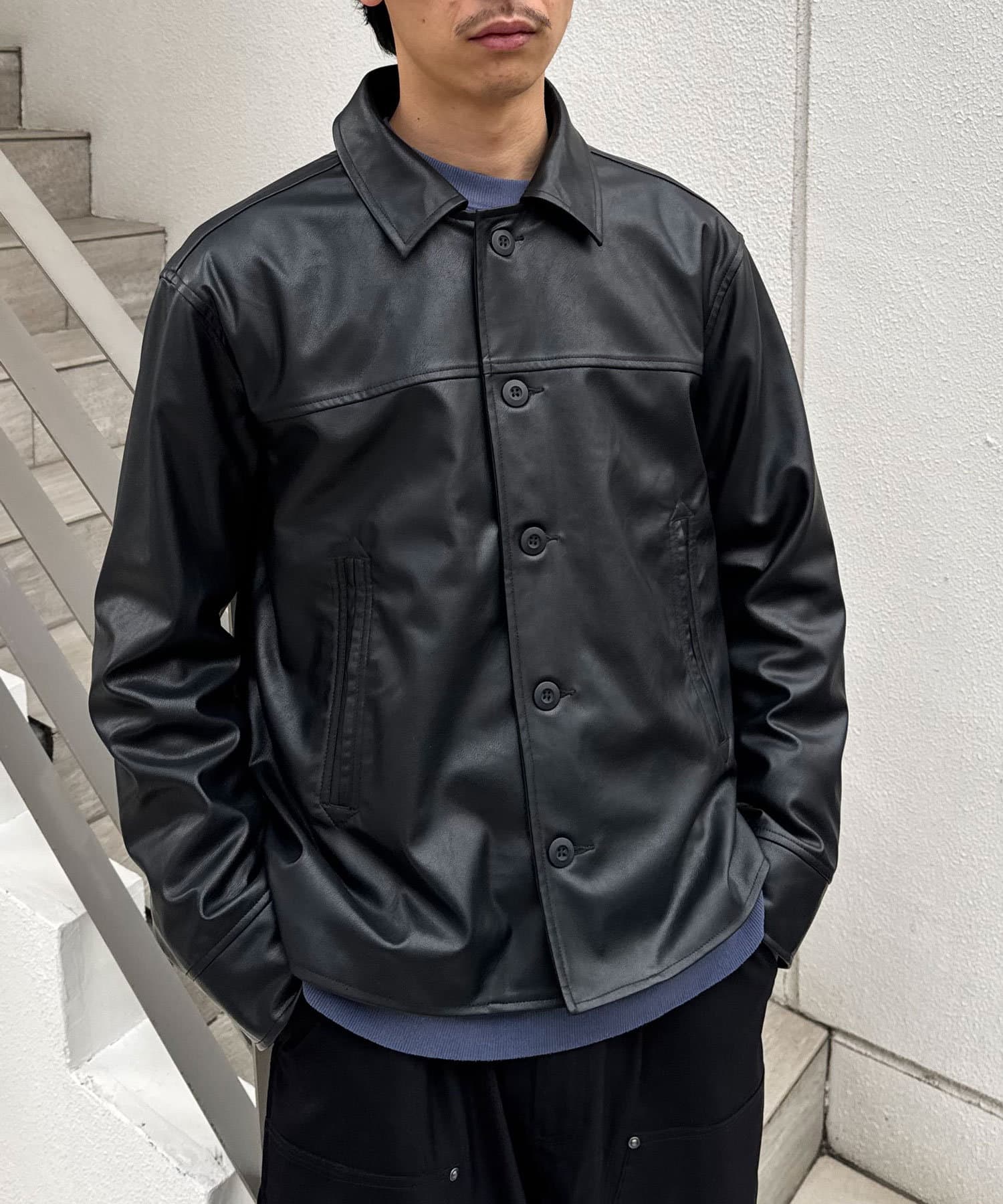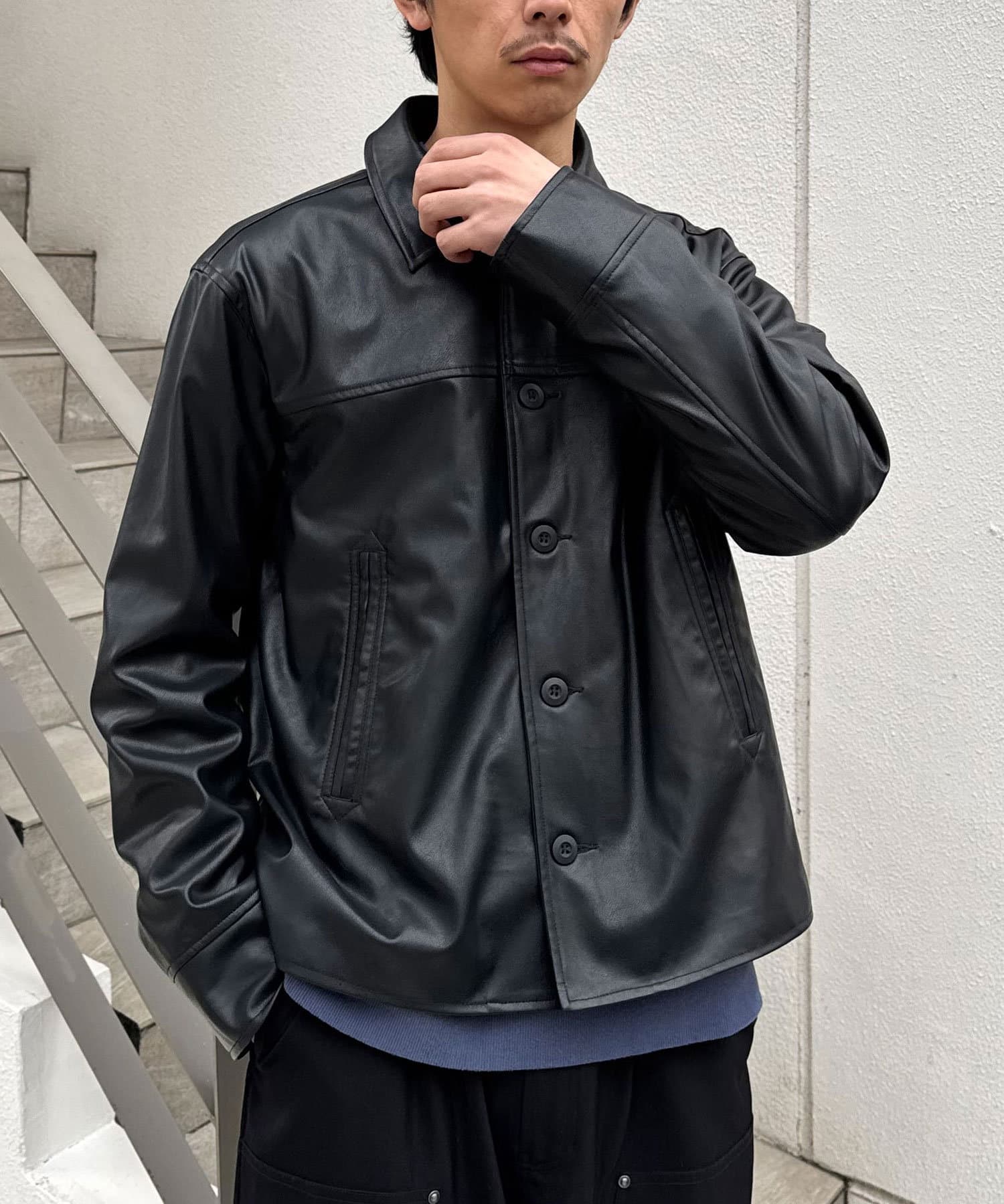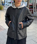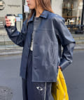 カーコートデザインに、トレンド感のあるウエスタン要素を組み込んだフェイクレザージャケット。
