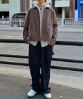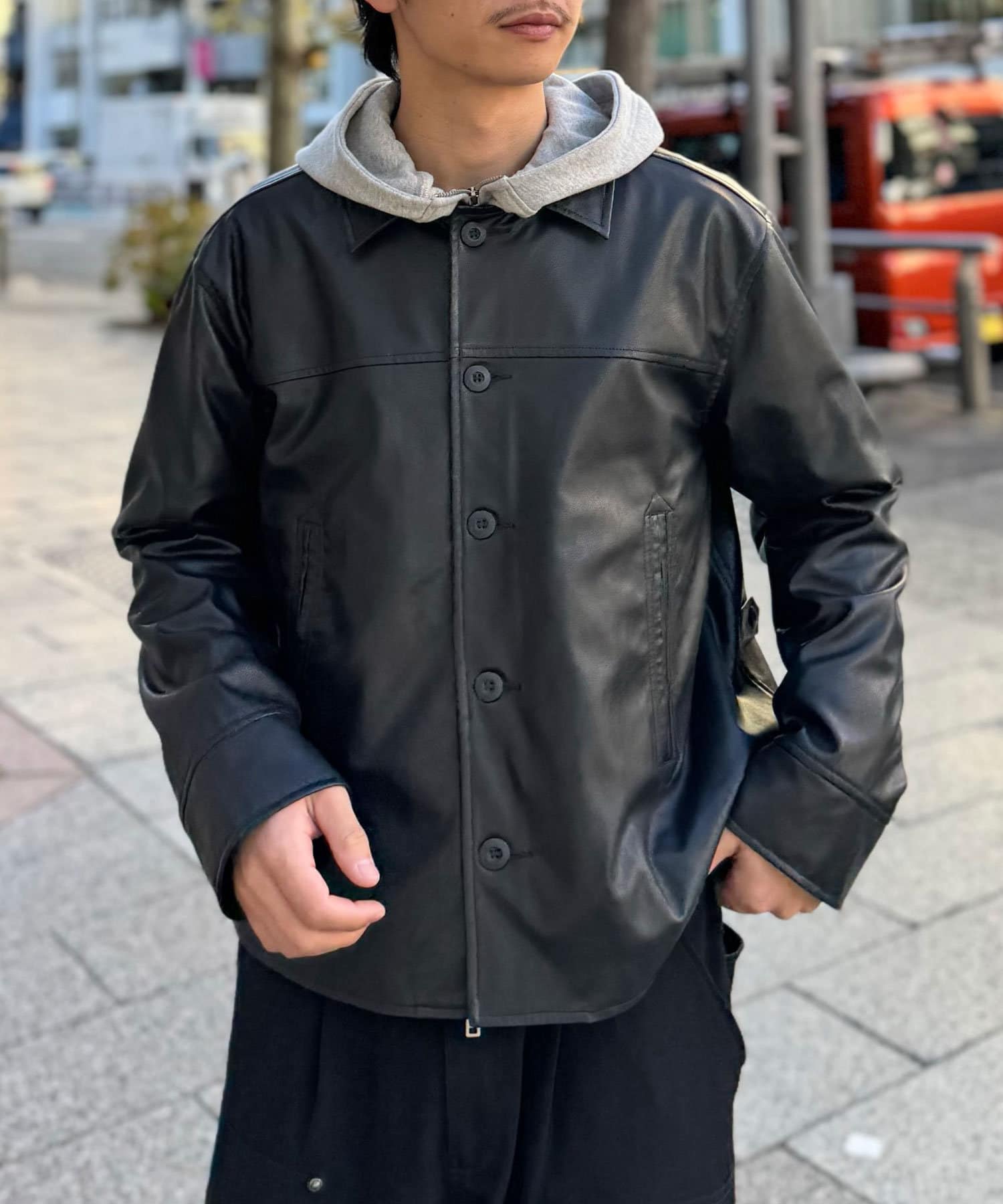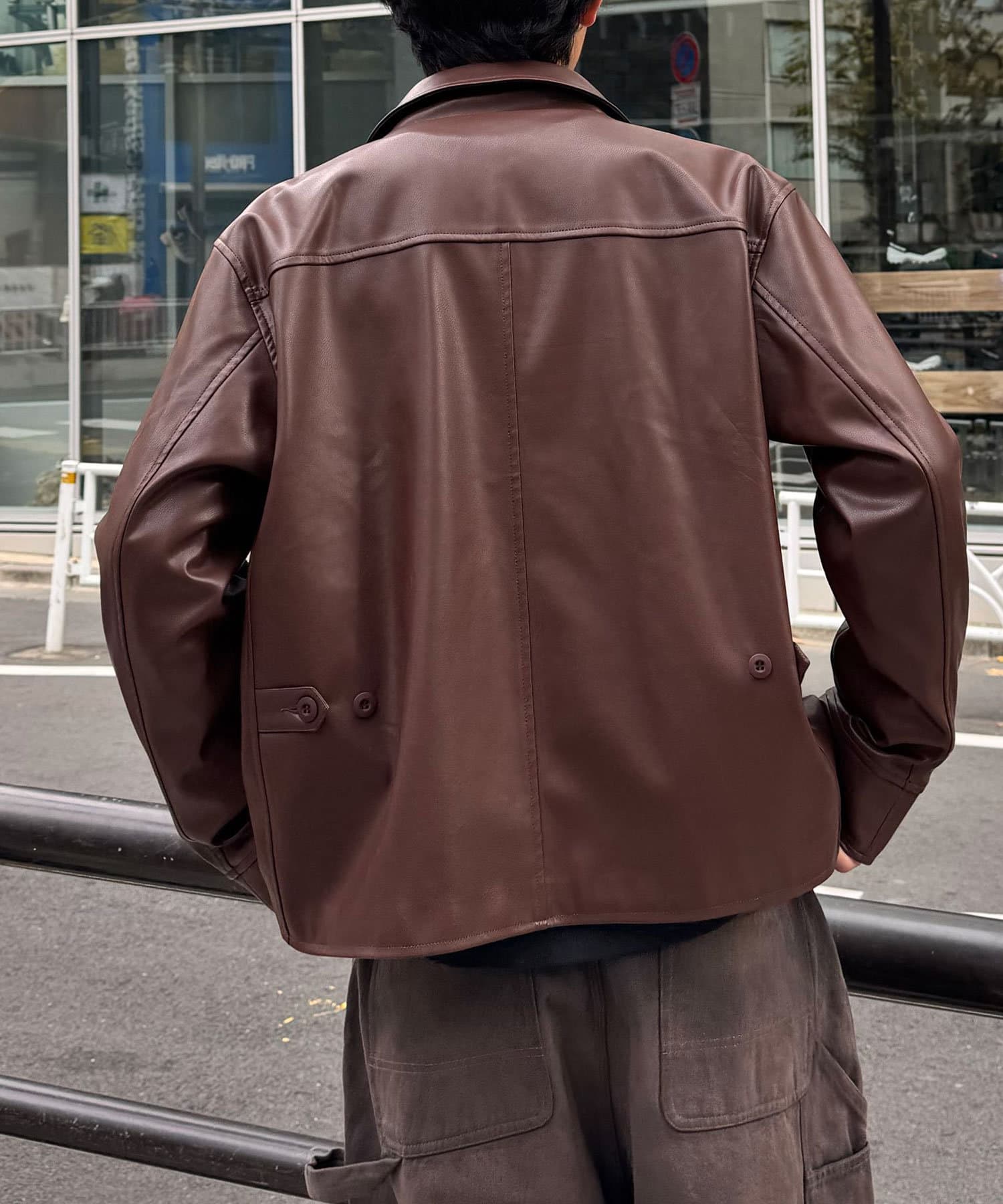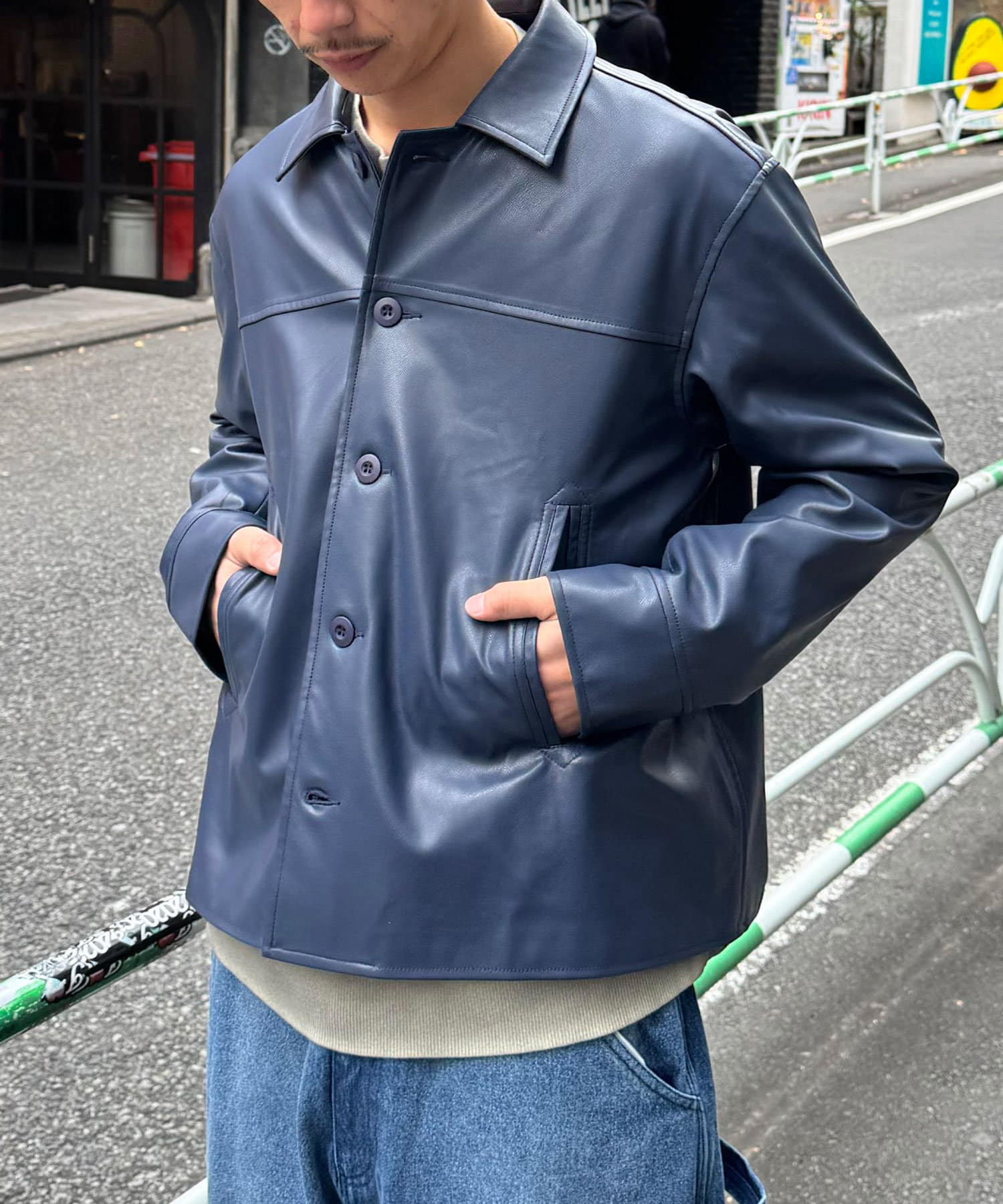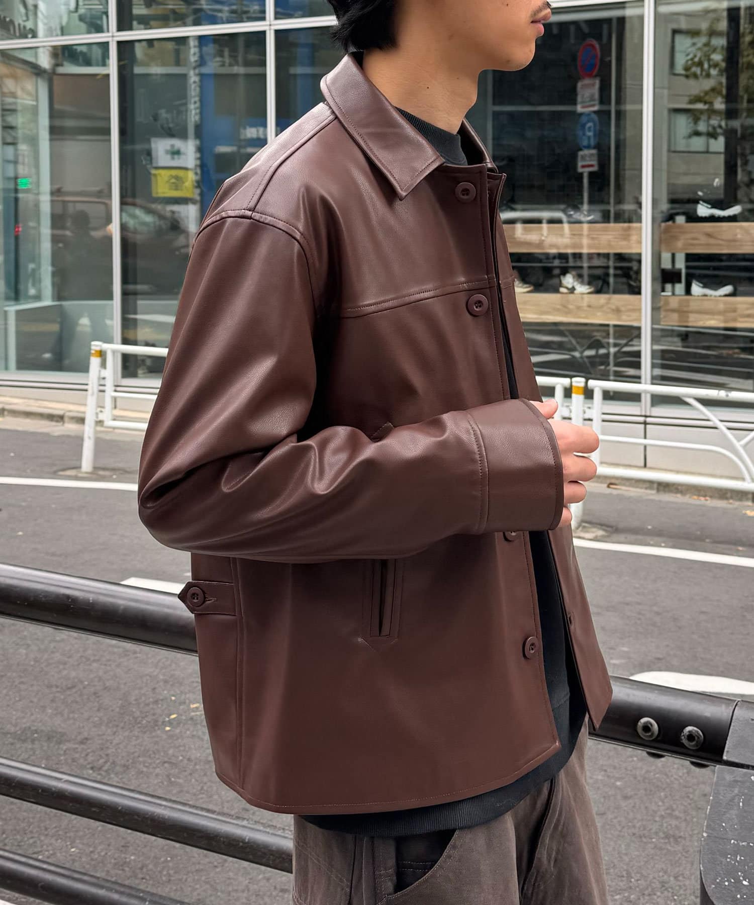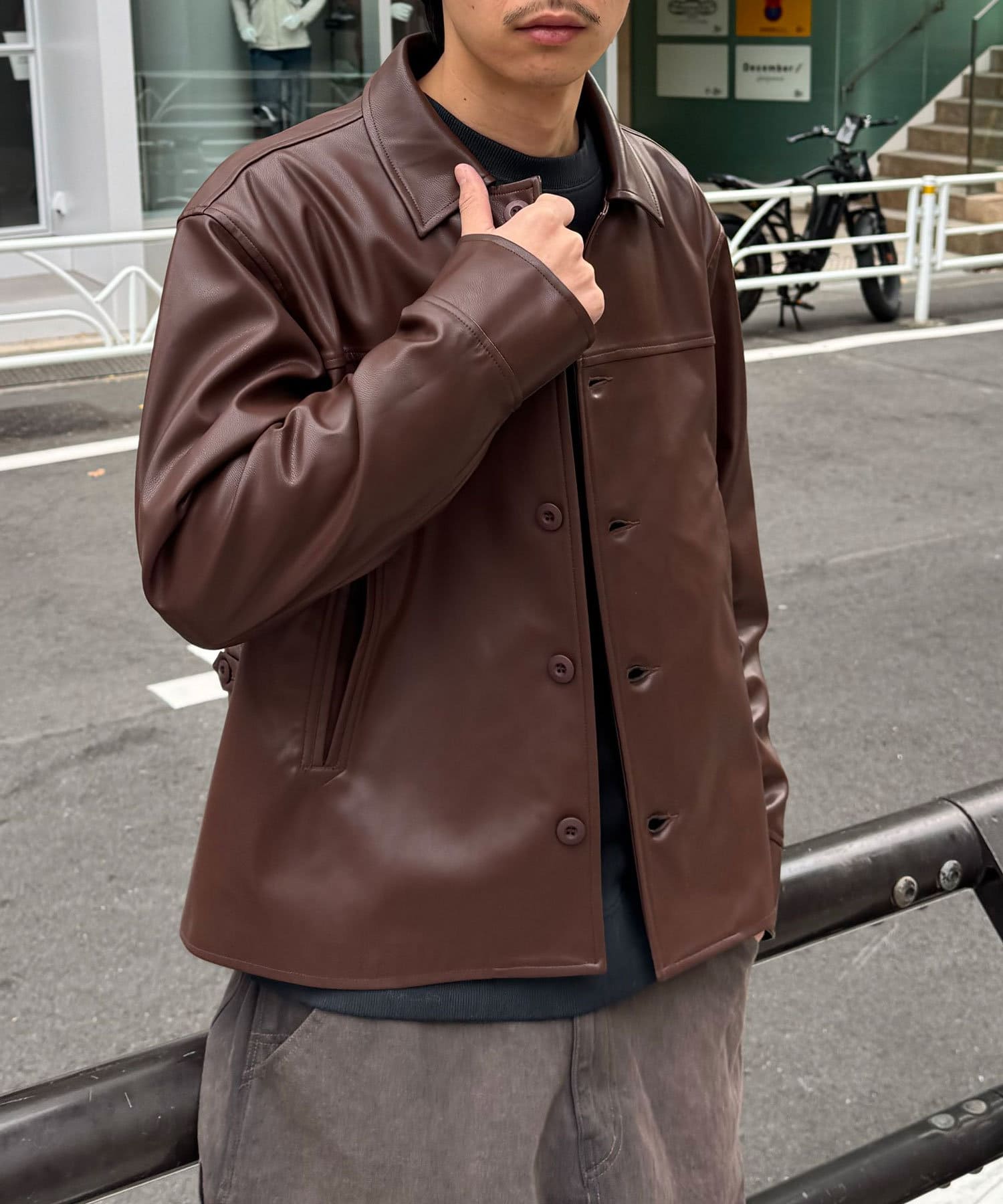 カーコートデザインに、トレンド感のあるウエスタン要素を組み込んだフェイクレザージャケット。