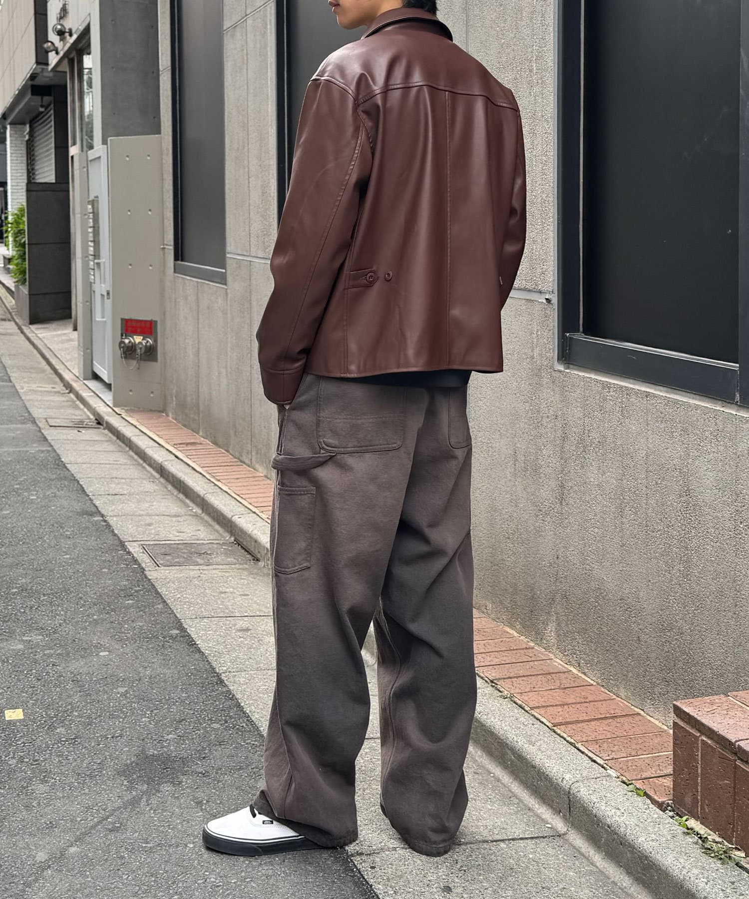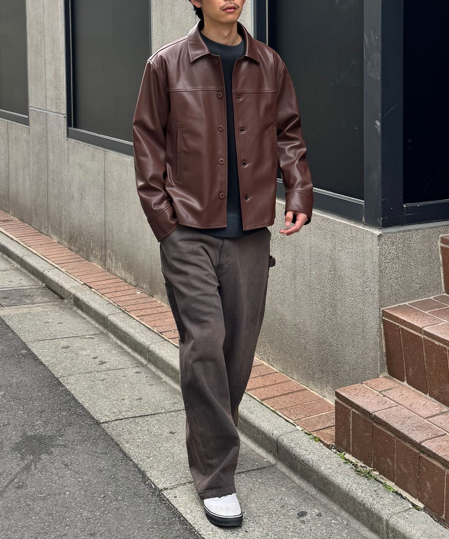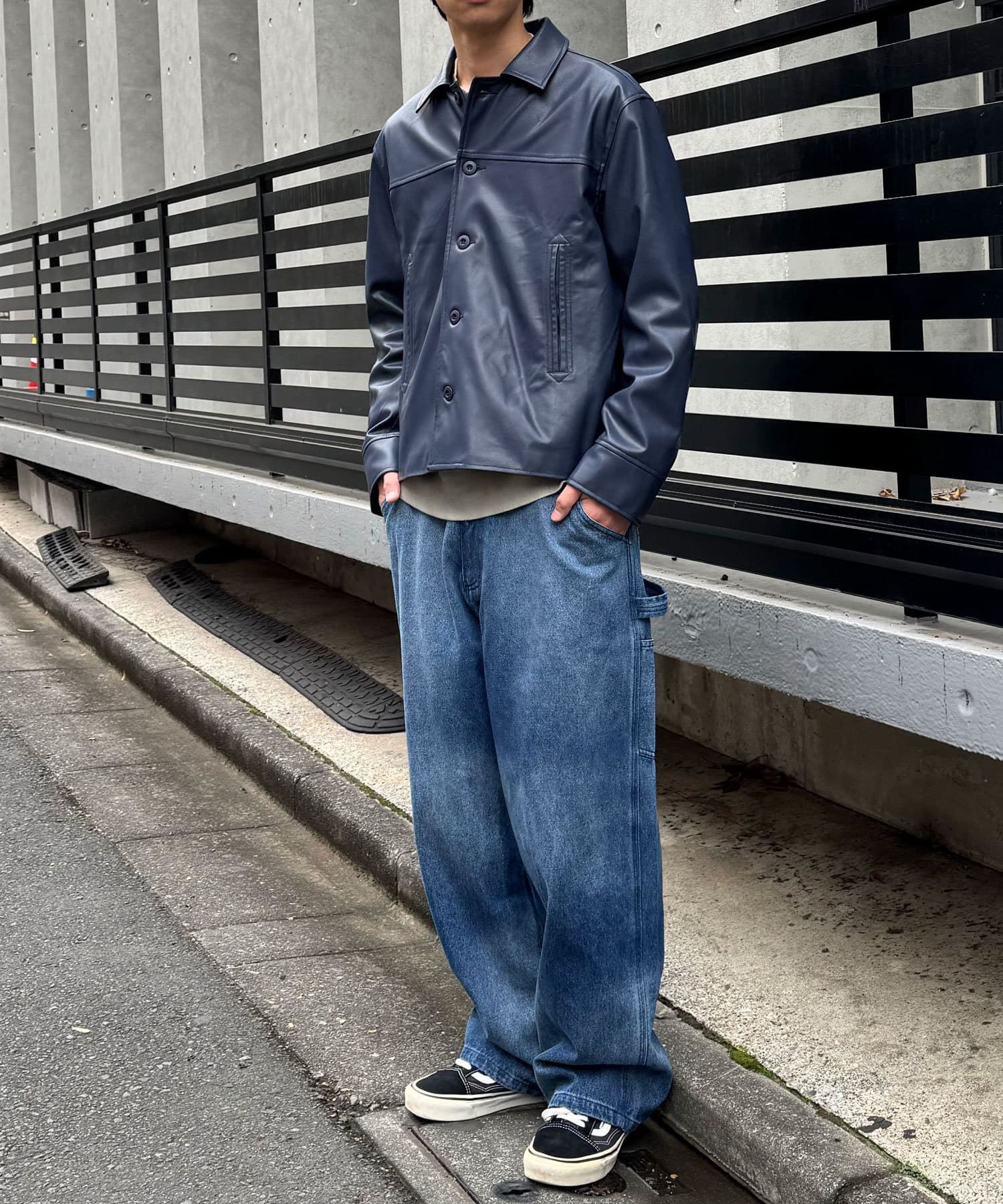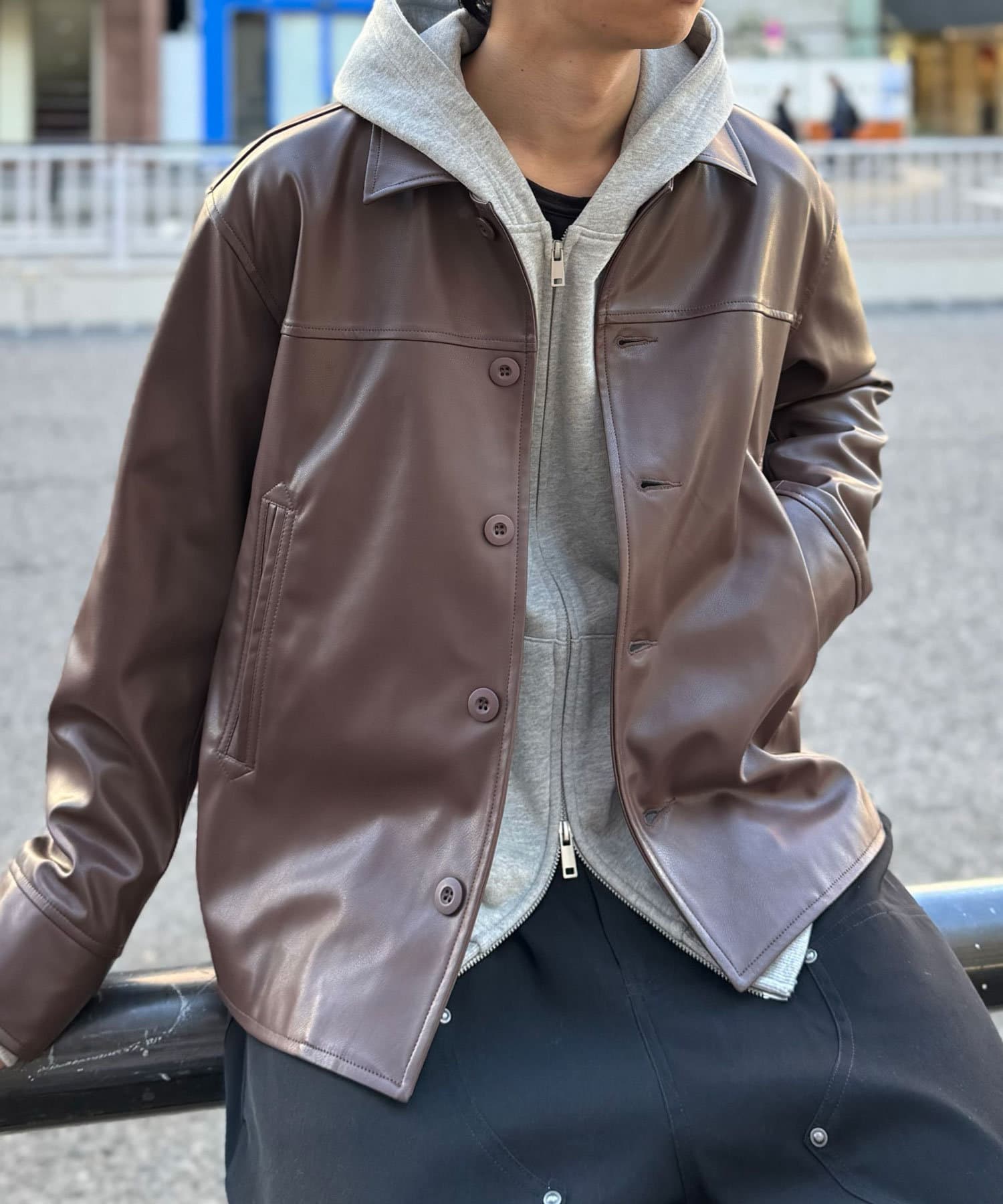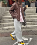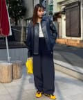 光沢感のあるフェイクレザーは、マットな質感のアイテムと合わせるとバランスがよく決まります。