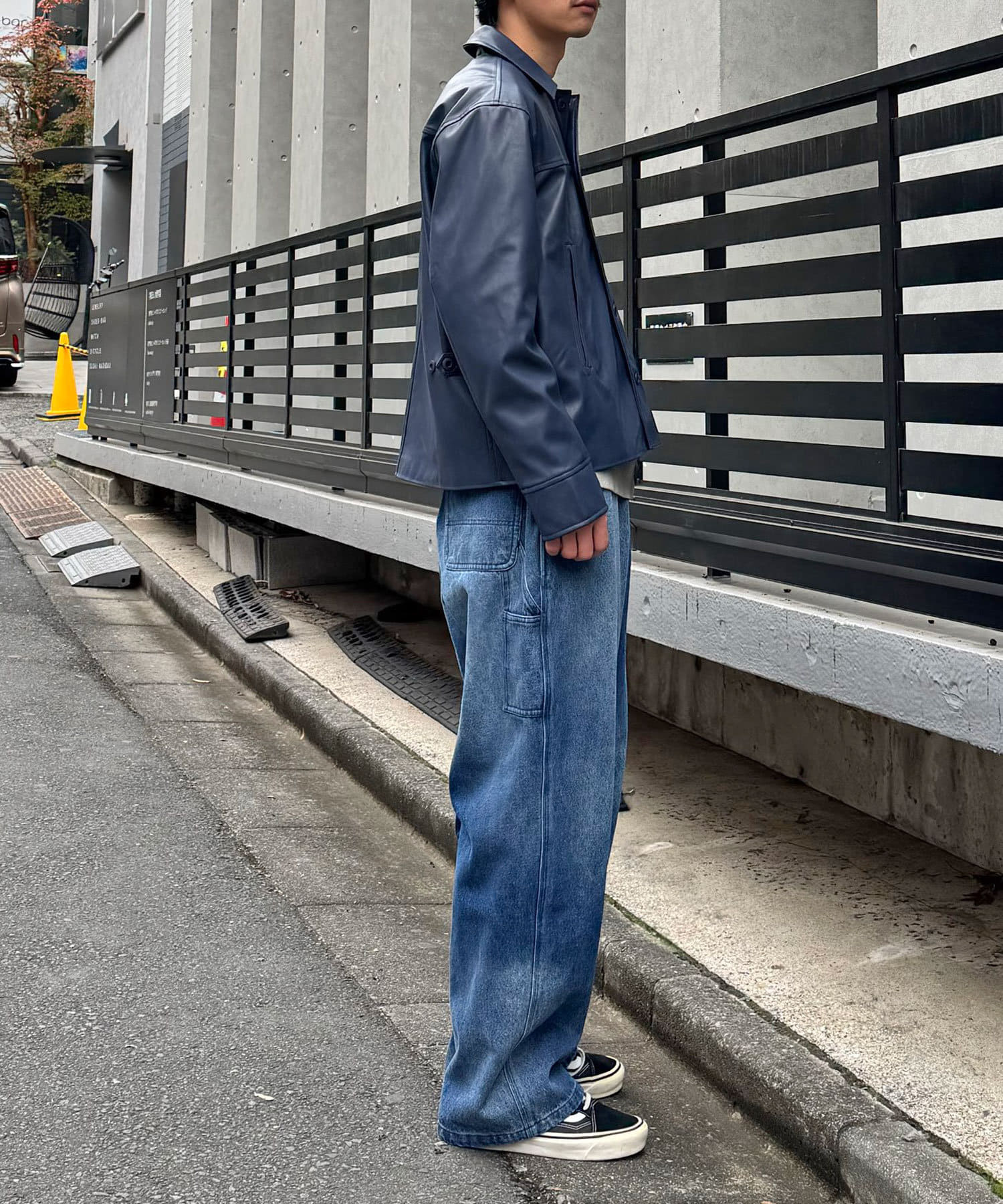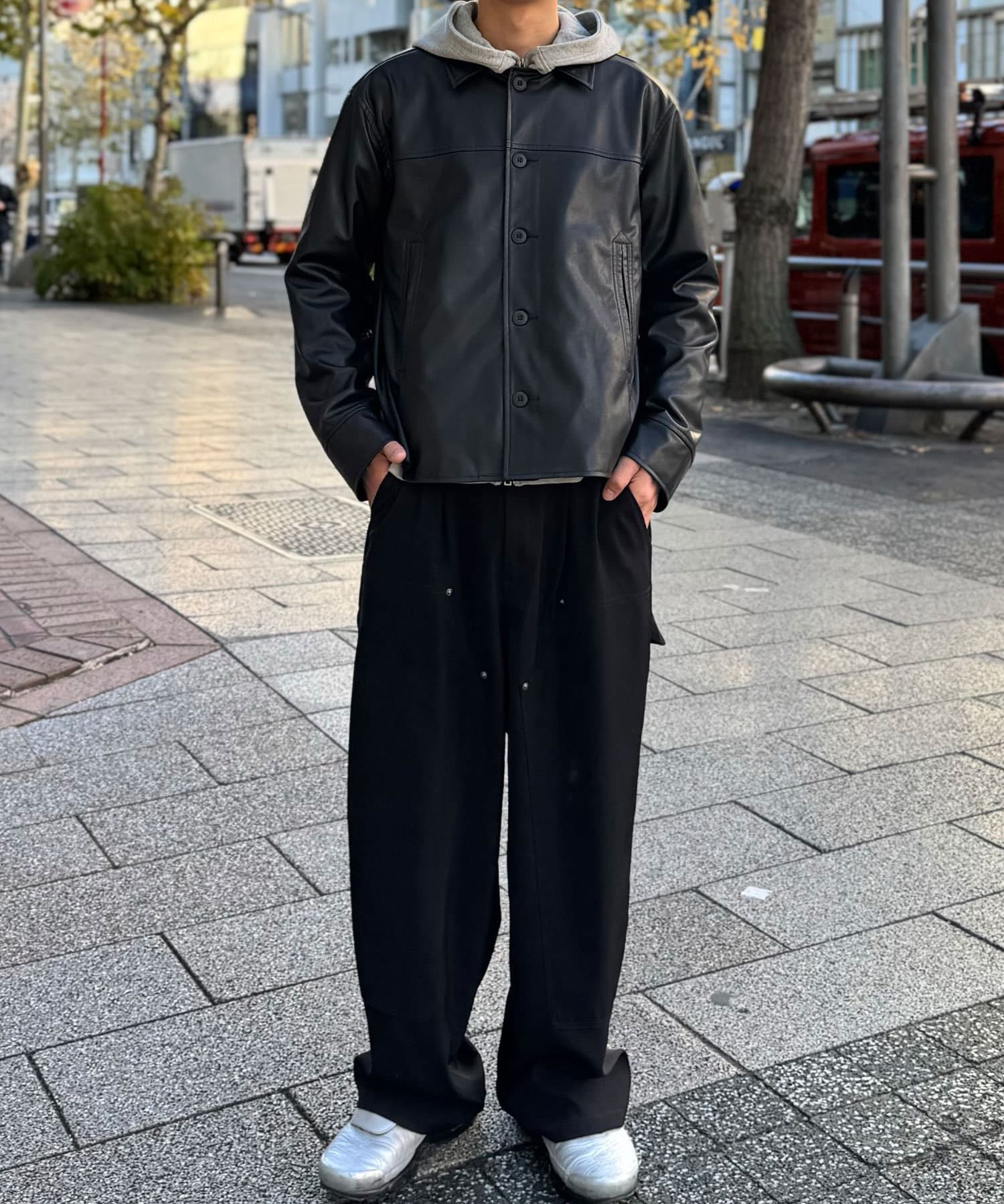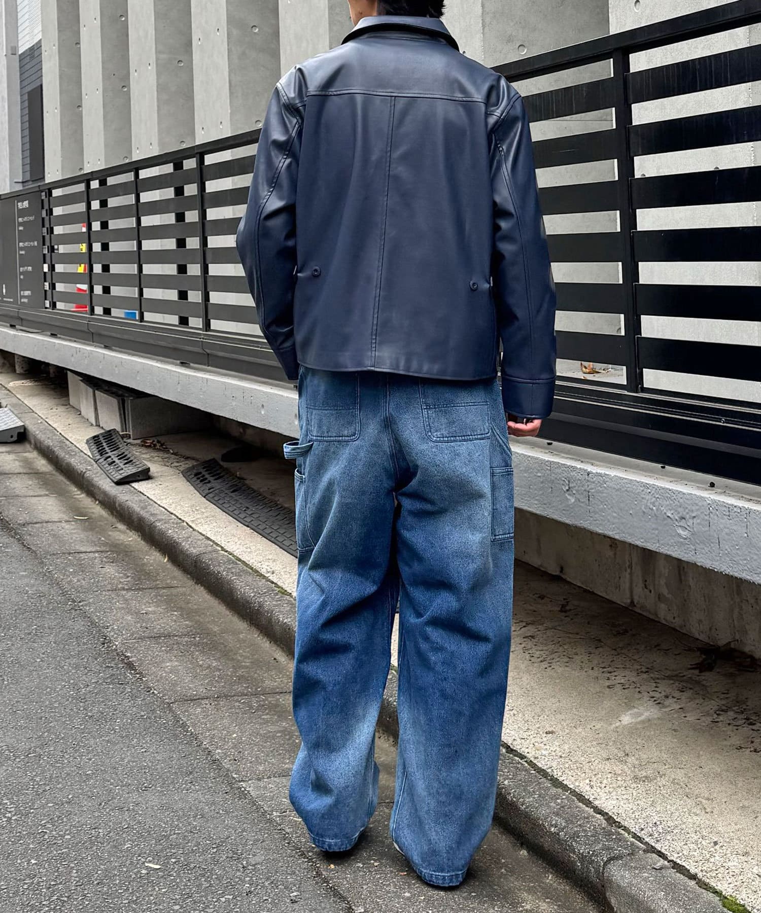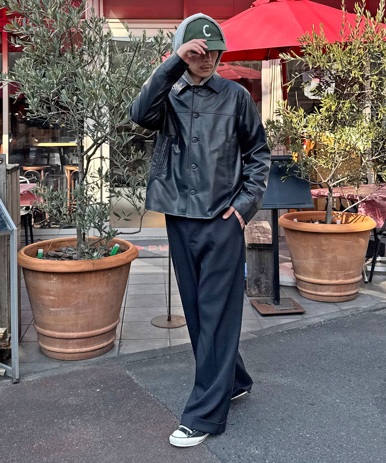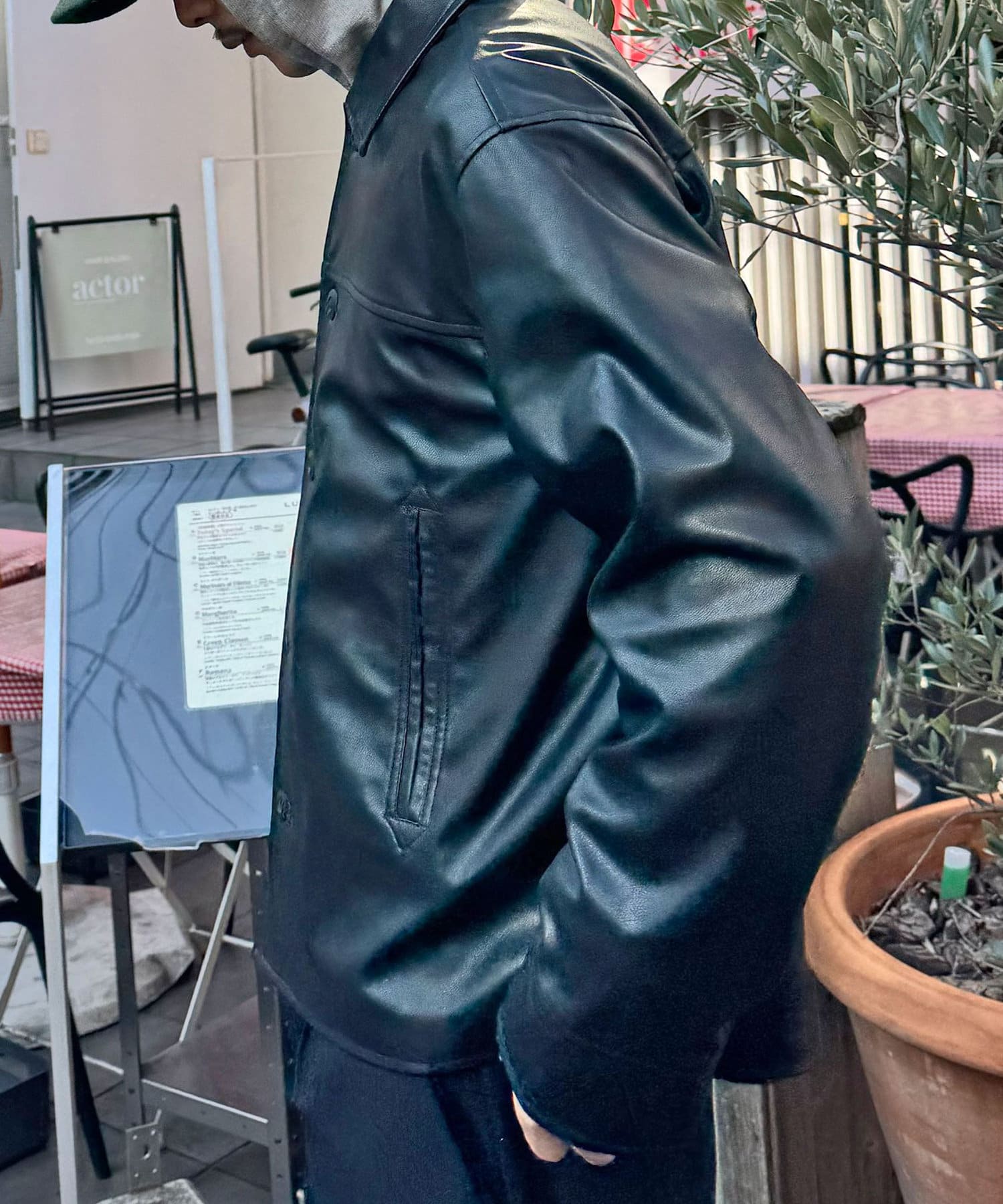 光沢感のあるフェイクレザーは、マットな質感のアイテムと合わせるとバランスがよく決まります。