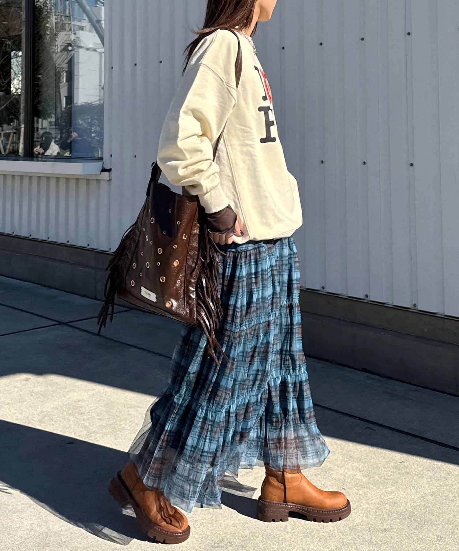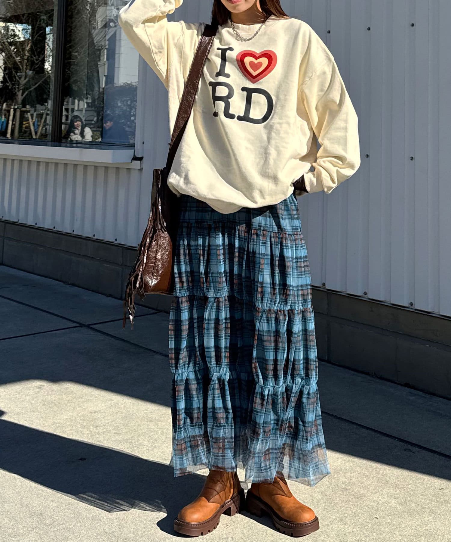 ゆったりシルエットなので、ミニ丈のボトムスとの相性抜群です。