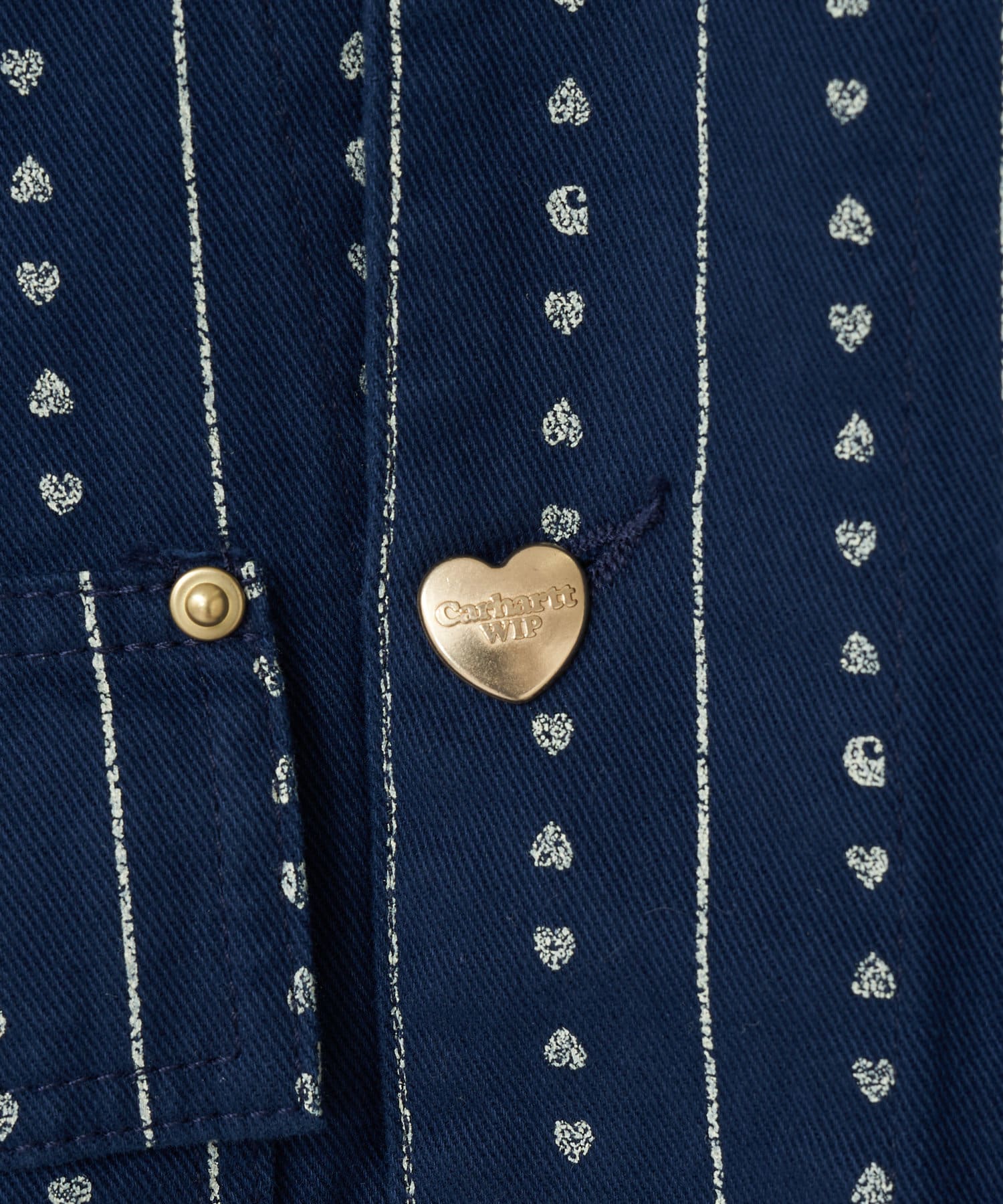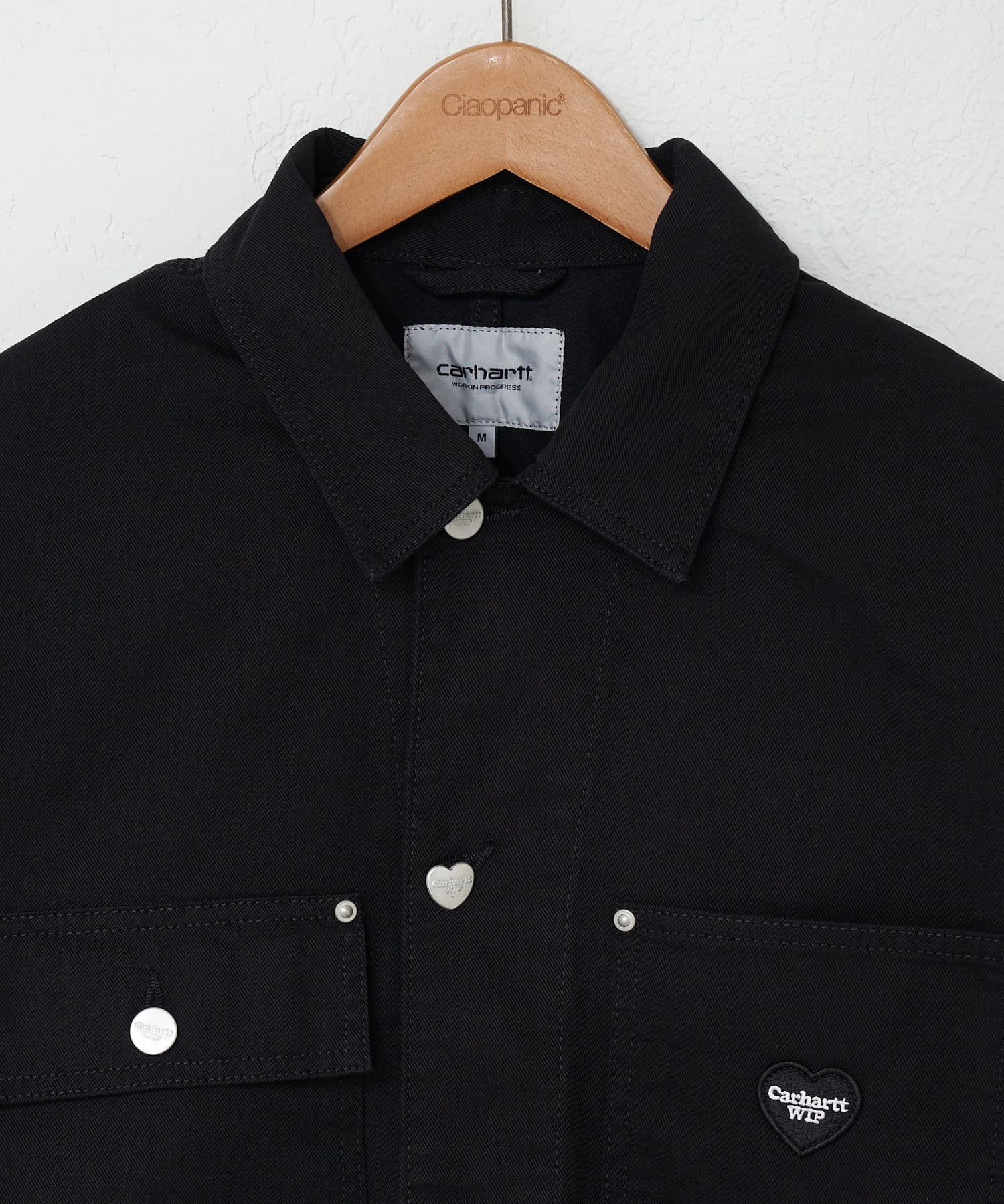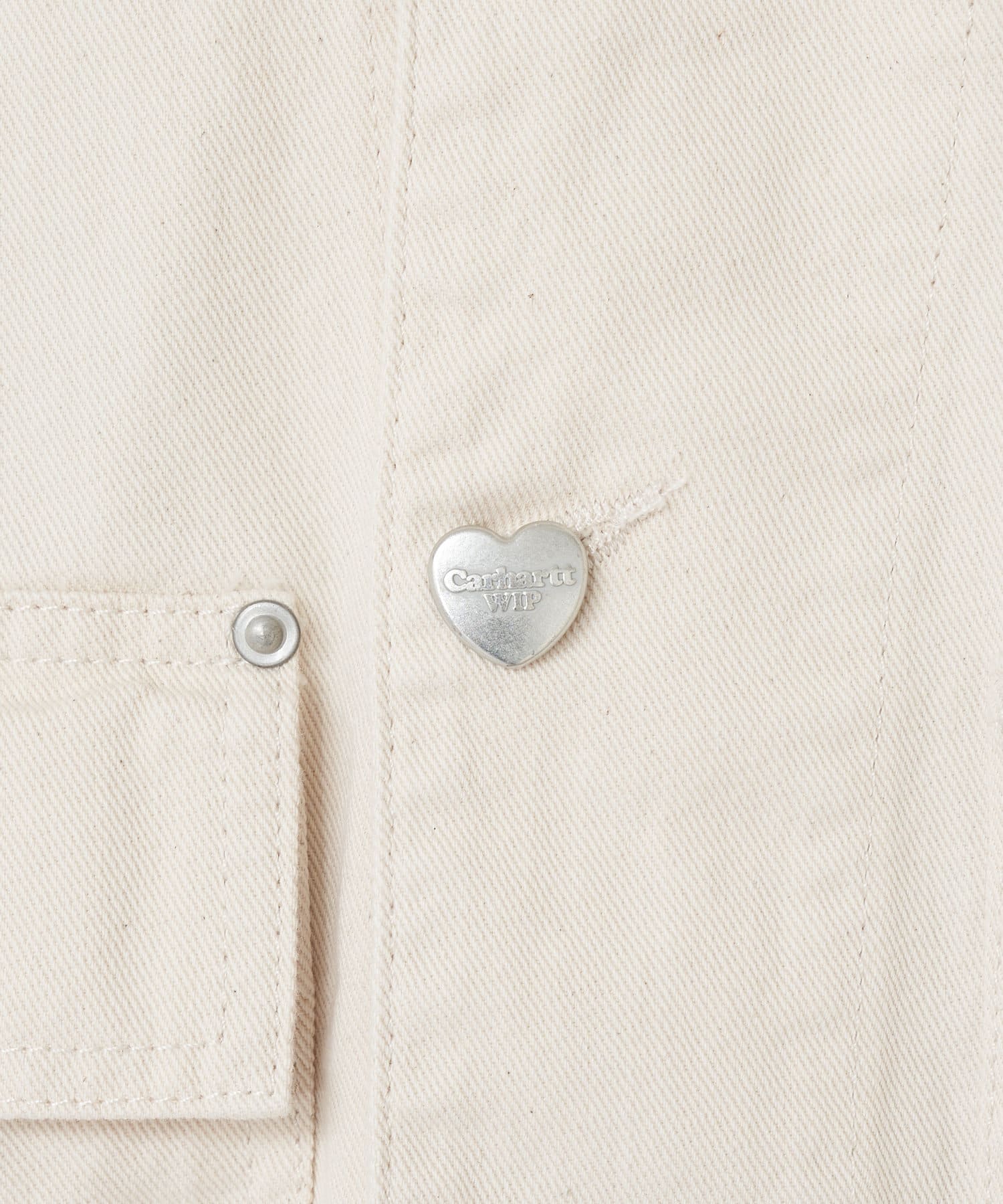 ドリューチョアコートは、クラシックなワークスタイルのシルエットをベースに、トリプルステッチのディテールが特徴の裏地なしのミッドウェイトコットンツイル製。フロントポケットは4つあり、うち1つはフラップとボタンで開閉する。ジャケットの内側にも胸ポケットが1つ付いている。ハートのワッペンがデザインを引き締めている。