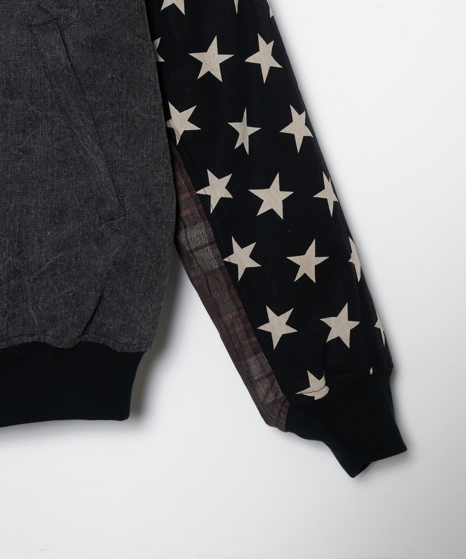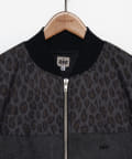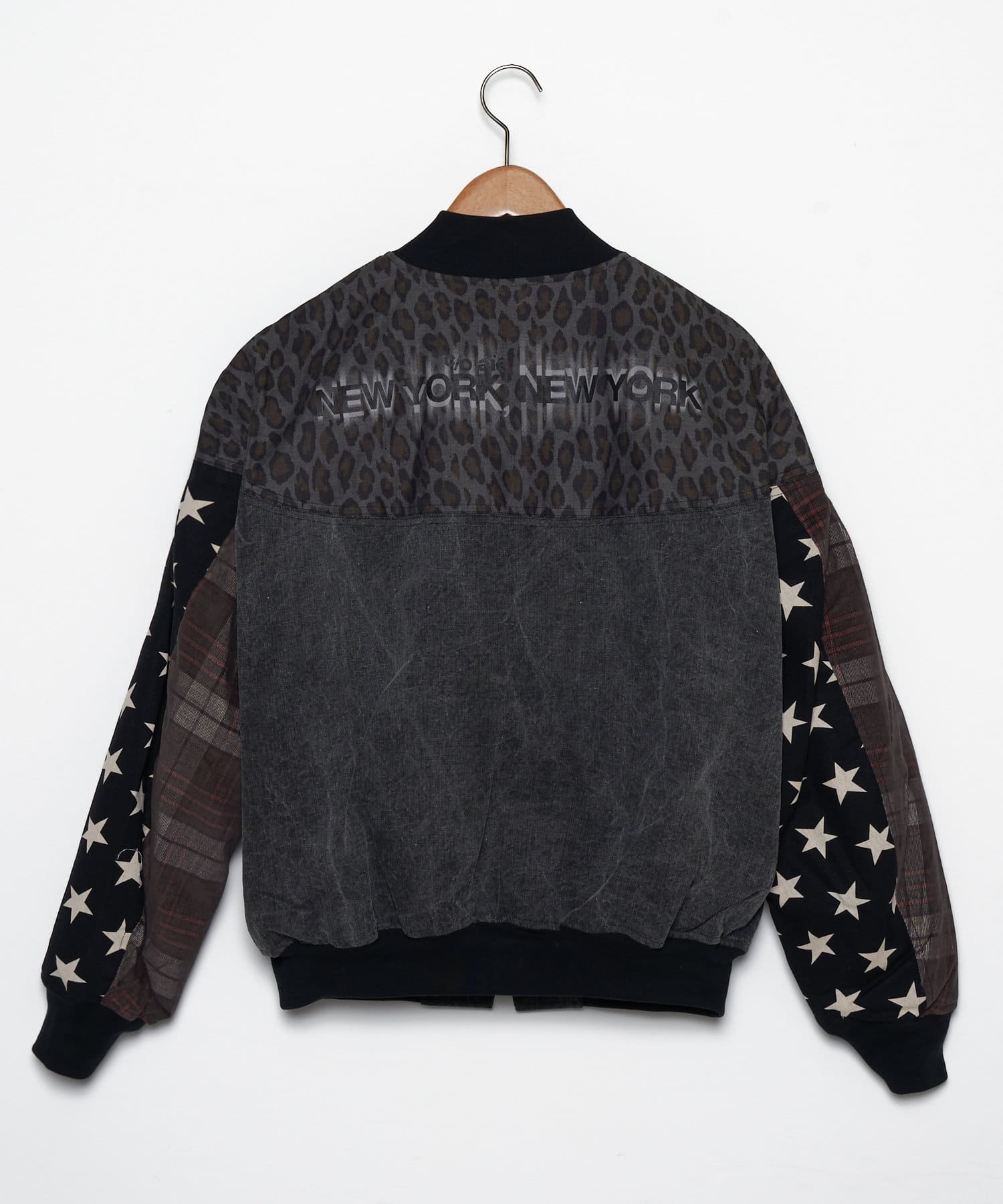 レオパード・チェック・星柄など、4種の異なる生地を大胆に切り替えたデザインは、1枚で着こなしの主役に。