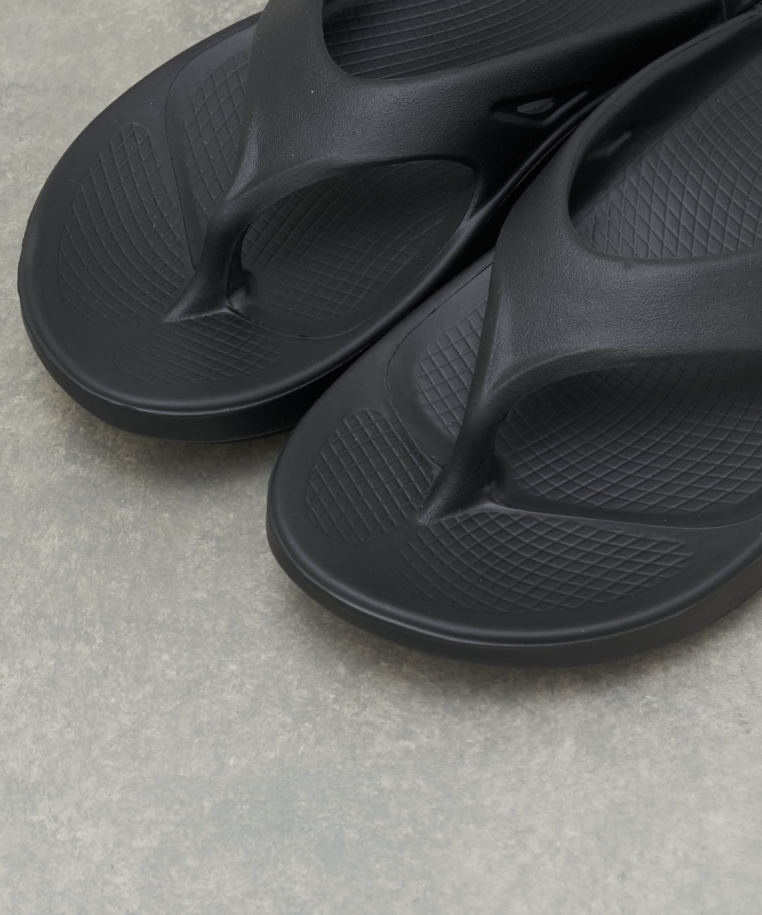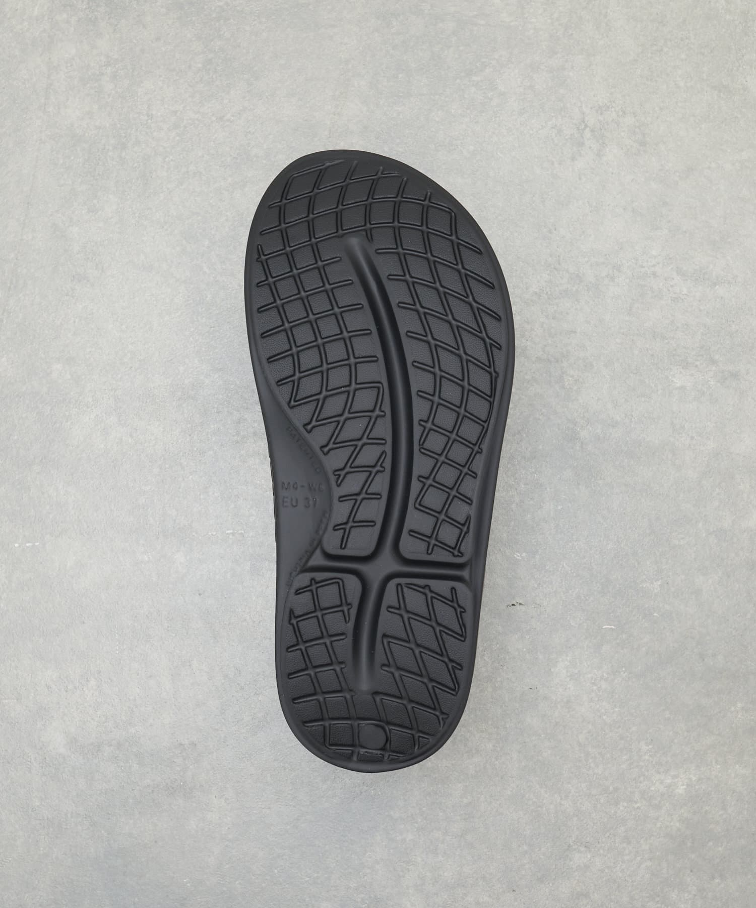 OOFOS® 製品に使われている特殊素材 OOfoam は、前進力を生む事を目的とした一般的な EVA 素材のミッドソールと異なり、衝撃の反発を 37% 抑えることができ着地による足裏への衝撃を軽減することができます。そのため膝、腰、背中にかかる負担を軽減でき、また人間工学に基づいて設計されたフットベットにより、足を優しく包み込み、土踏まずをしっかりサポートします。