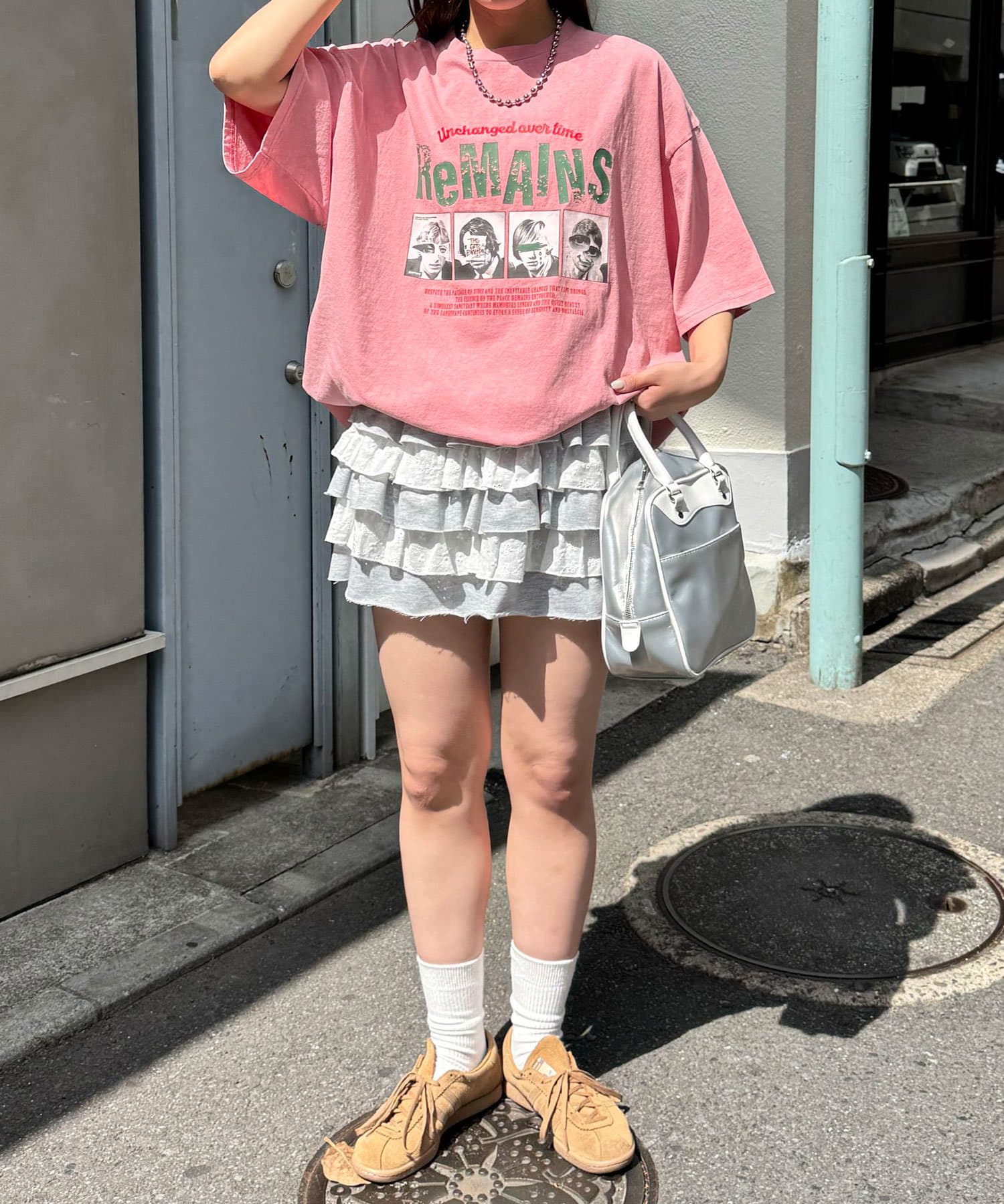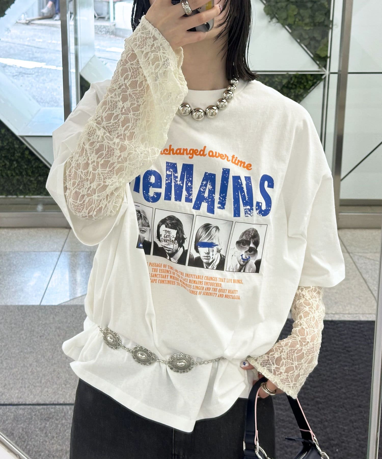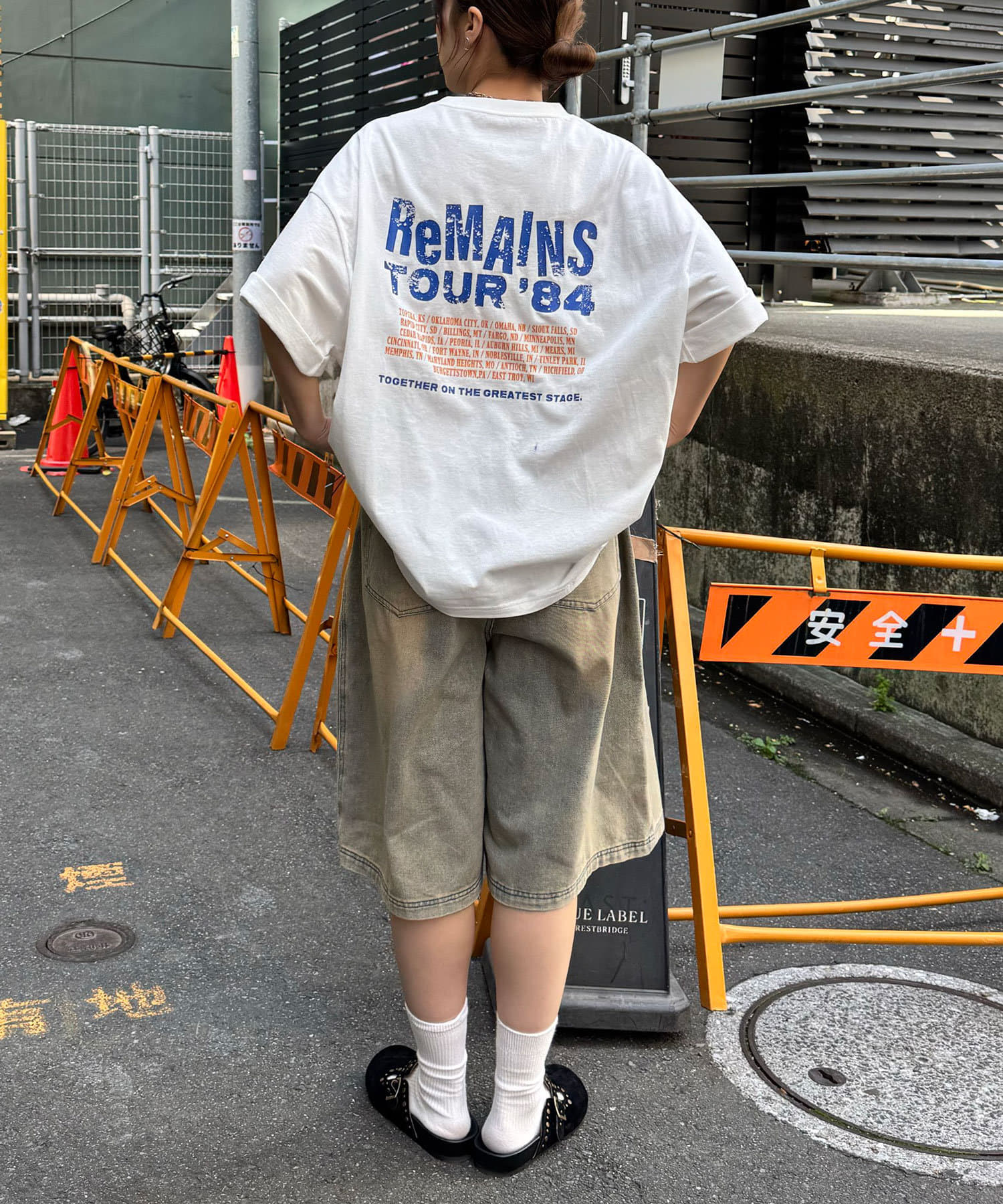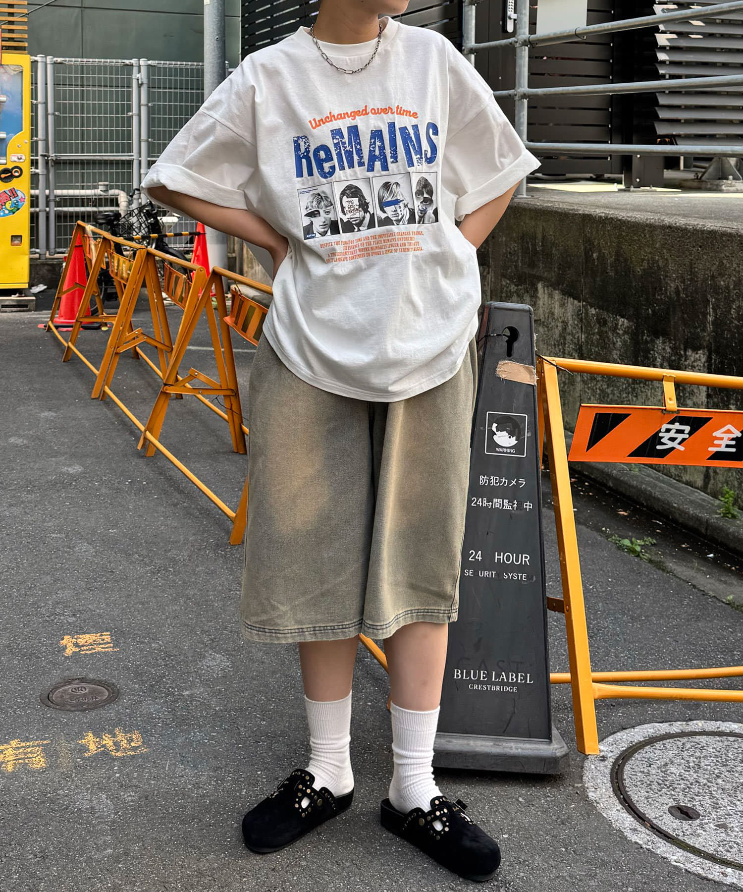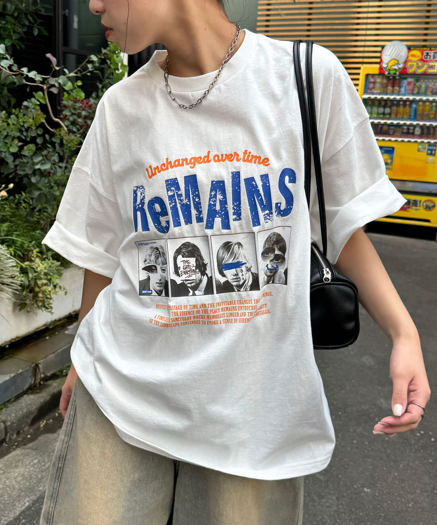 大胆なプリントが目を引くバンドモチーフのプリントTEE。