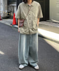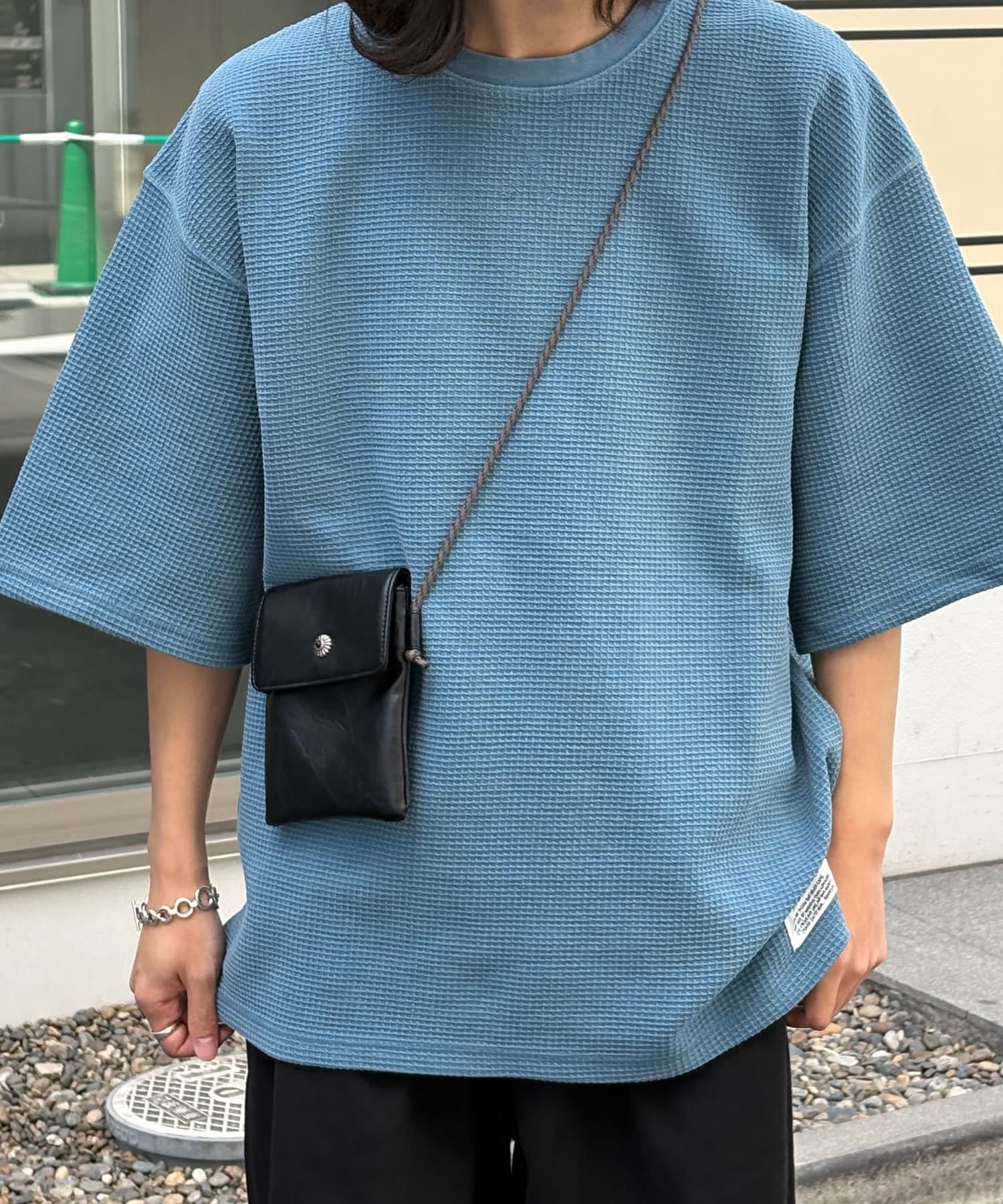 リラックス感のあるワッフルTやスラックスと合わせて、上品さとカジュアルさを両立。