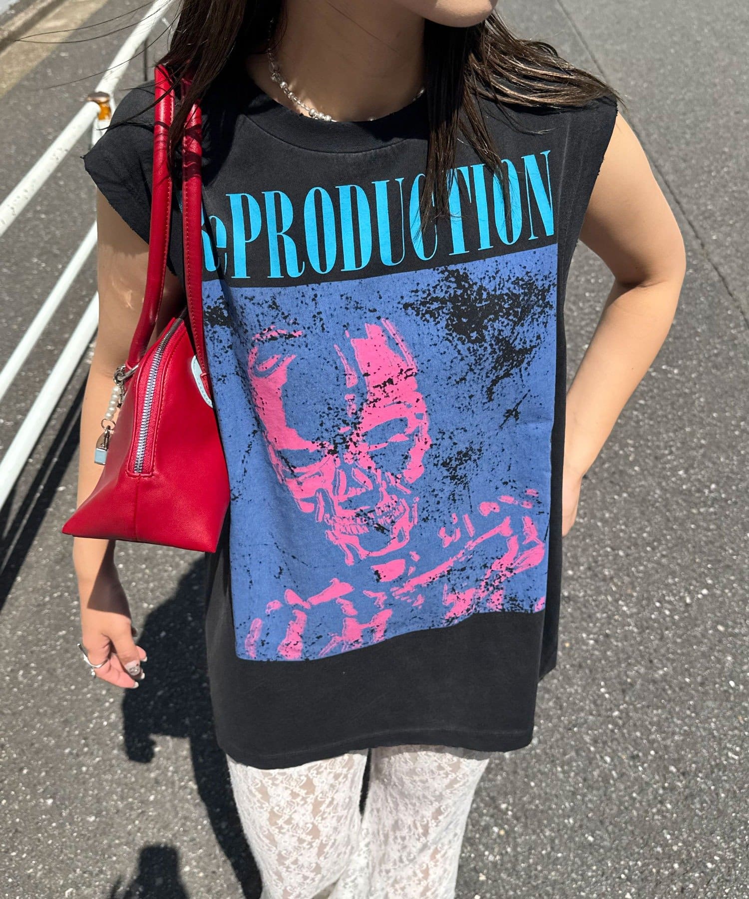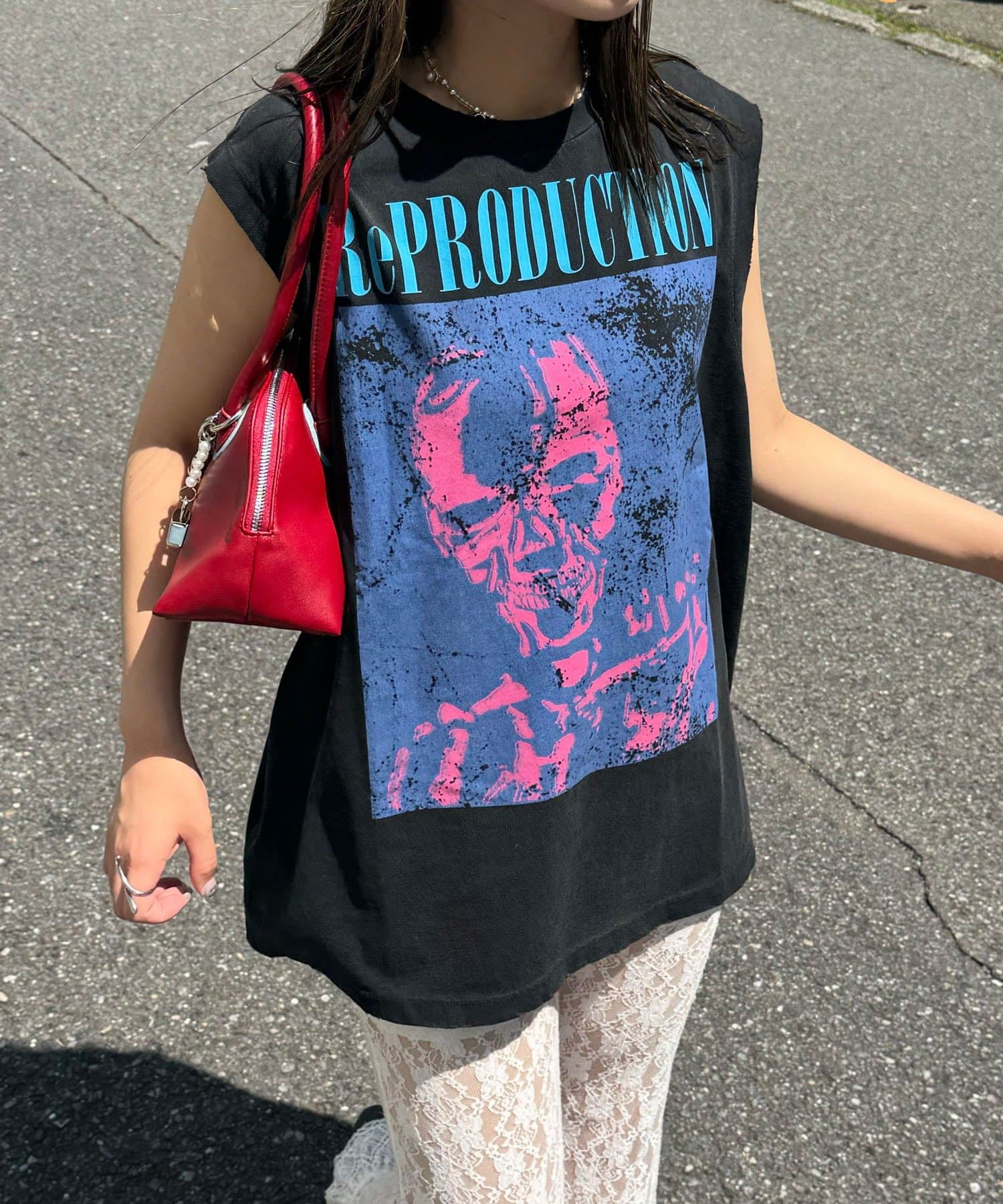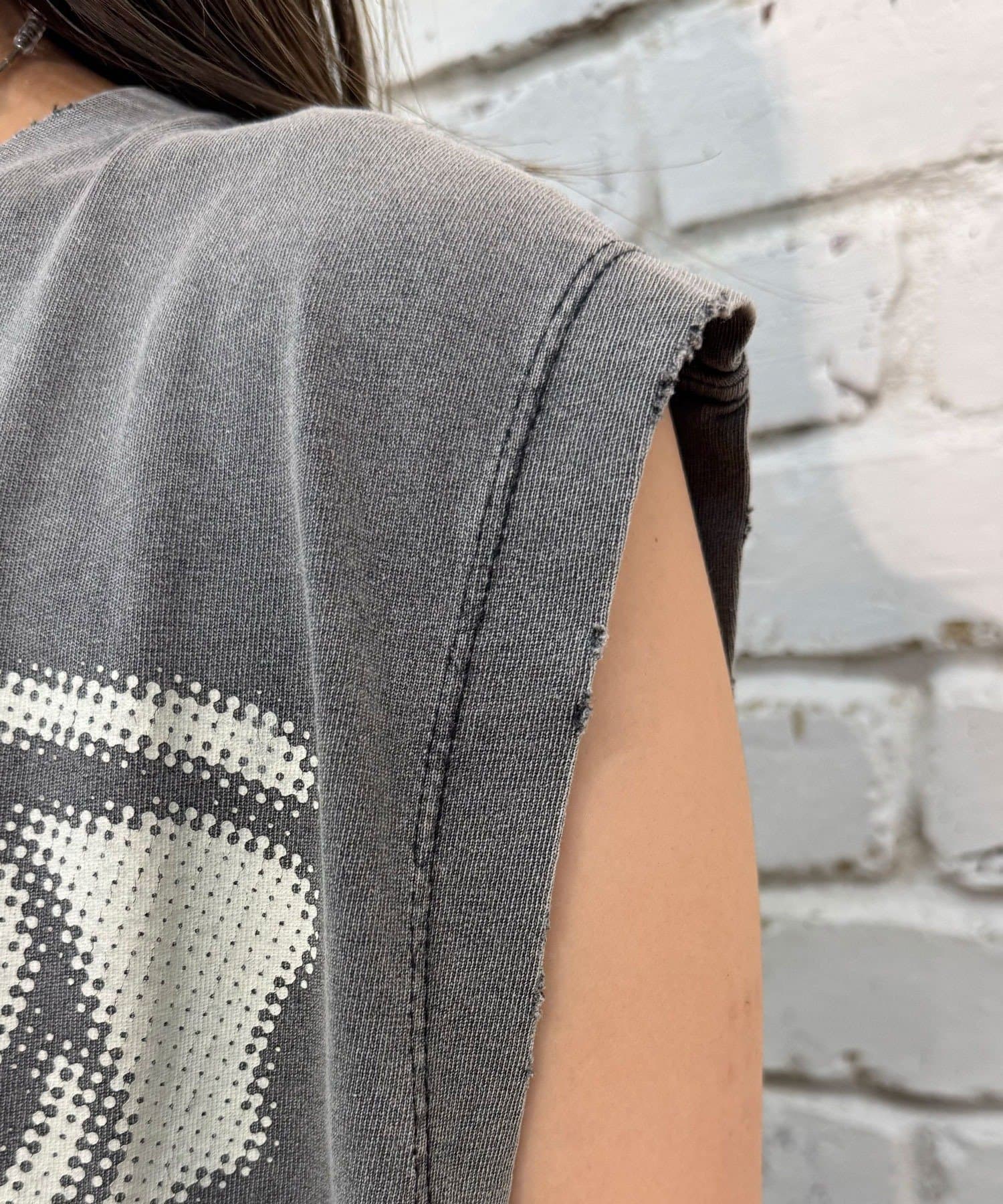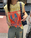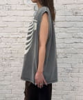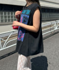 グラフィックの効いたアソートデザインが目を惹くノースリーブTシャツ。