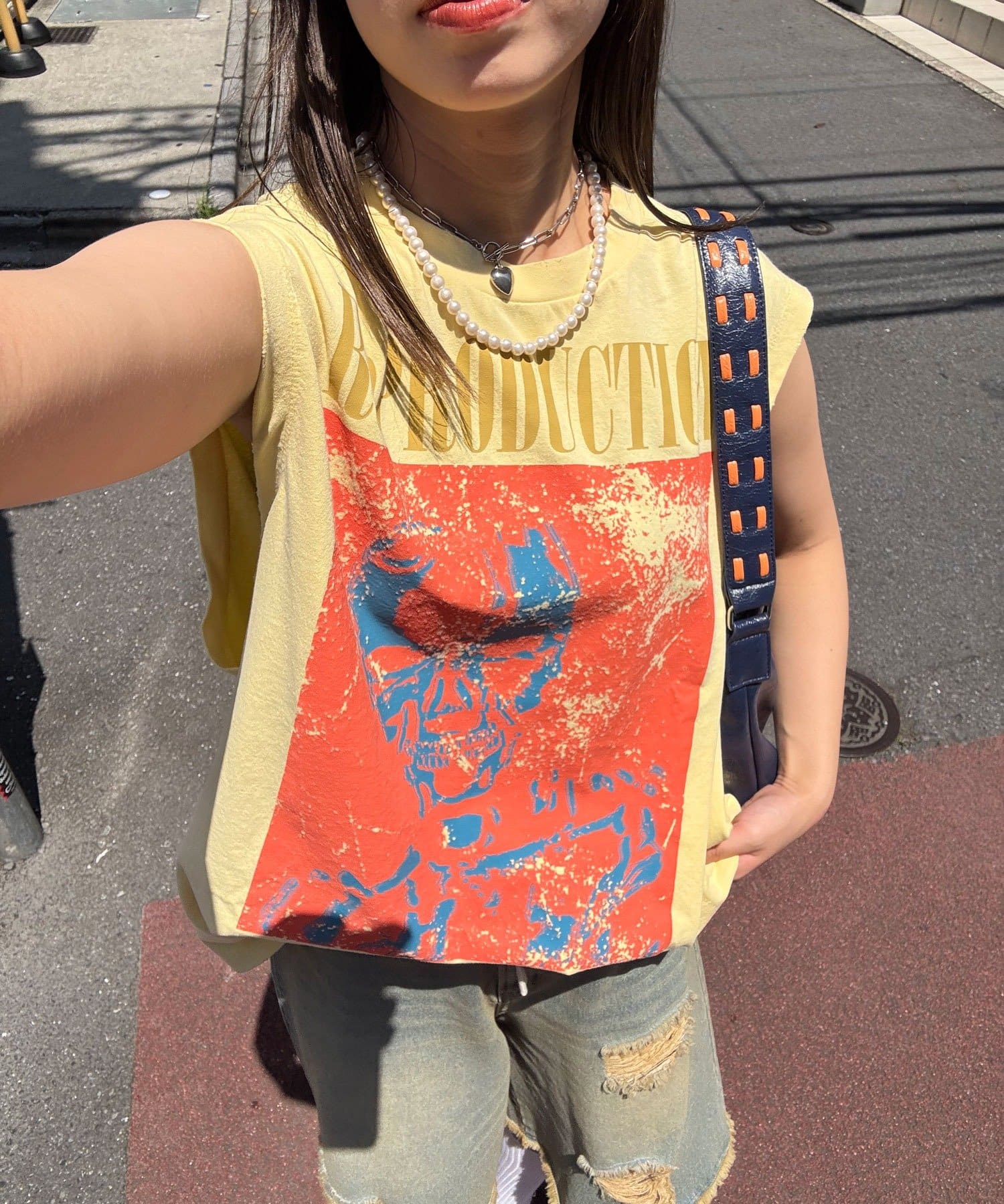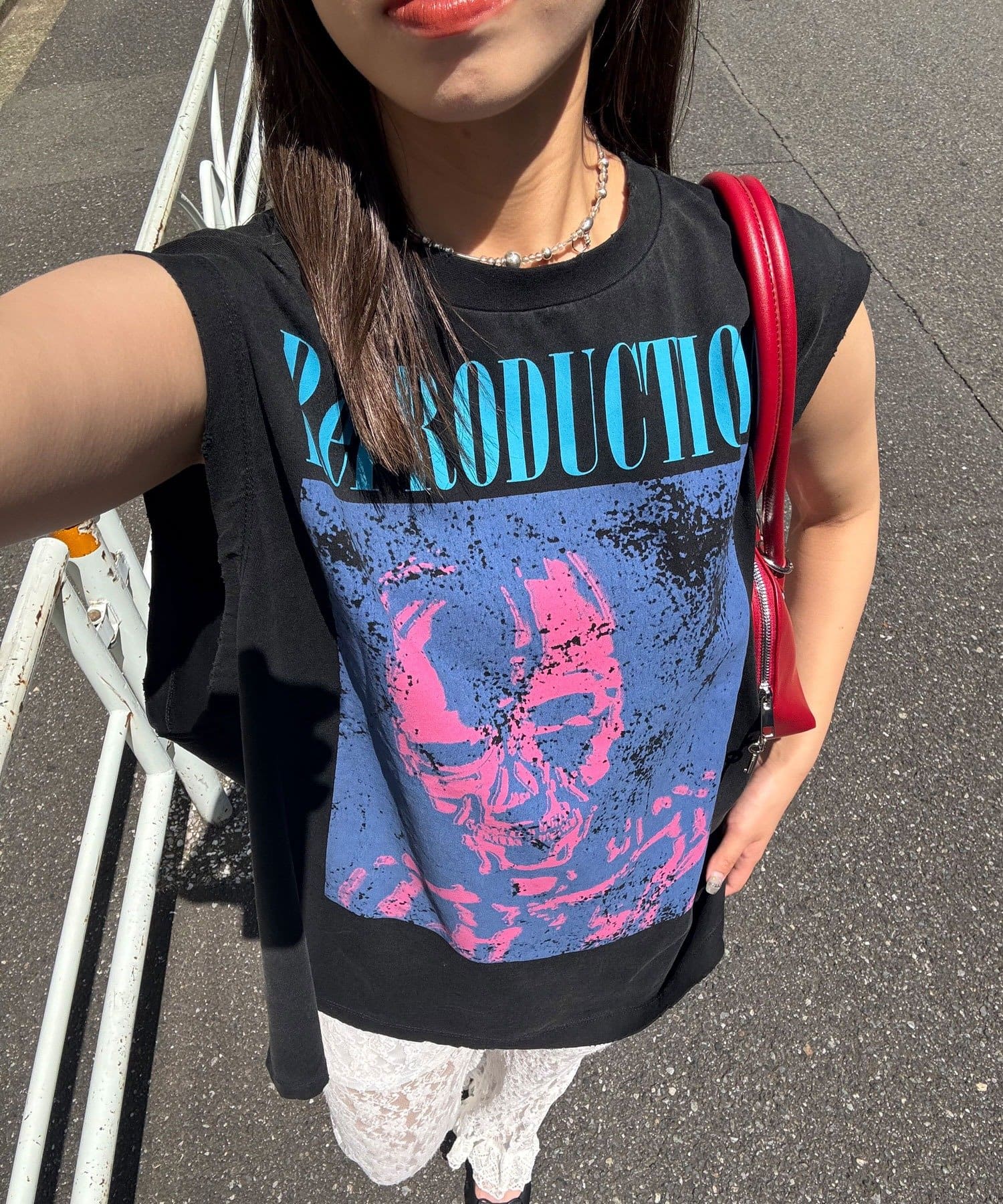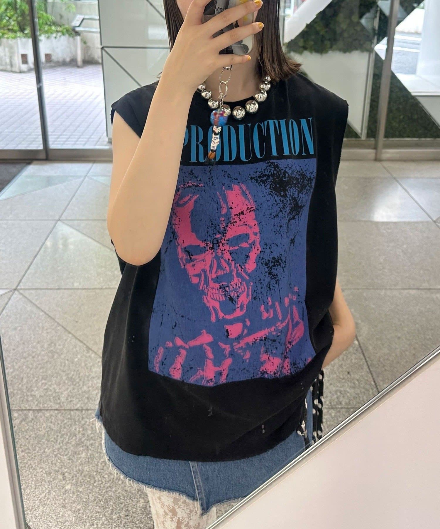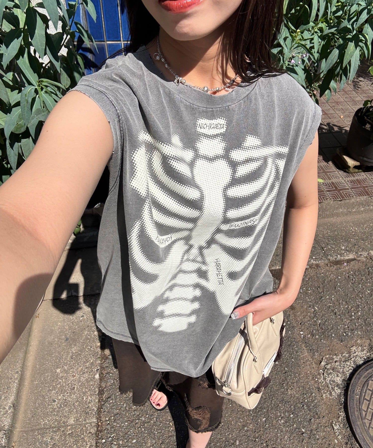 グラフィックの効いたアソートデザインが目を惹くノースリーブTシャツ。
