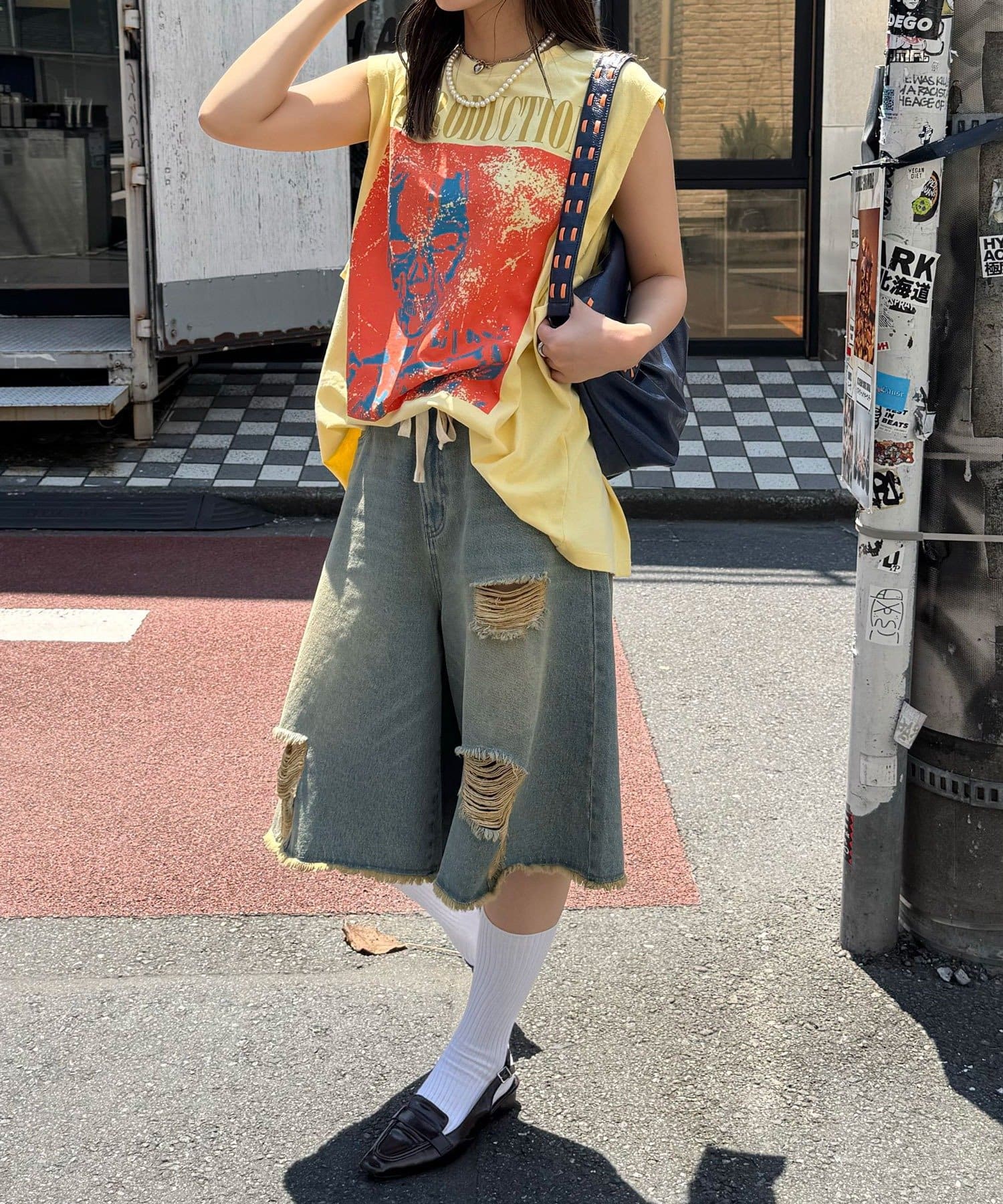 古着っぽいゆるめのボトムや、ワークパンツと合わせた、ラフなストリートスタイルがおすすめです。