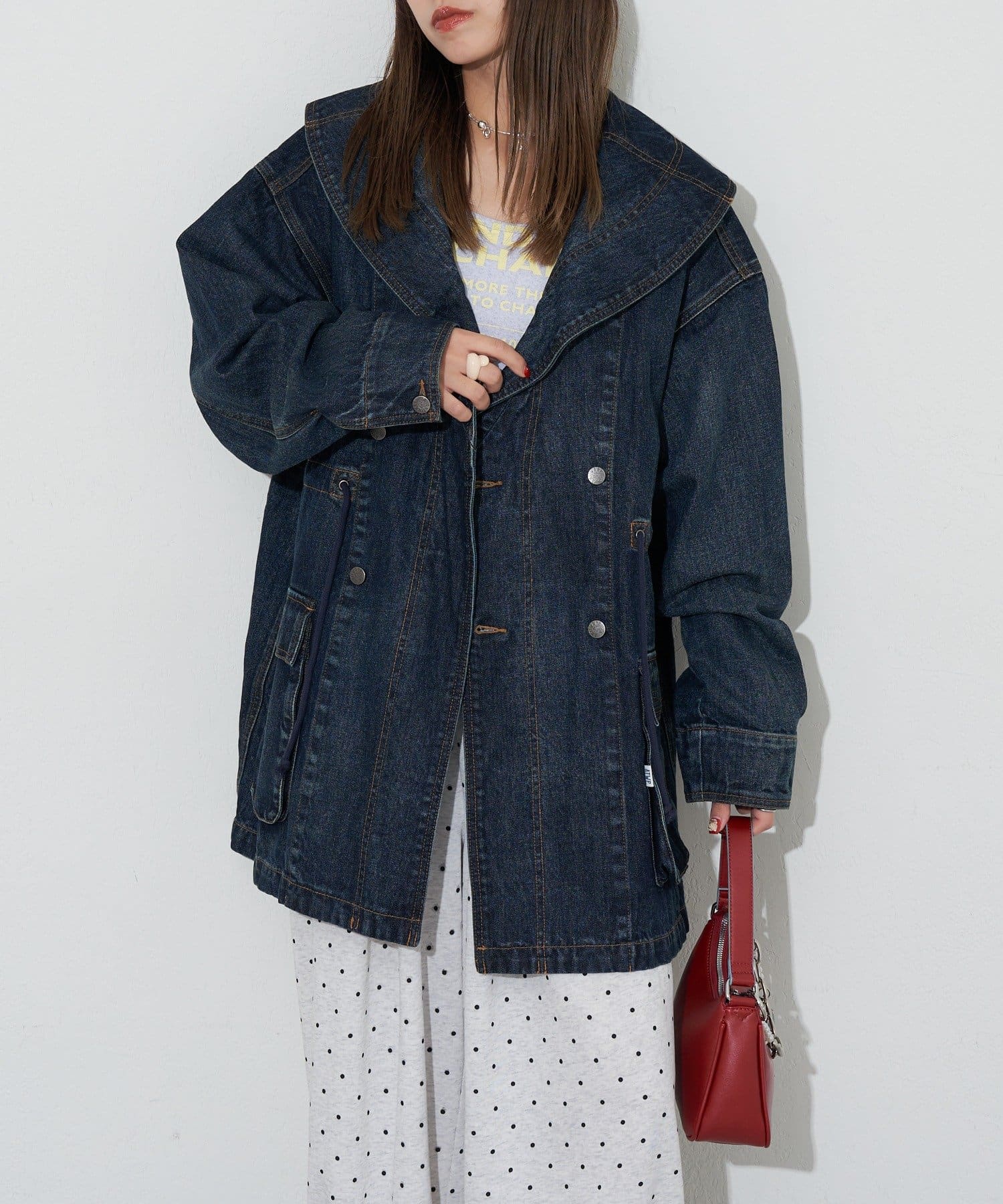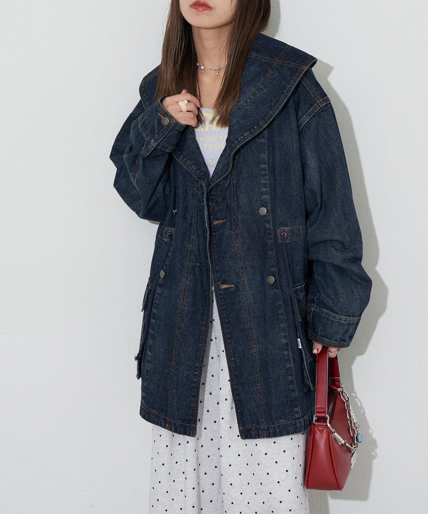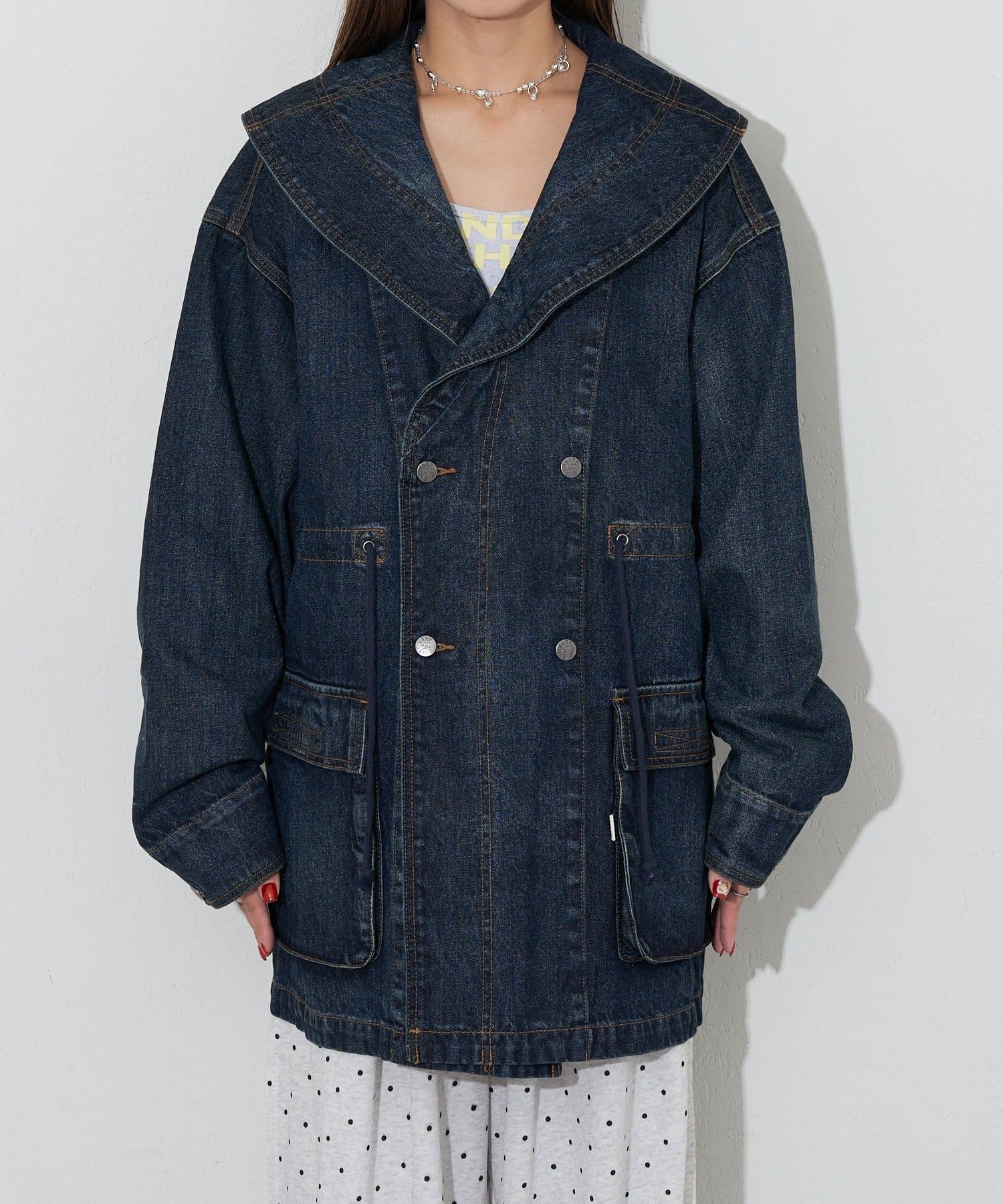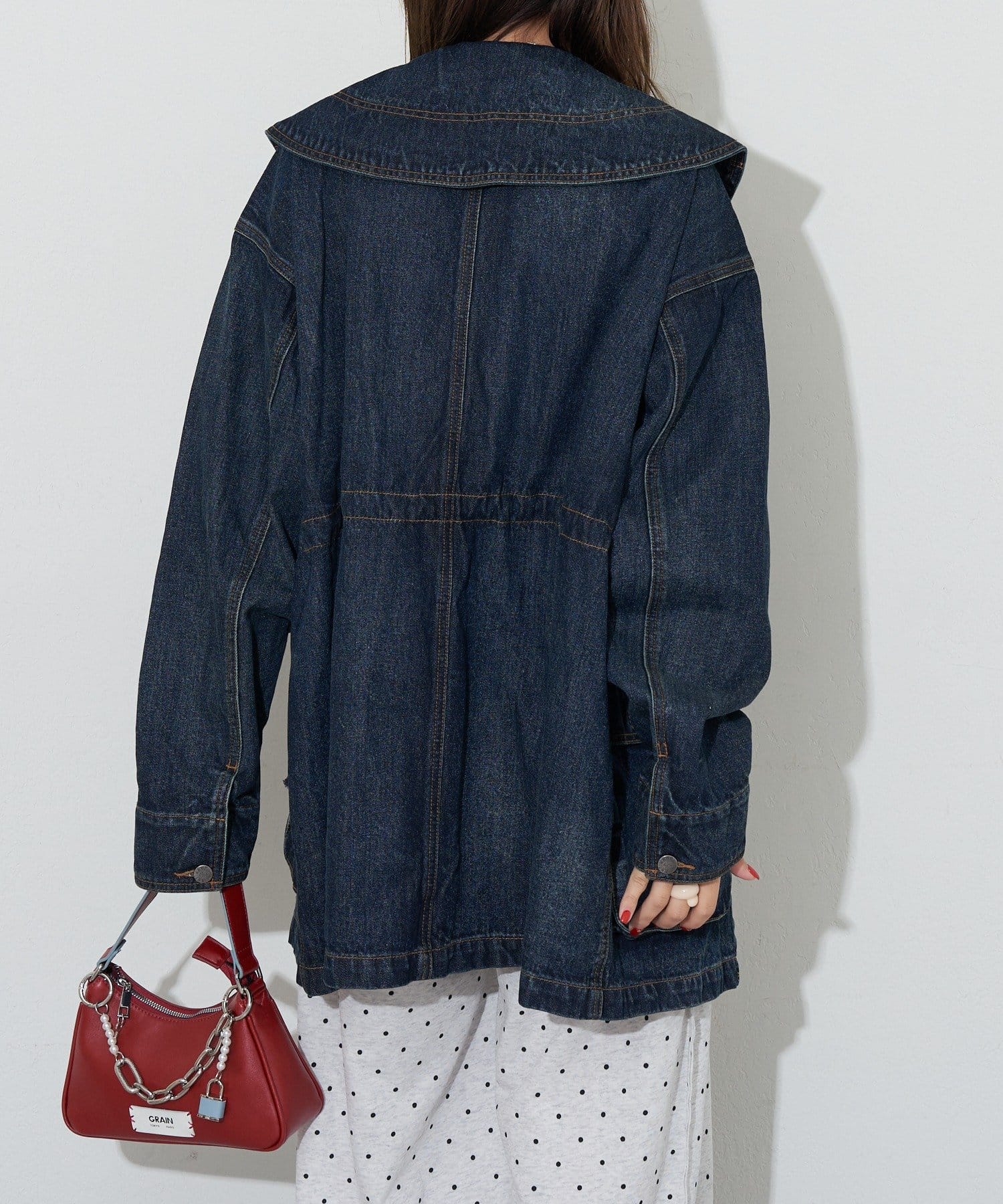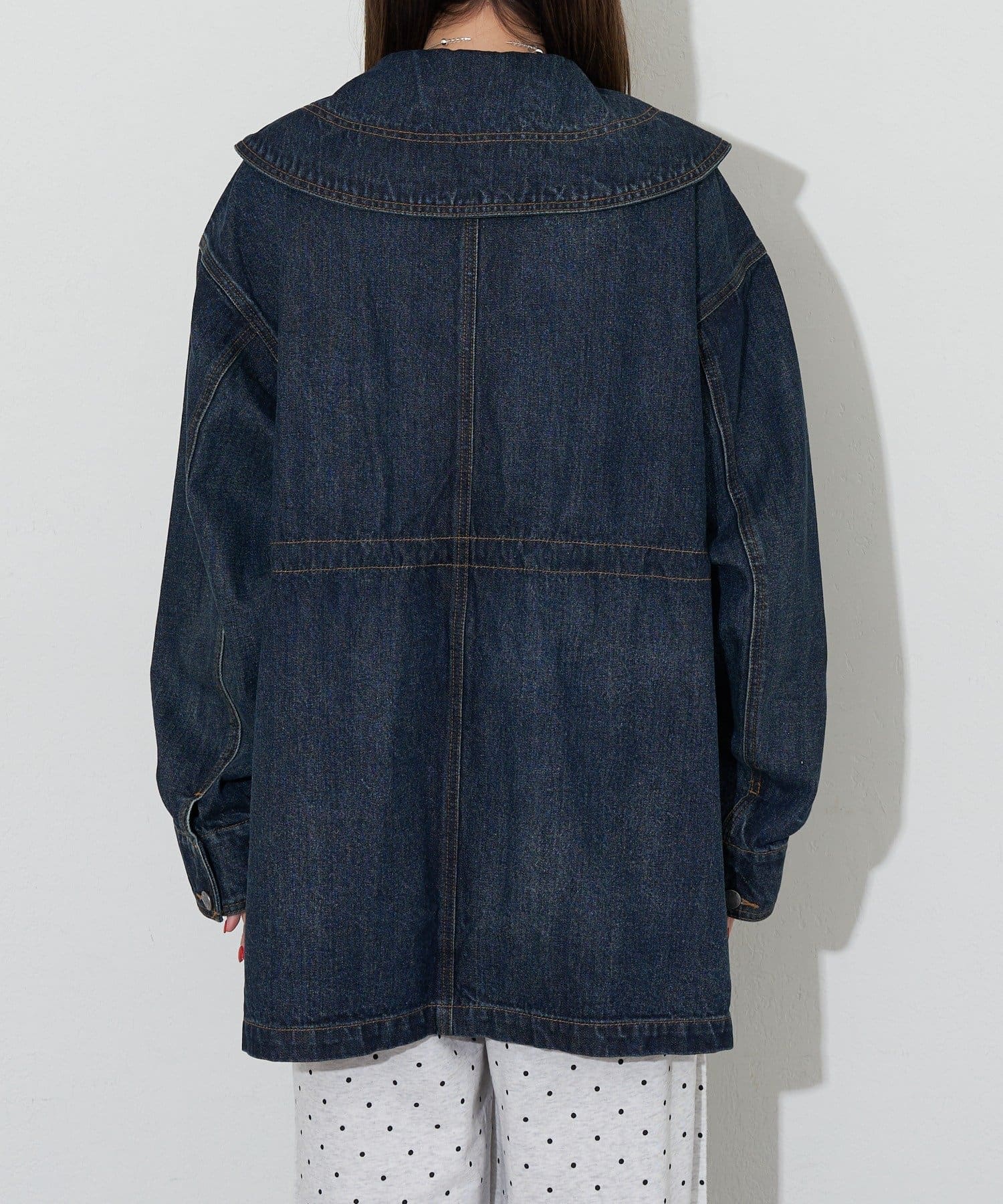 存在感たっぷりのビッグショールカラーが目を引く、フィールドジャケット風デニムアウター。