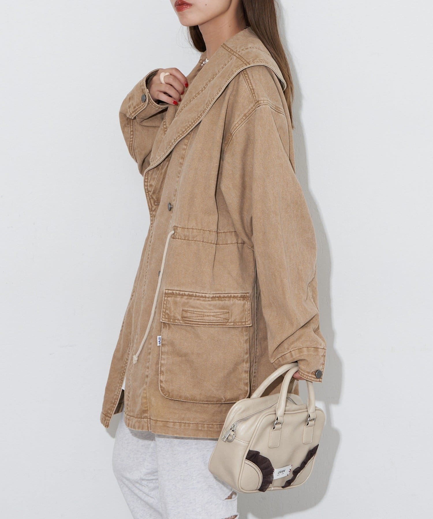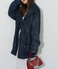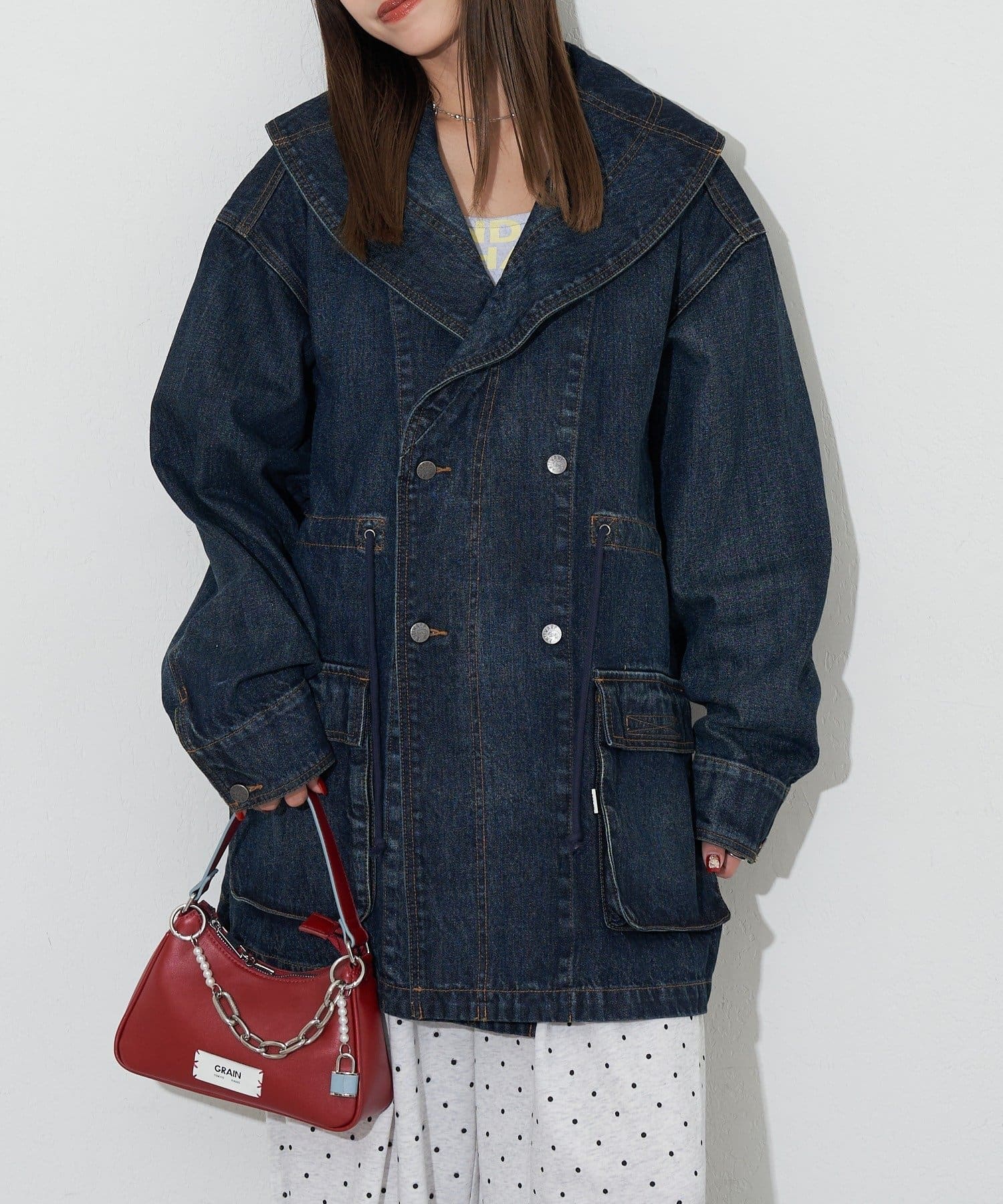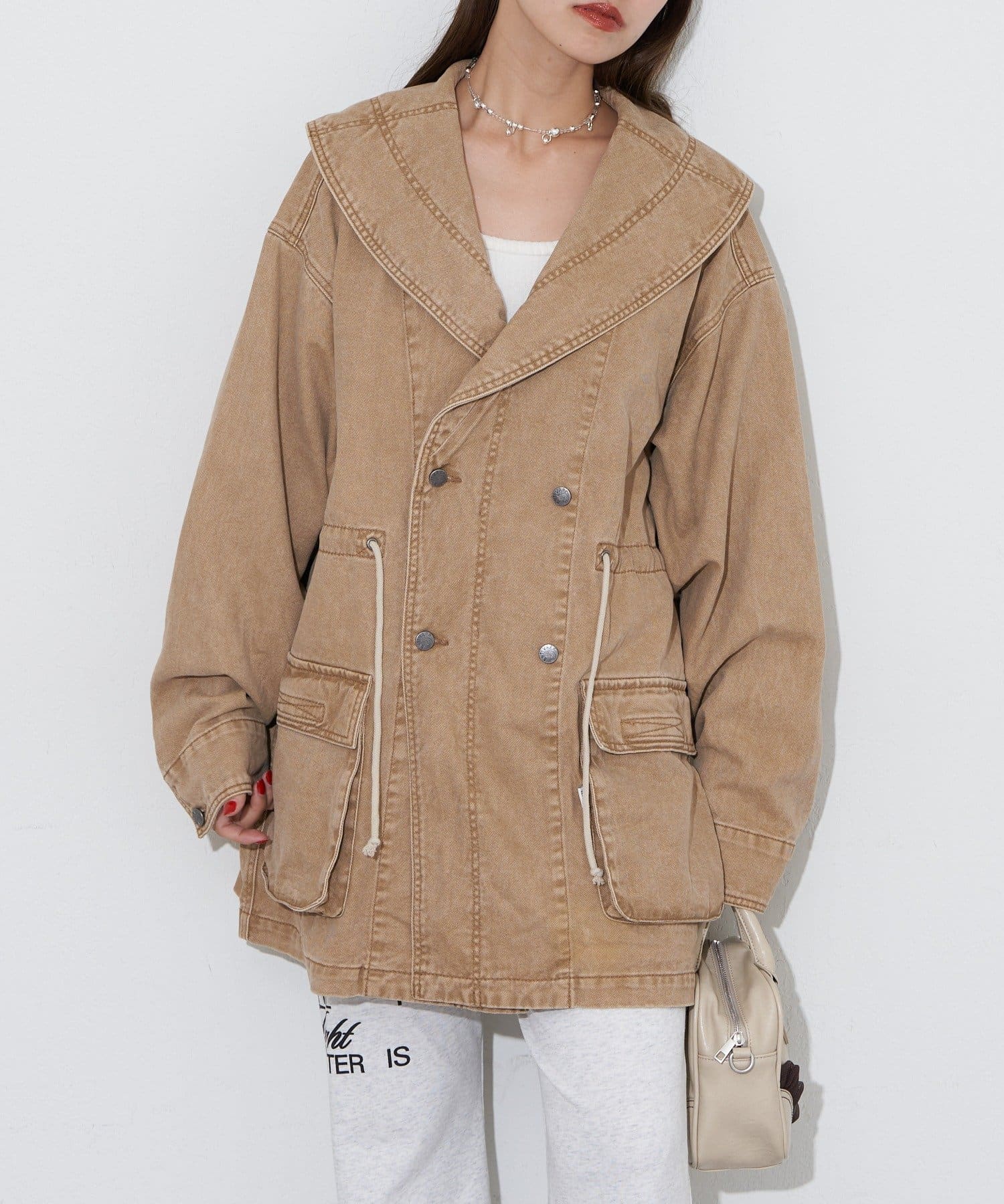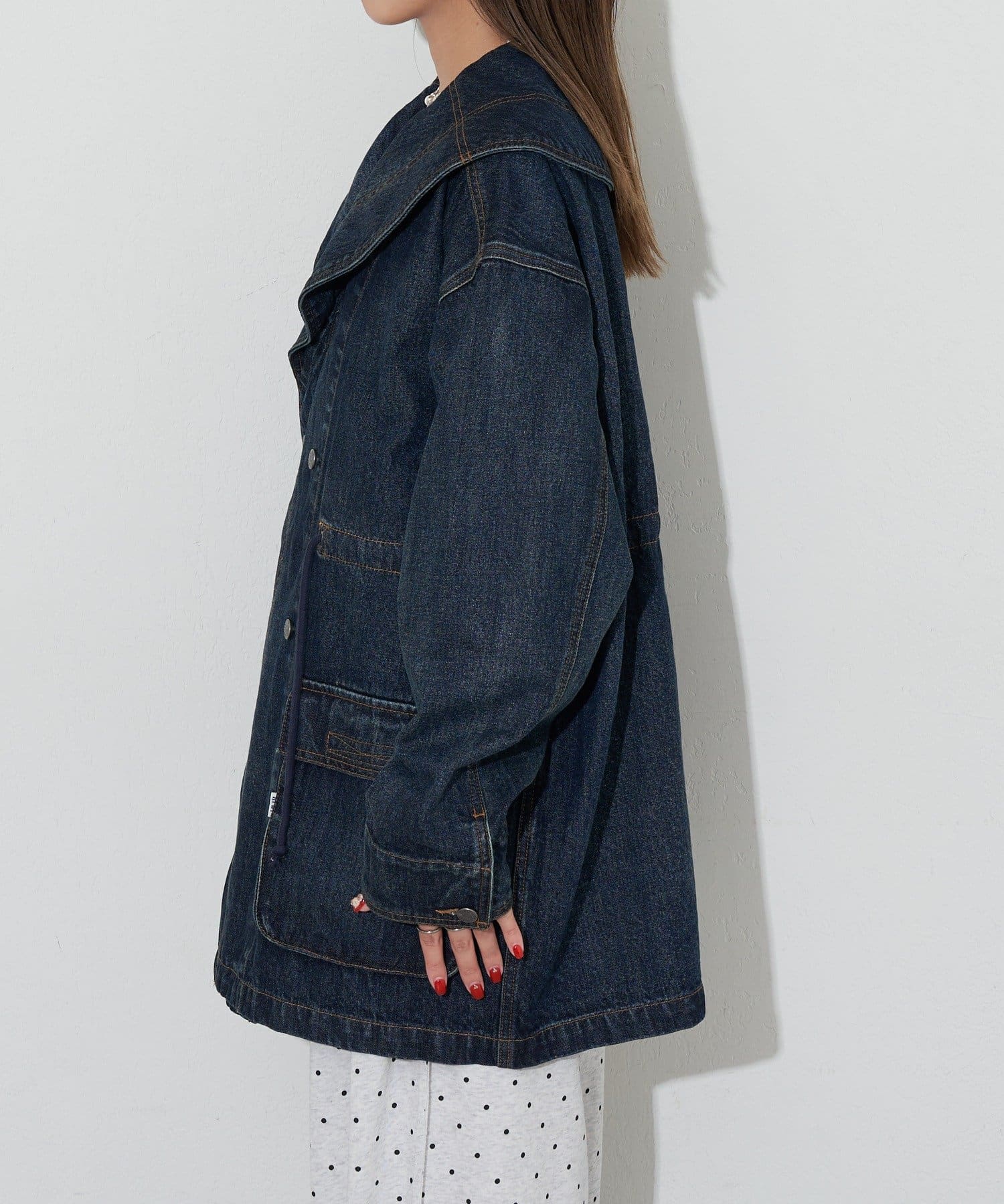 存在感たっぷりのビッグショールカラーが目を引く、フィールドジャケット風デニムアウター。