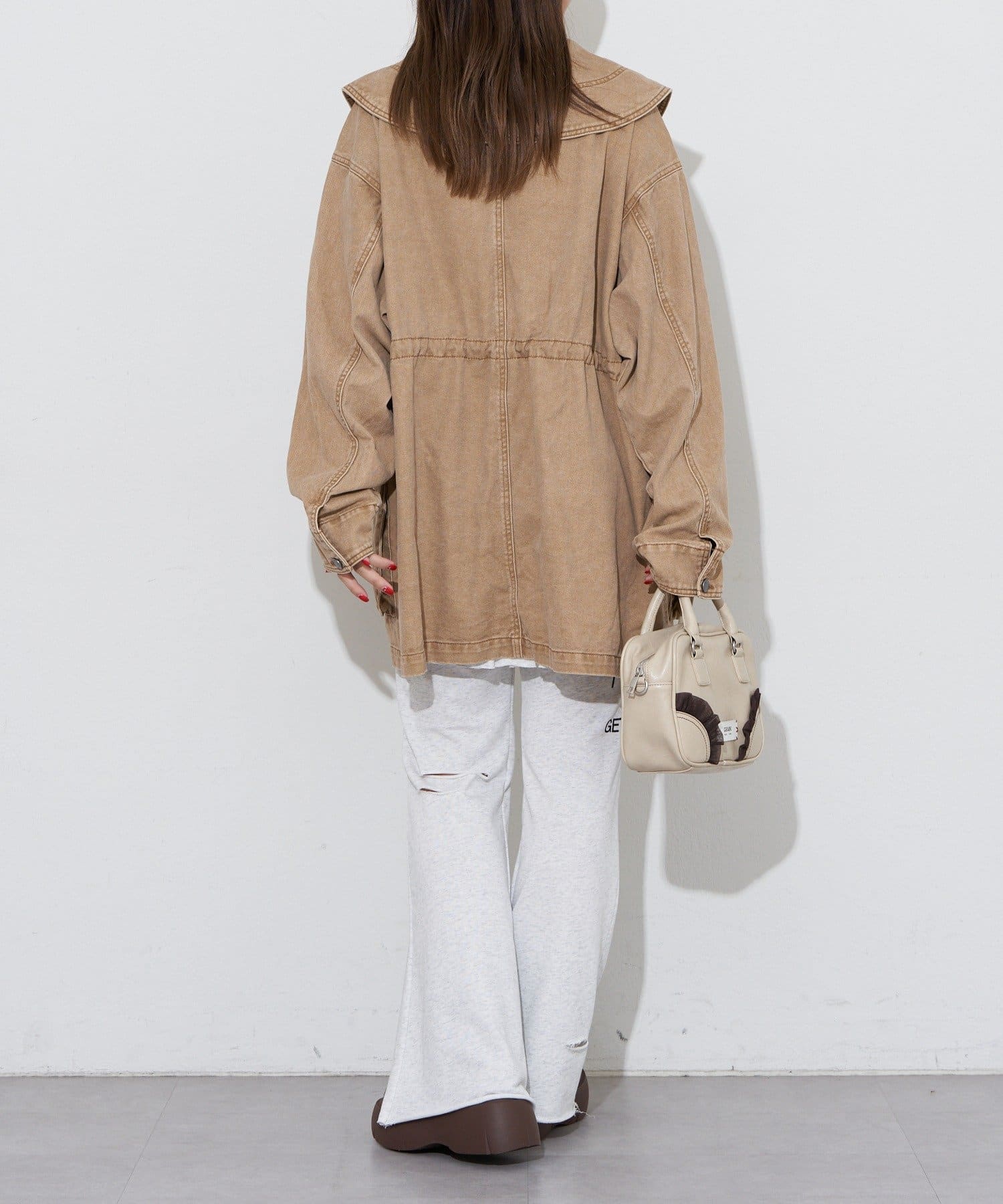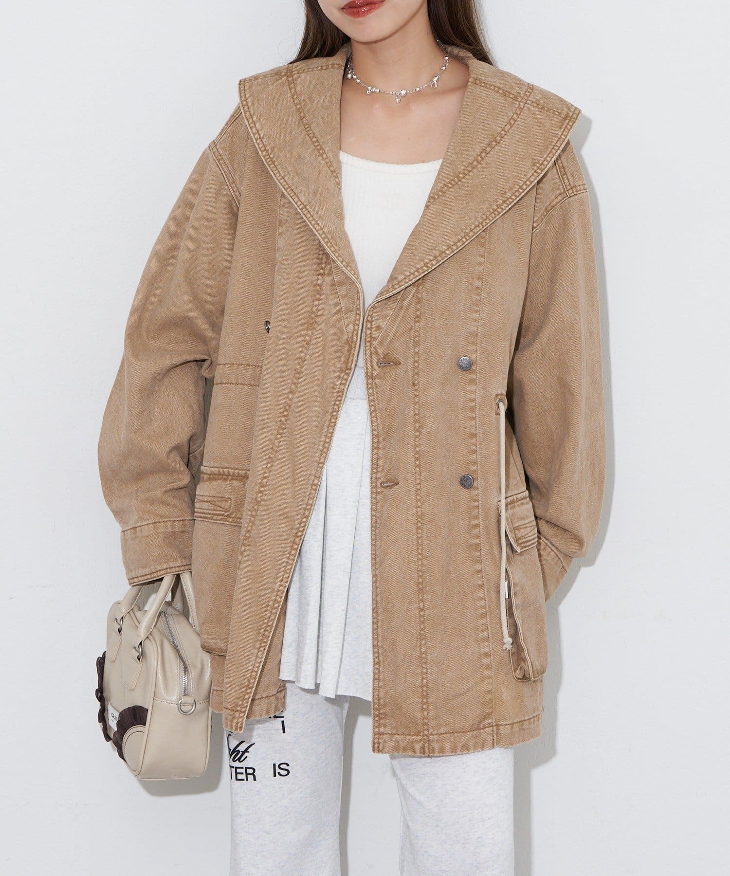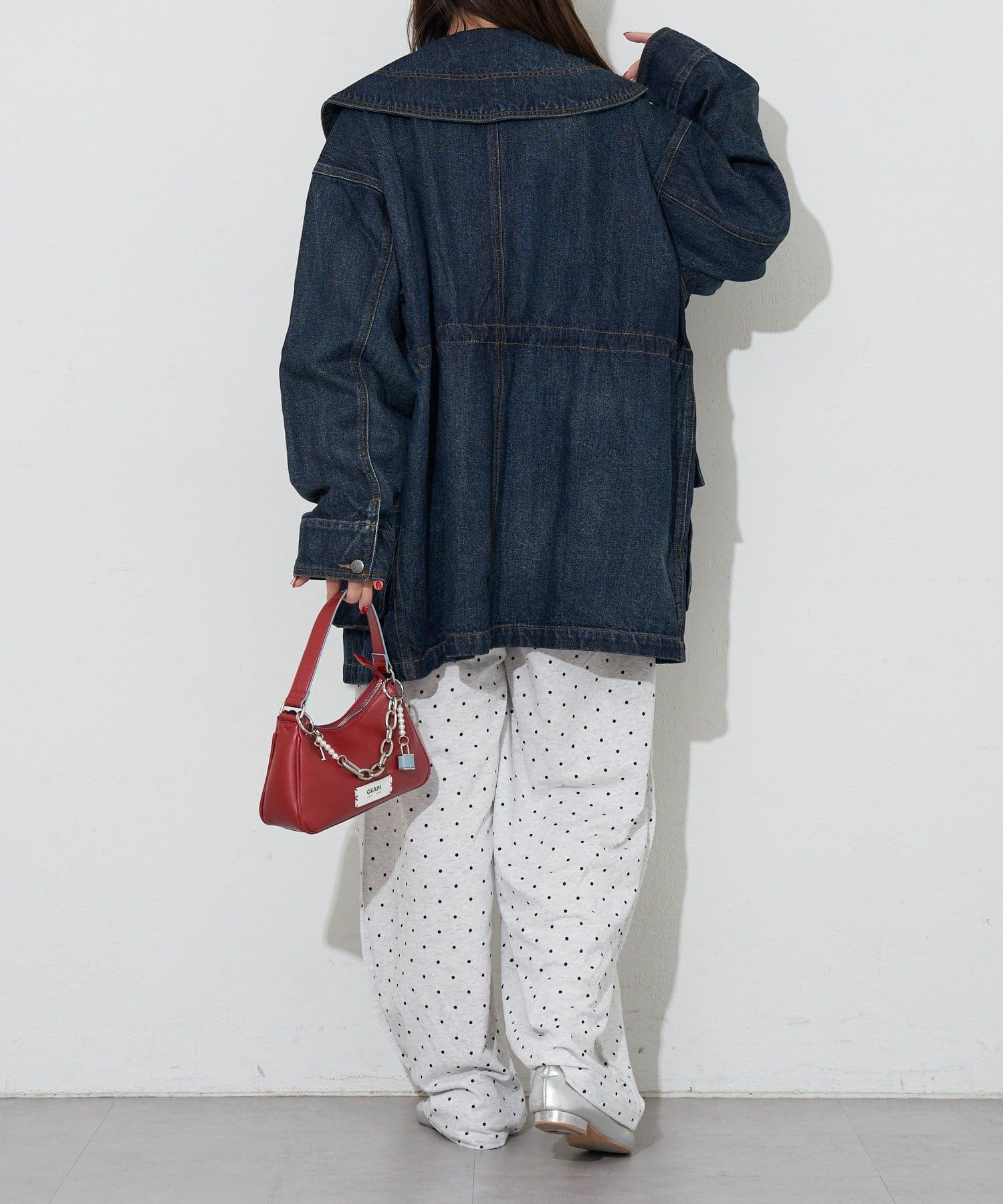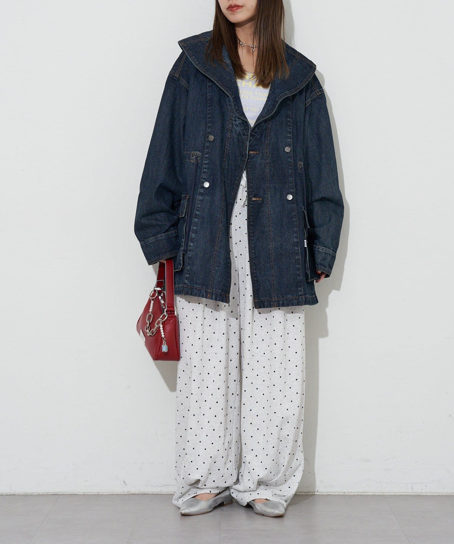 存在感たっぷりのビッグショールカラーが目を引く、フィールドジャケット風デニムアウター。