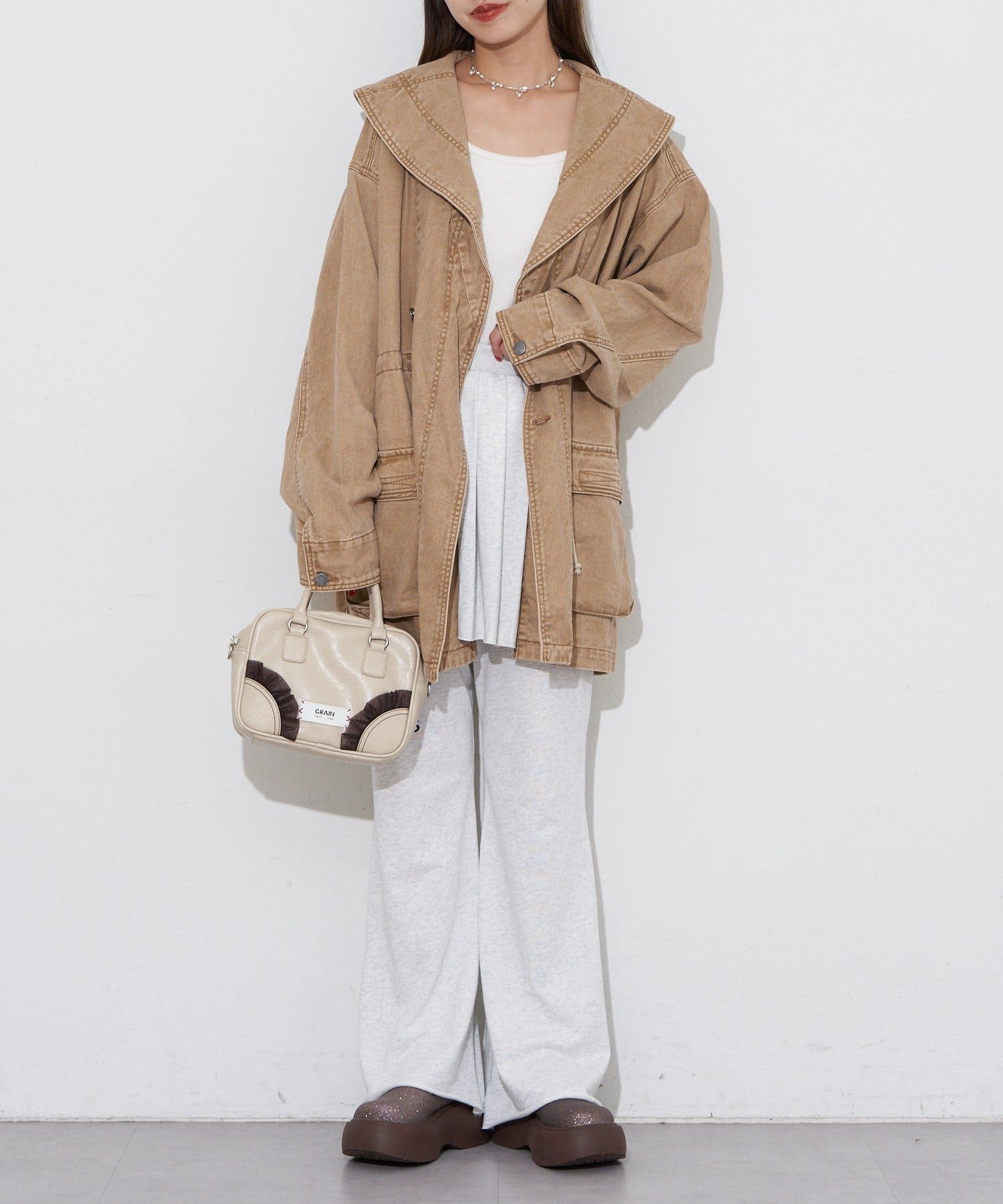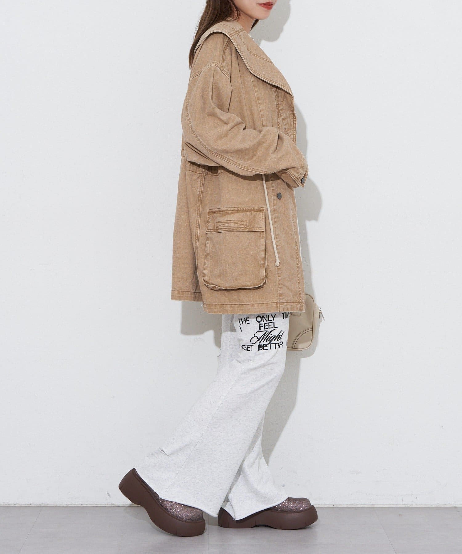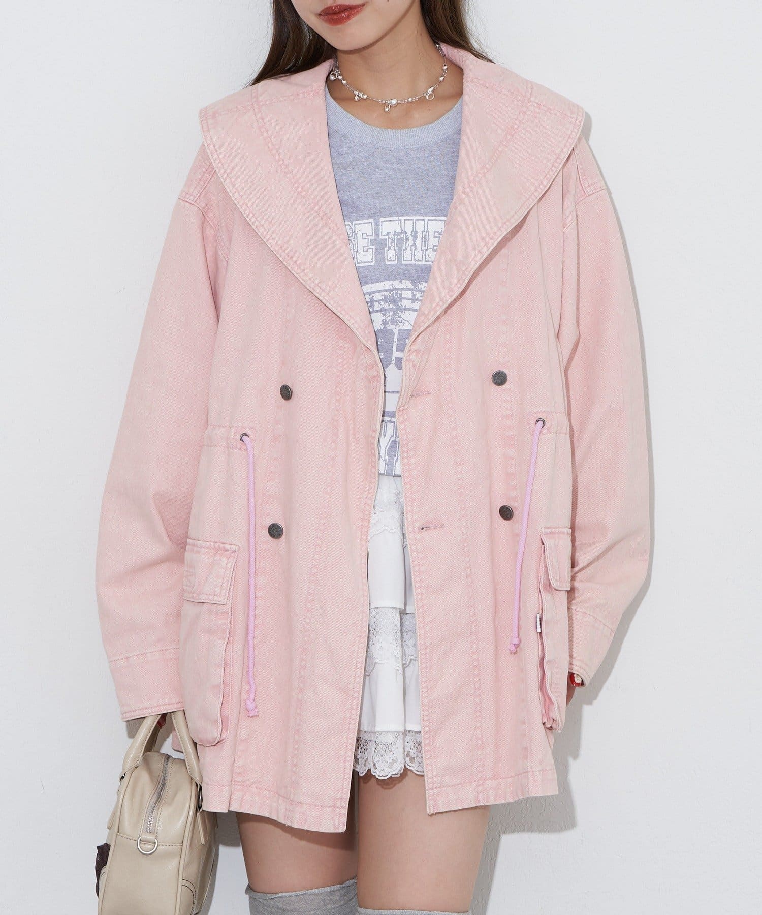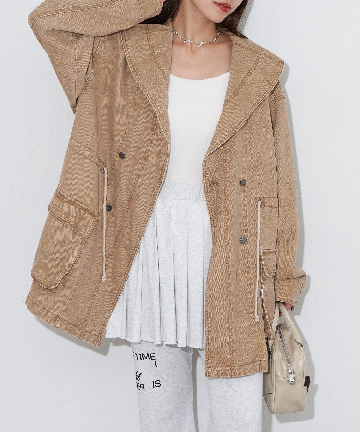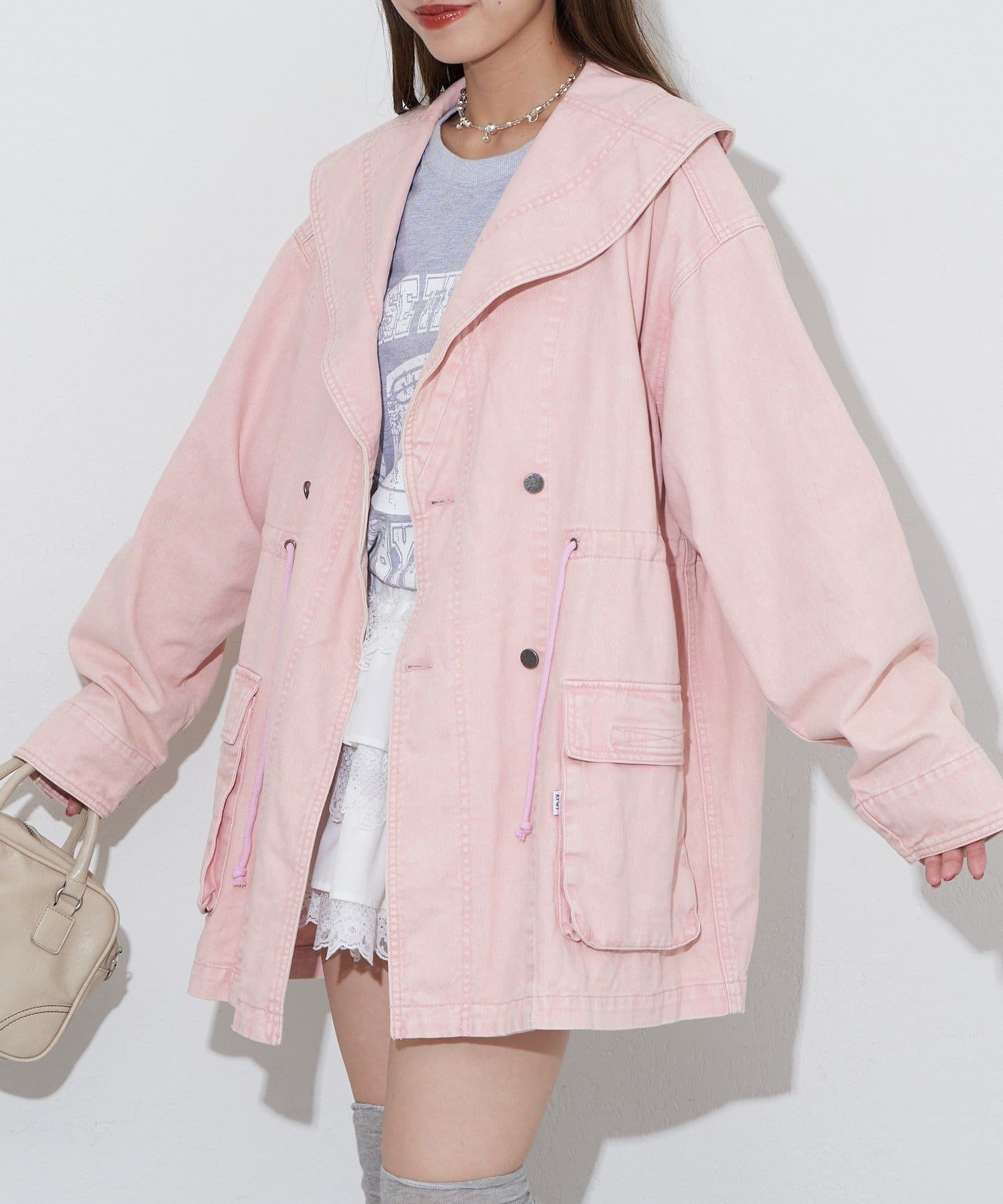 存在感たっぷりのビッグショールカラーが目を引く、フィールドジャケット風デニムアウター。
