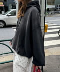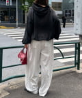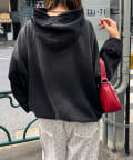 フード付きならではの立体感に加え、首元から覗くタグがスタイリングのワンポイントに。