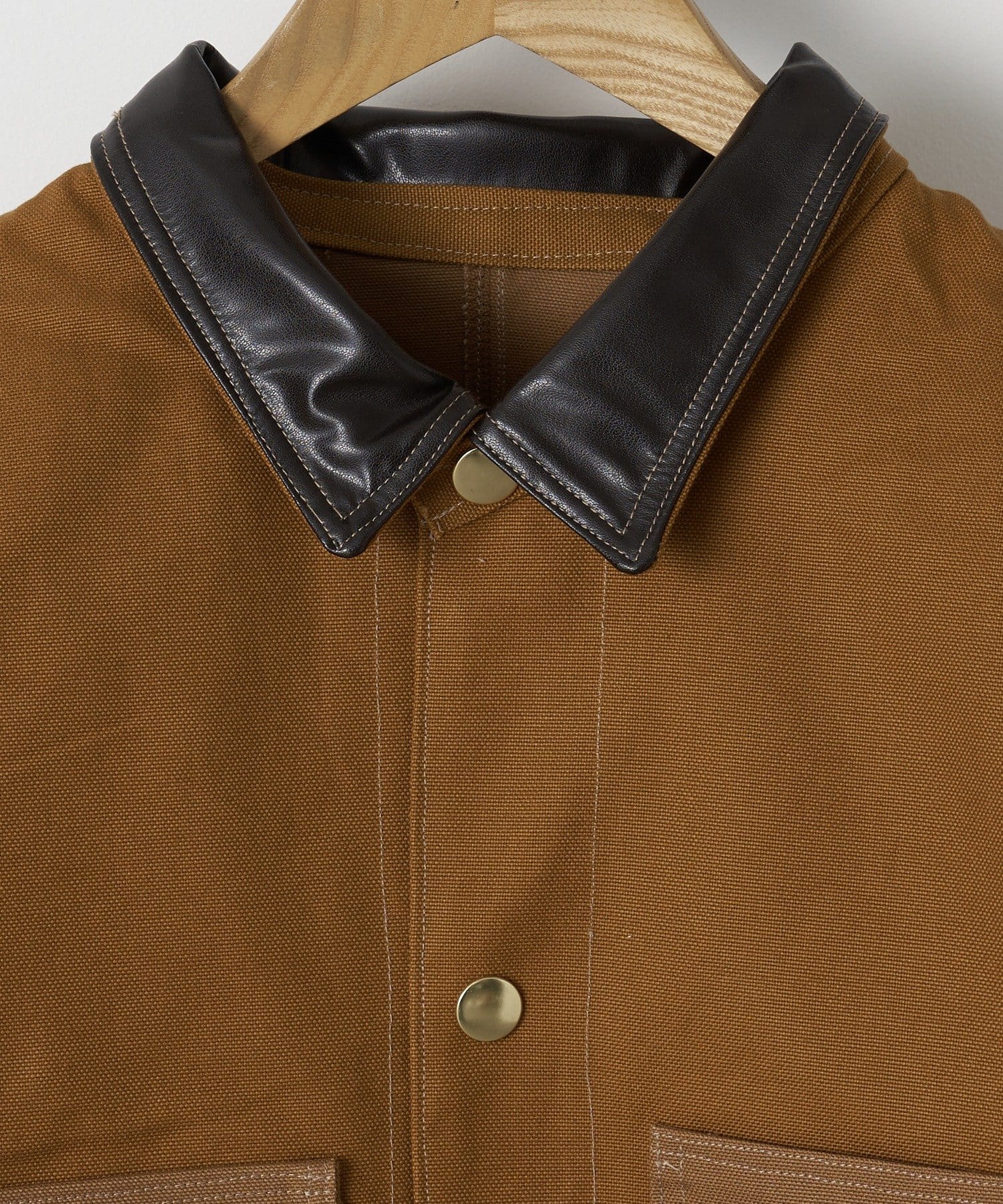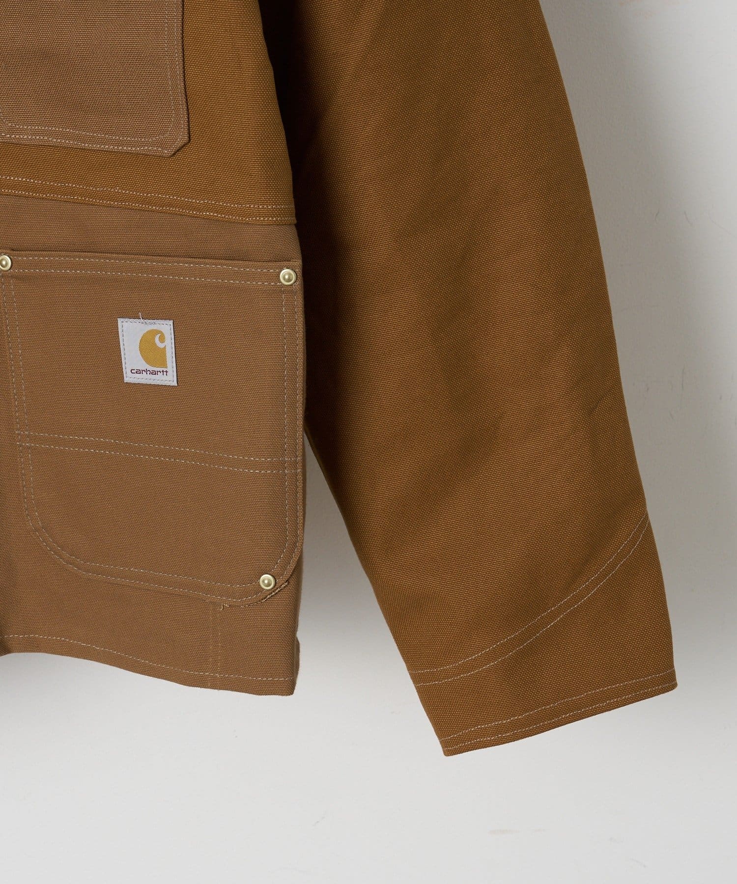 USカーハートのダブルニーパンツを解体し、カバーオールジャケットにアップサイクルした一着。