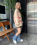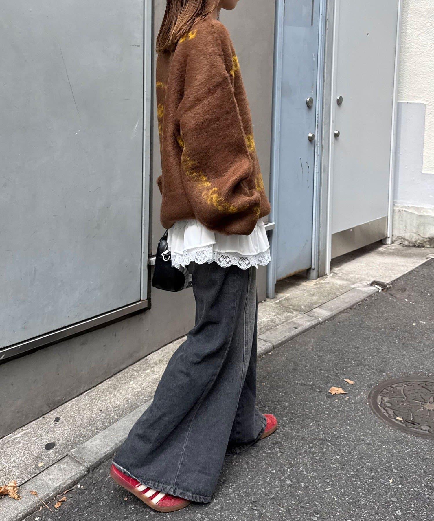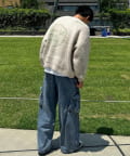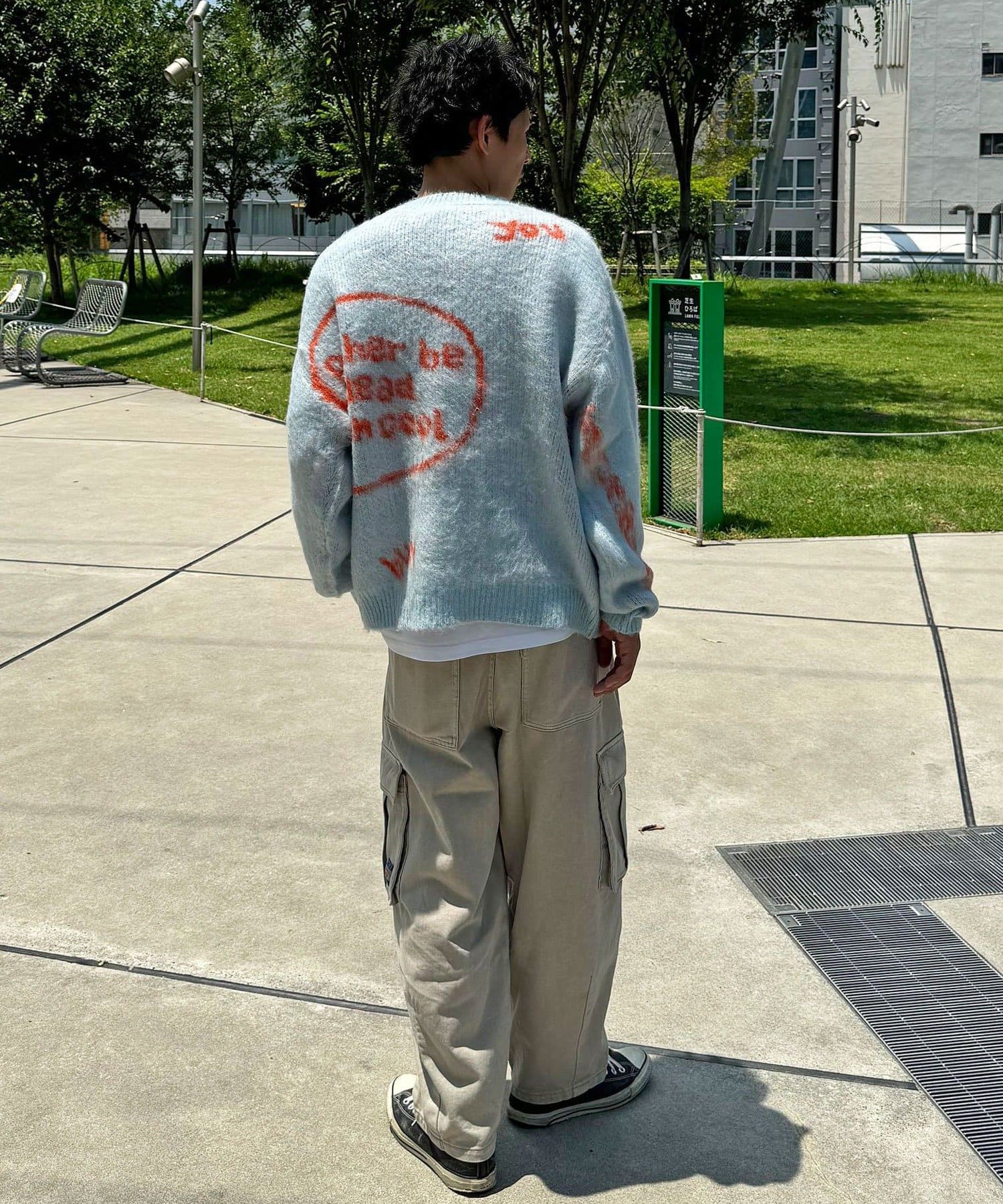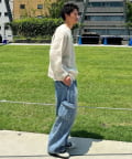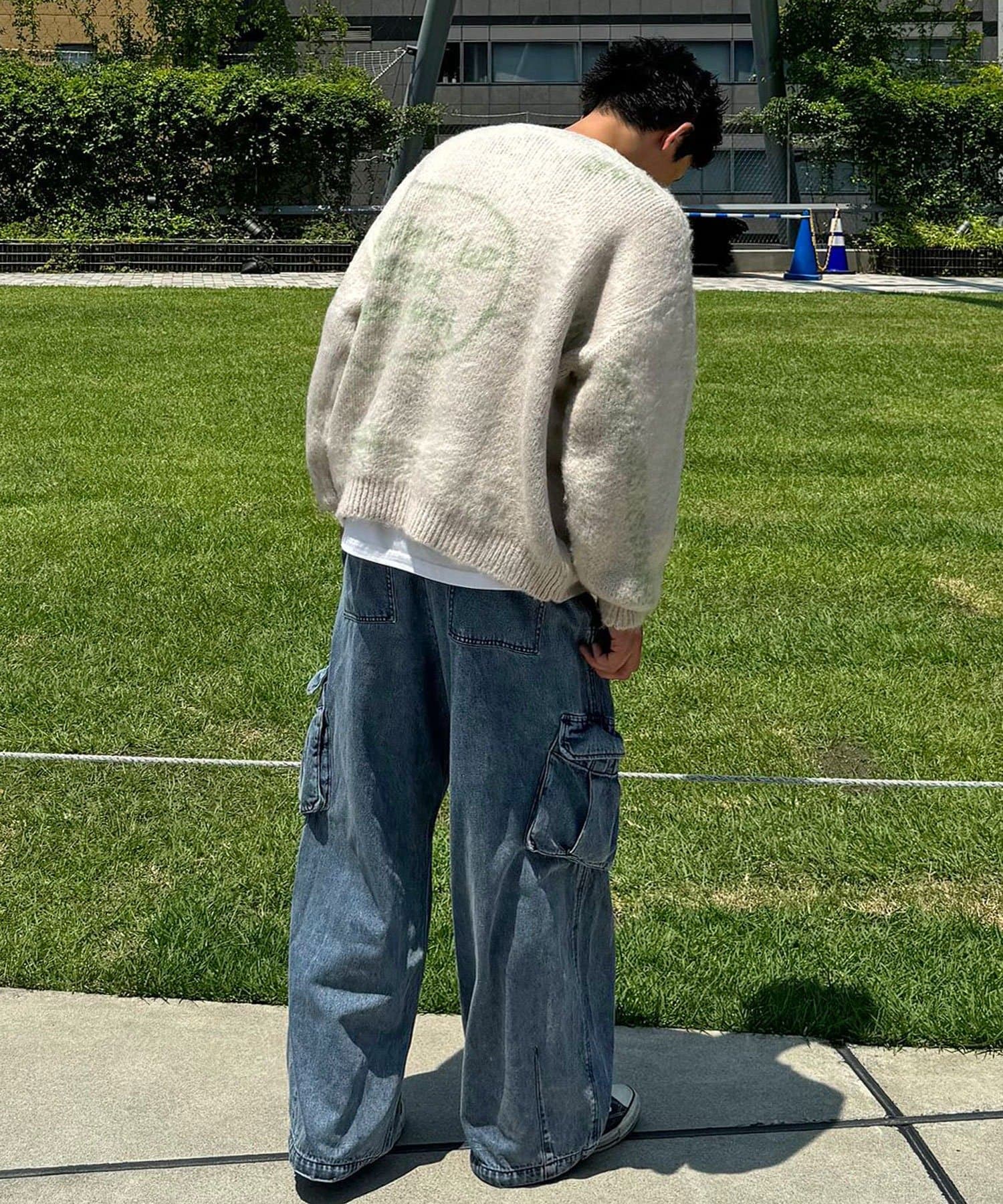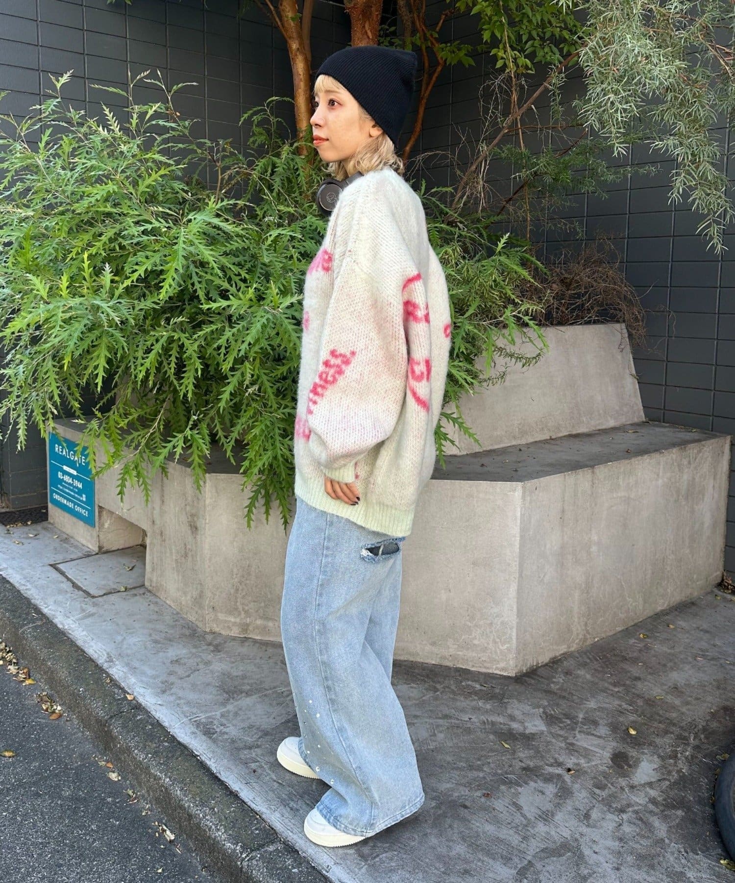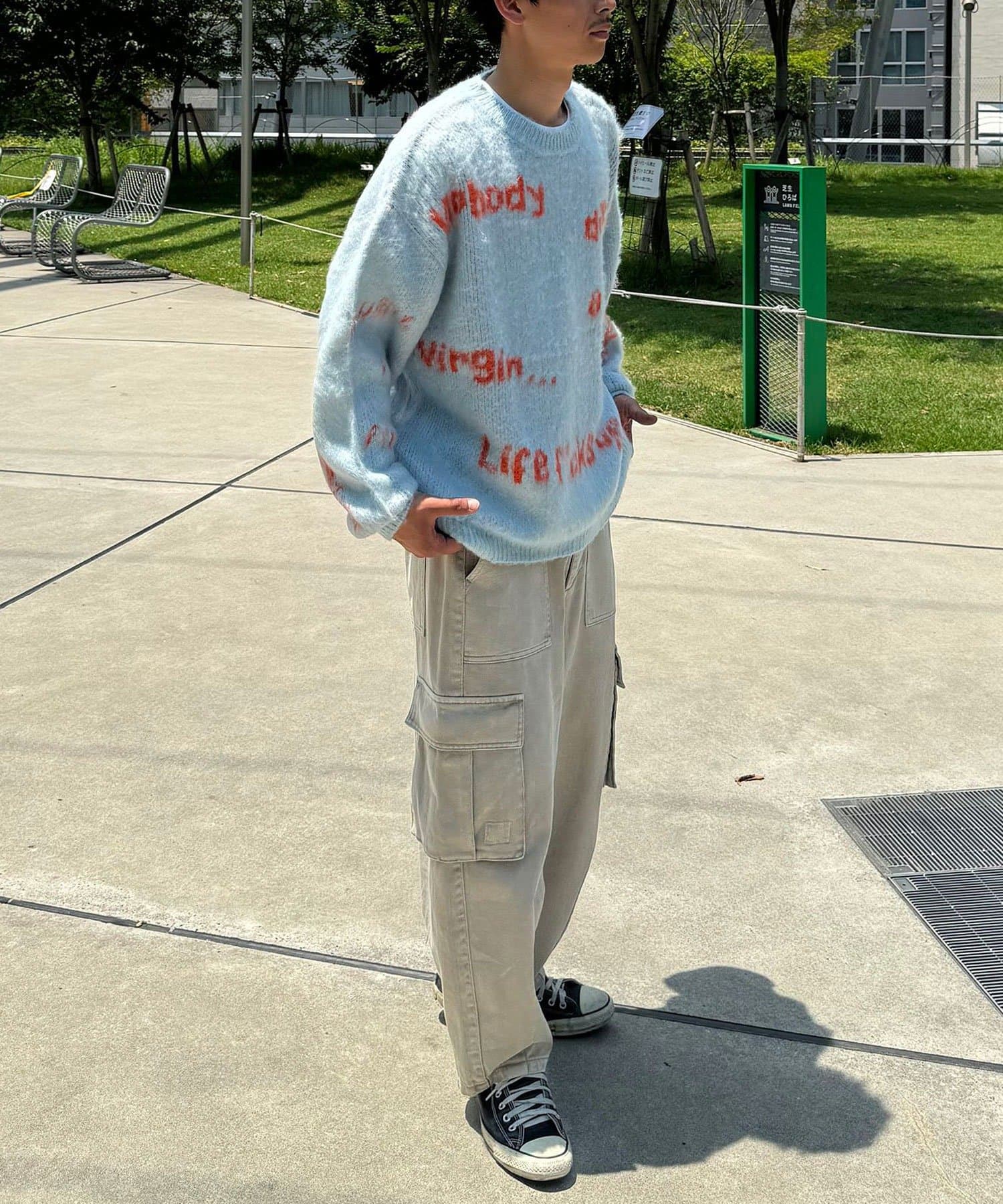 存在感のあるニットなのでボトムスはシンプルなデニムパンツやカーゴパンツ合わせがおすすめです。