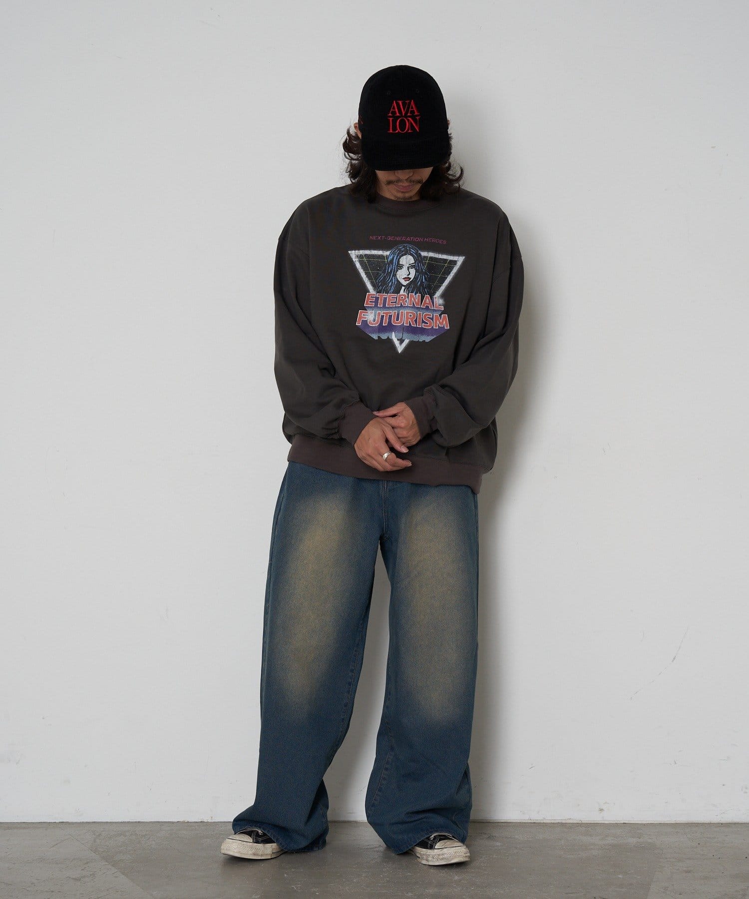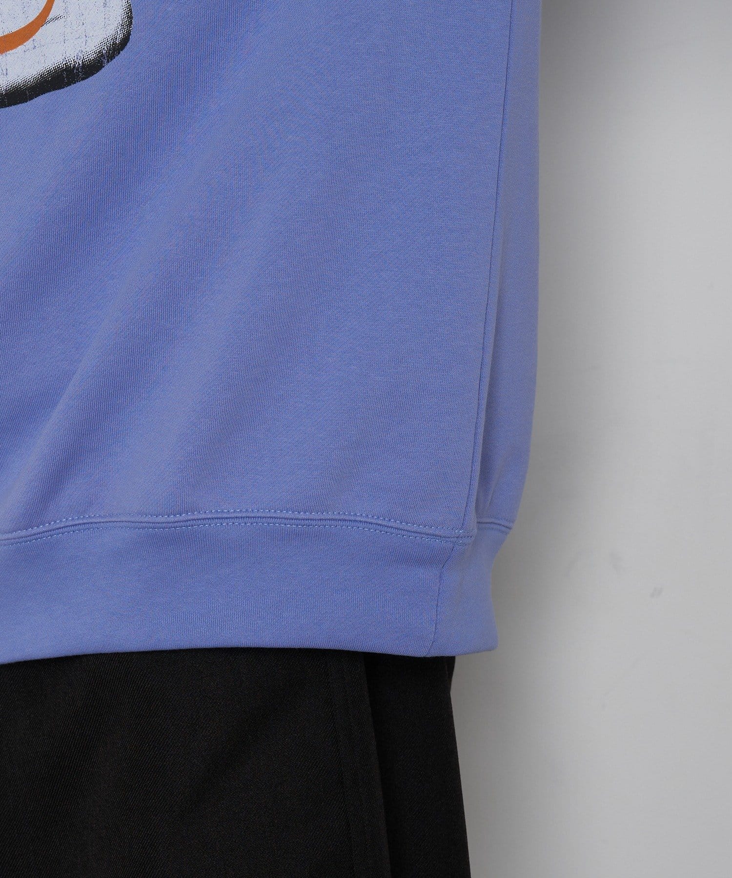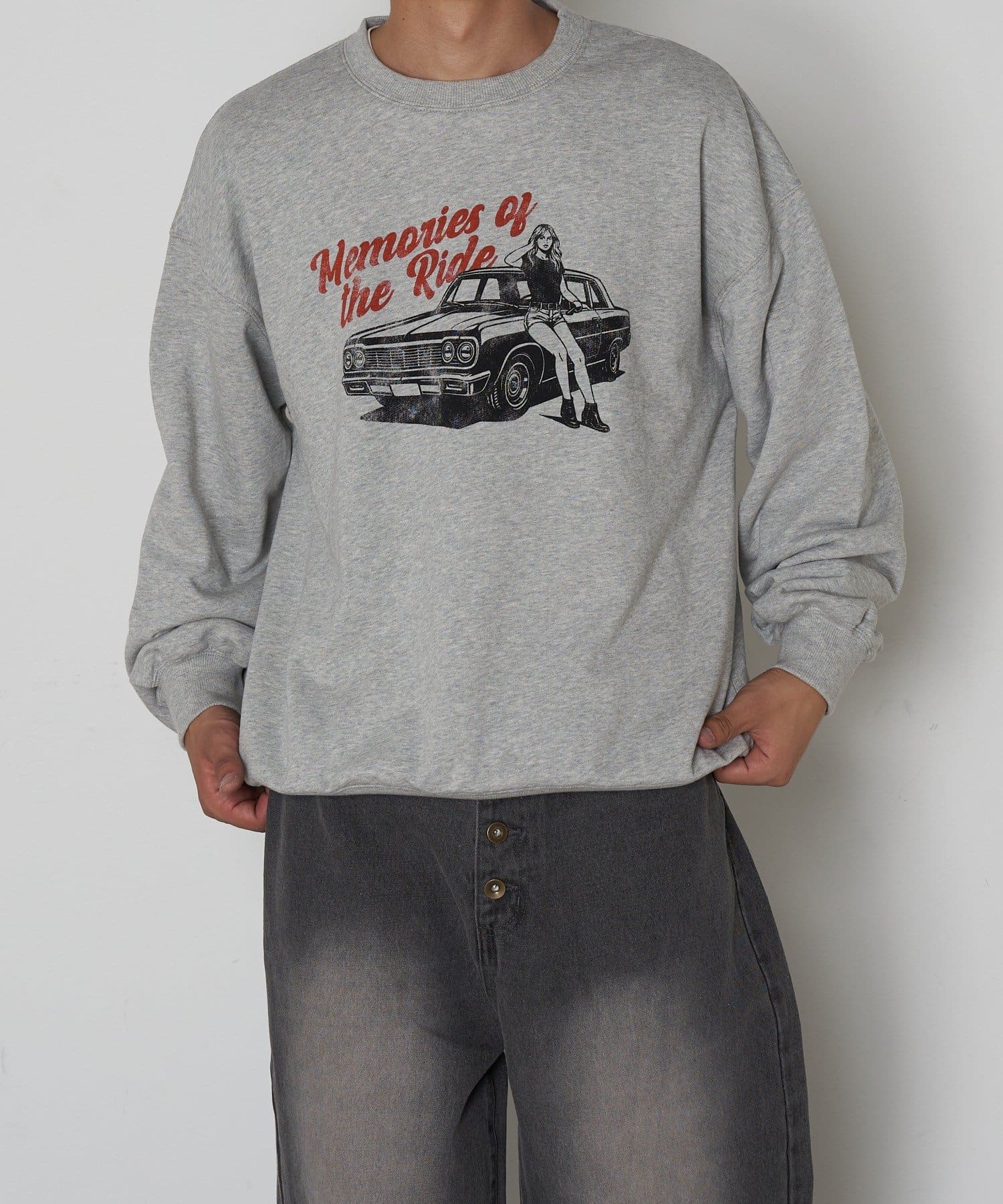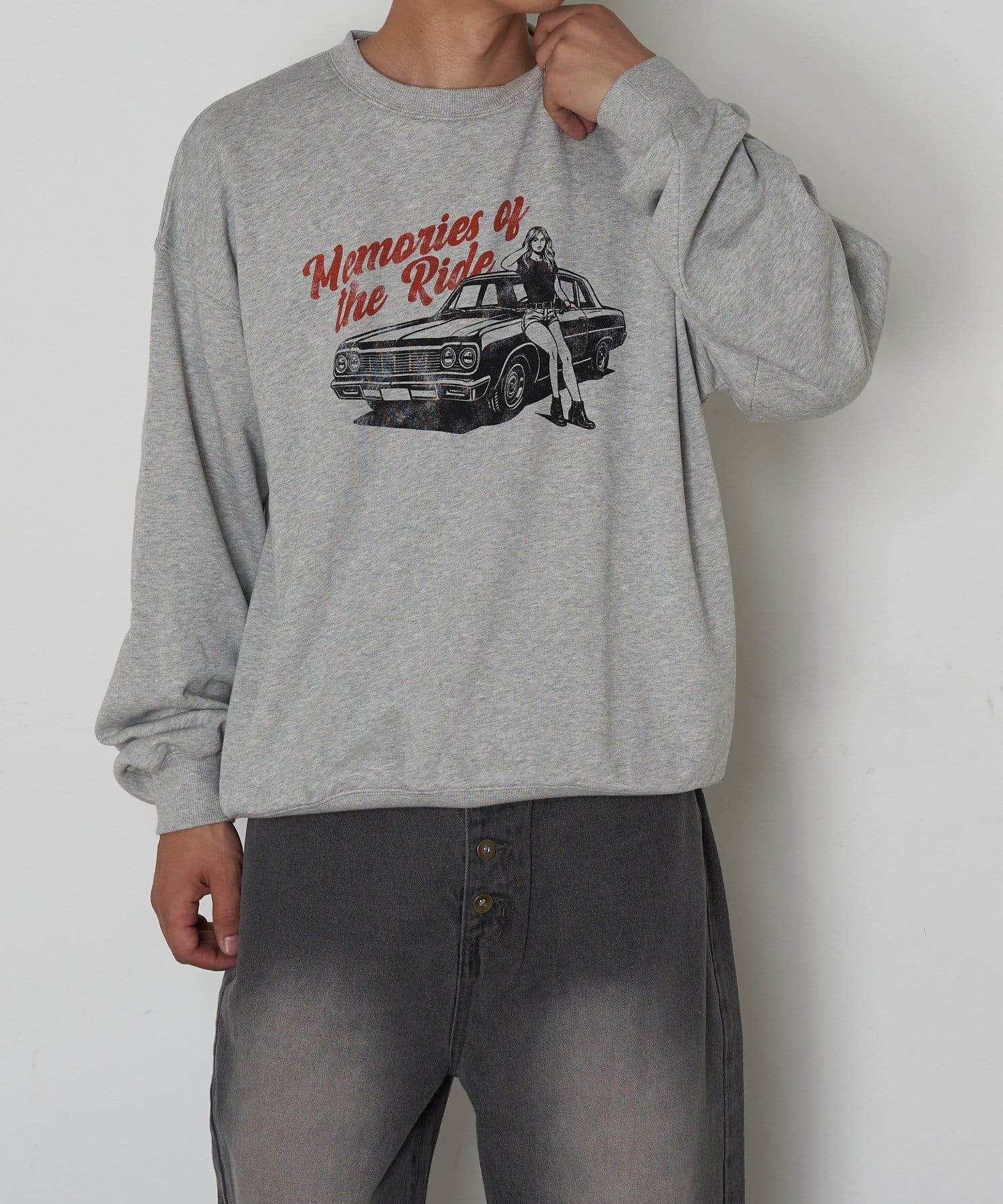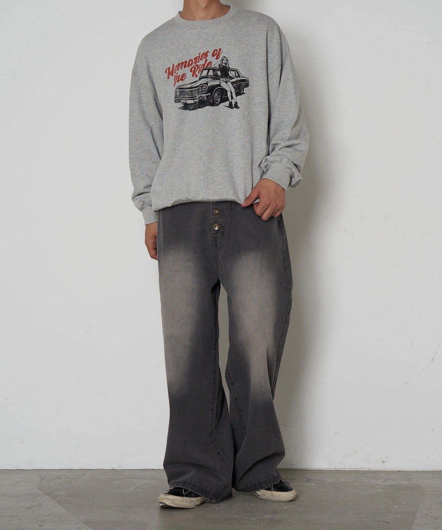 シンプルなデニムと合わせて、プリントスウェットを主役にしたカジュアルコーデに。