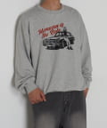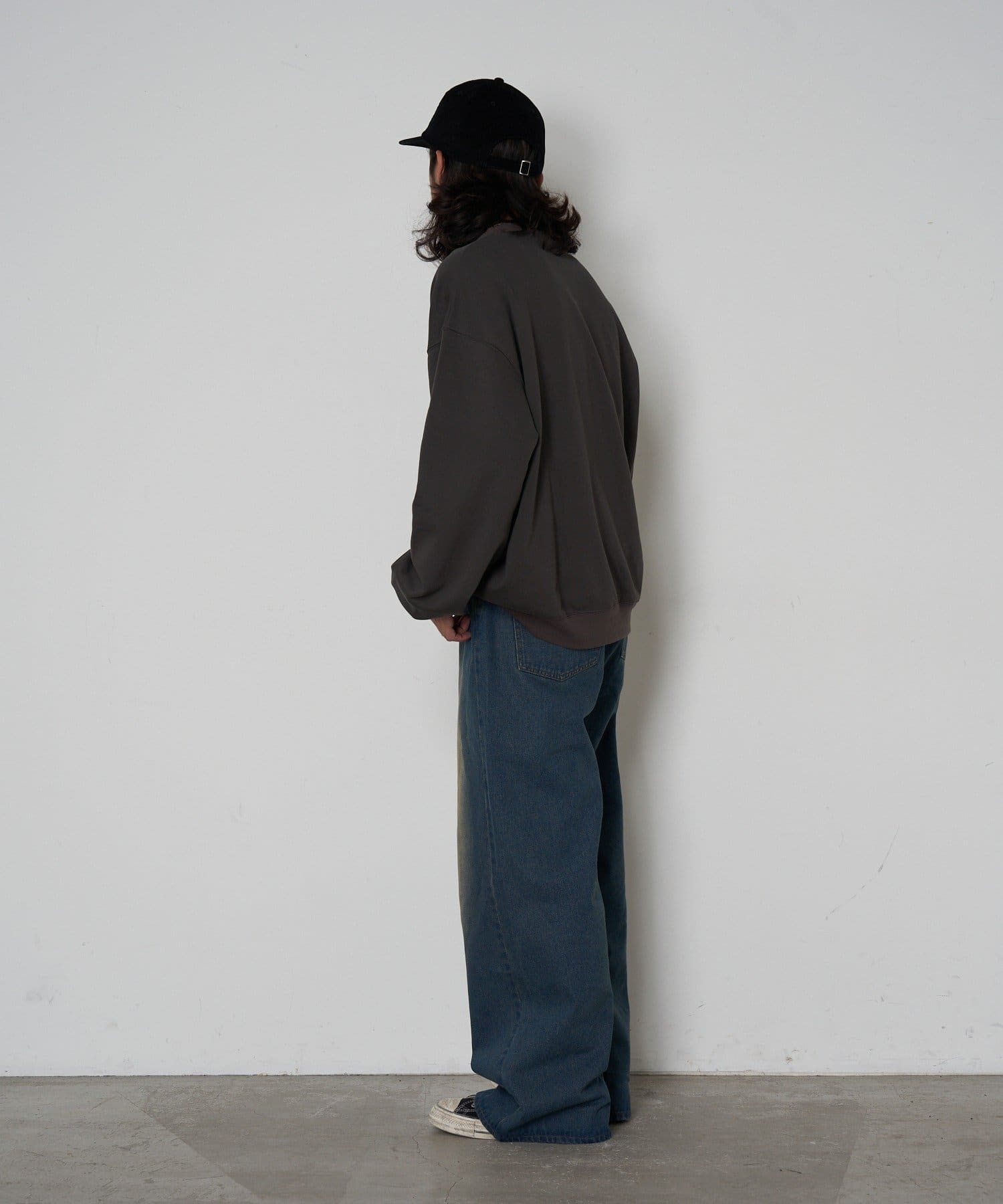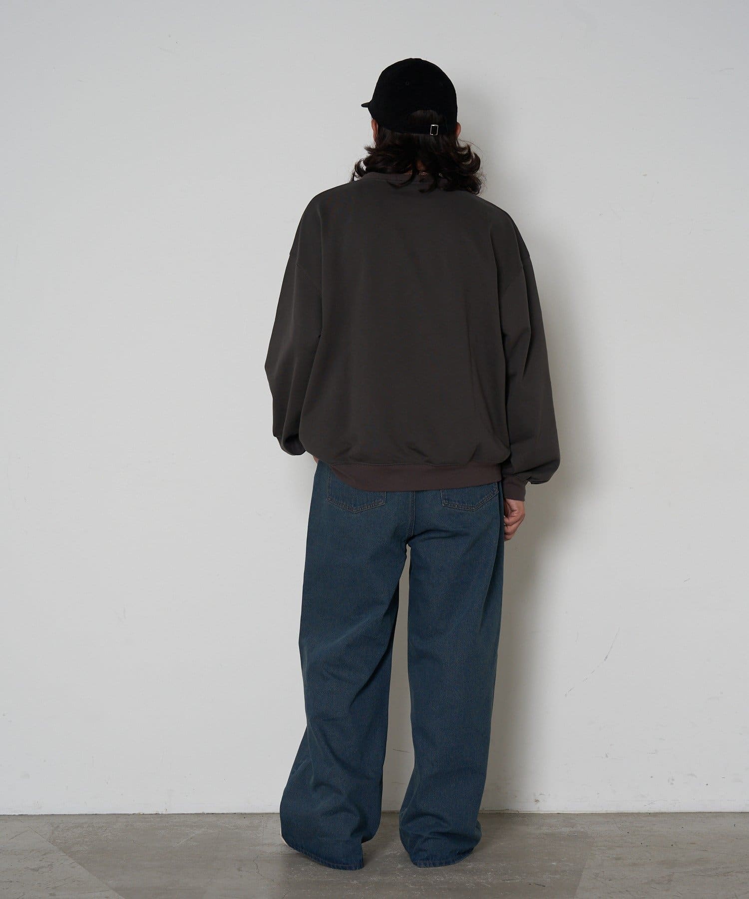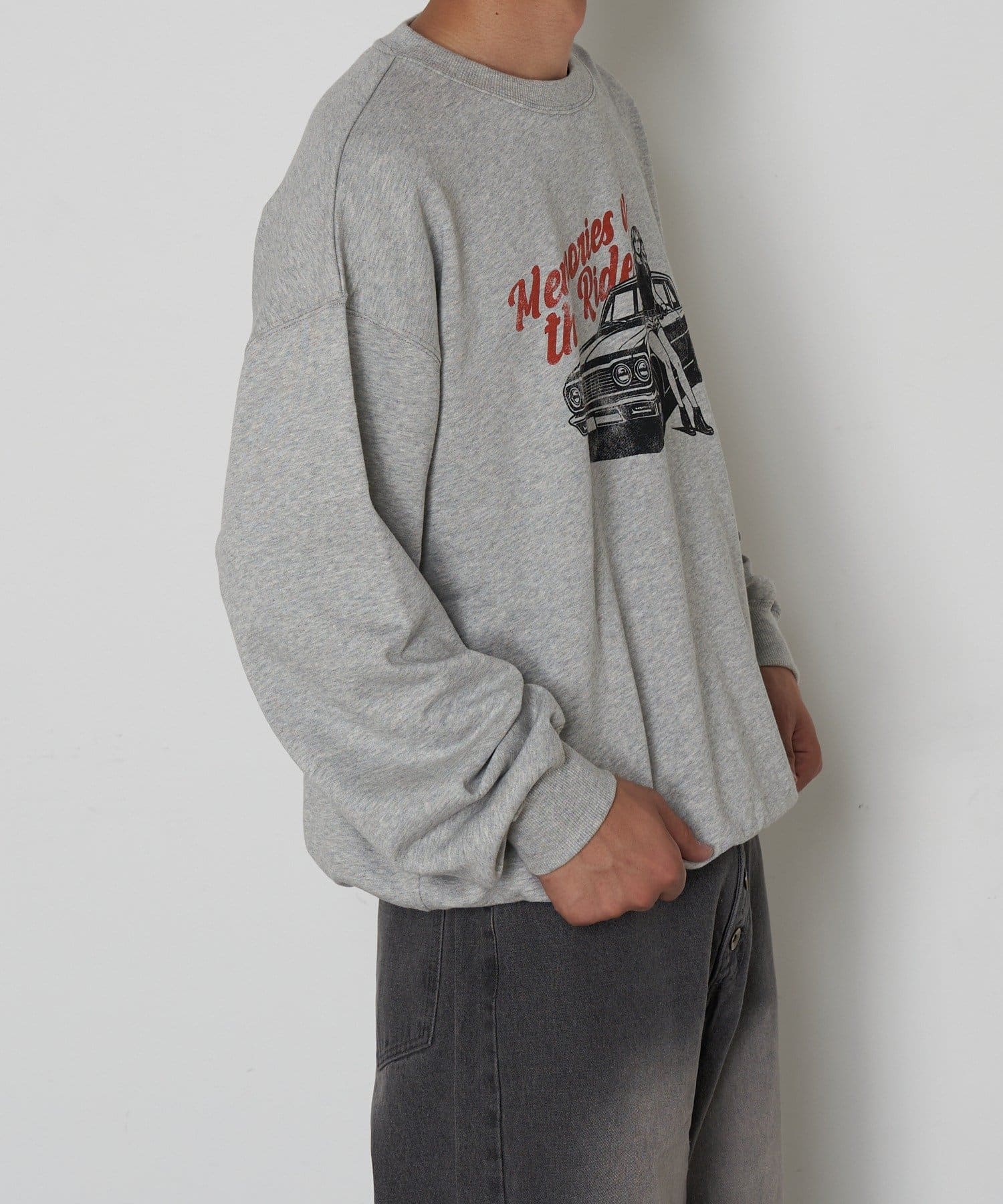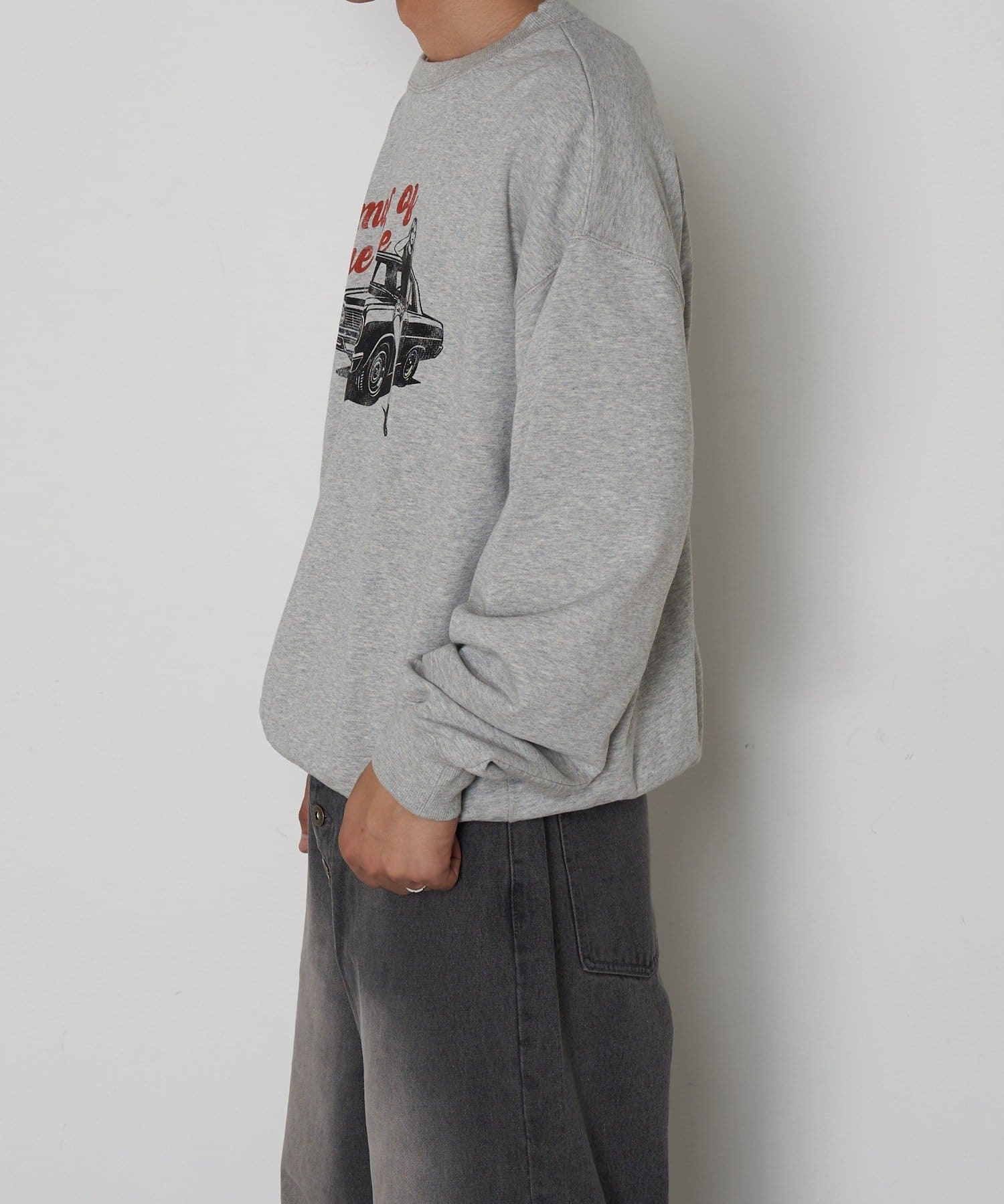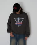 シンプルなデニムと合わせて、プリントスウェットを主役にしたカジュアルコーデに。