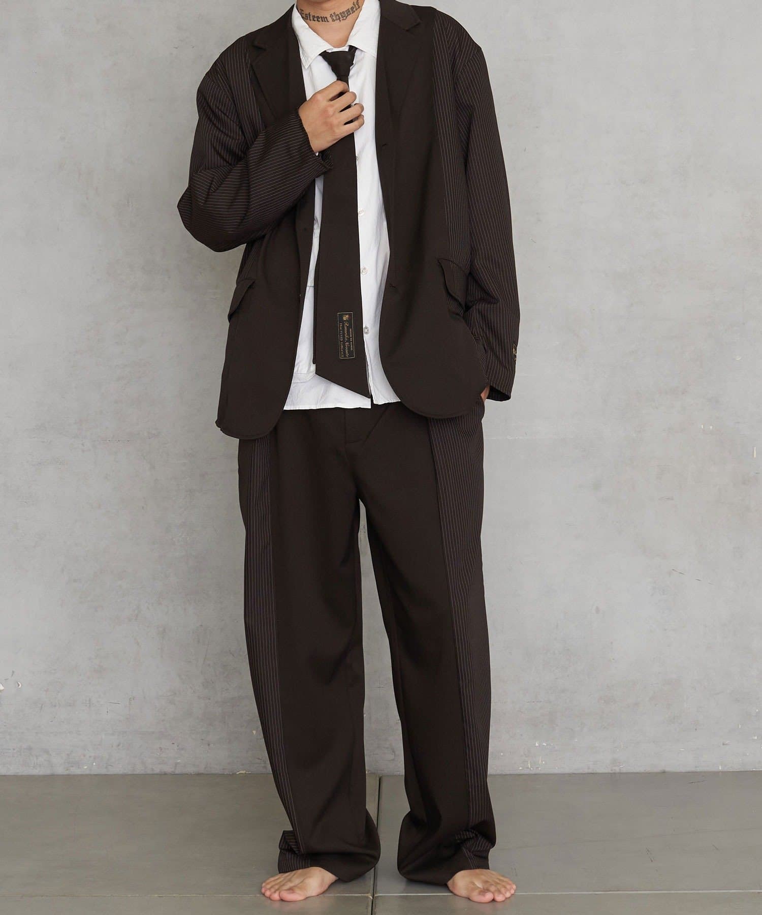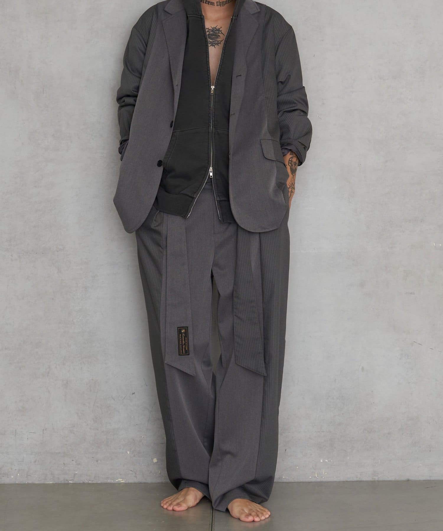 フォーマルウェアのために設計された生地や構造を解体し、切り替えという手法で再編集することで、スーツの文脈とストリートの感覚を一着の中に共存させる。