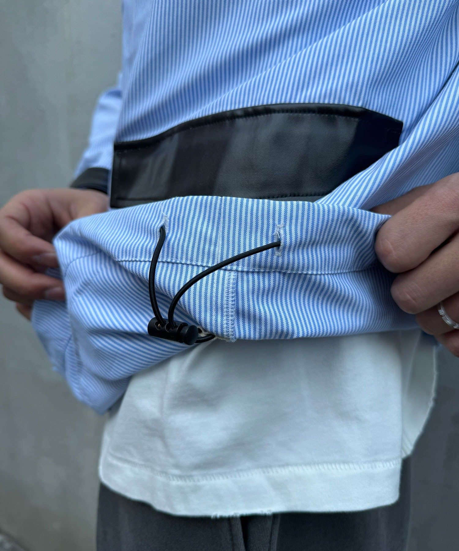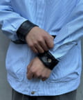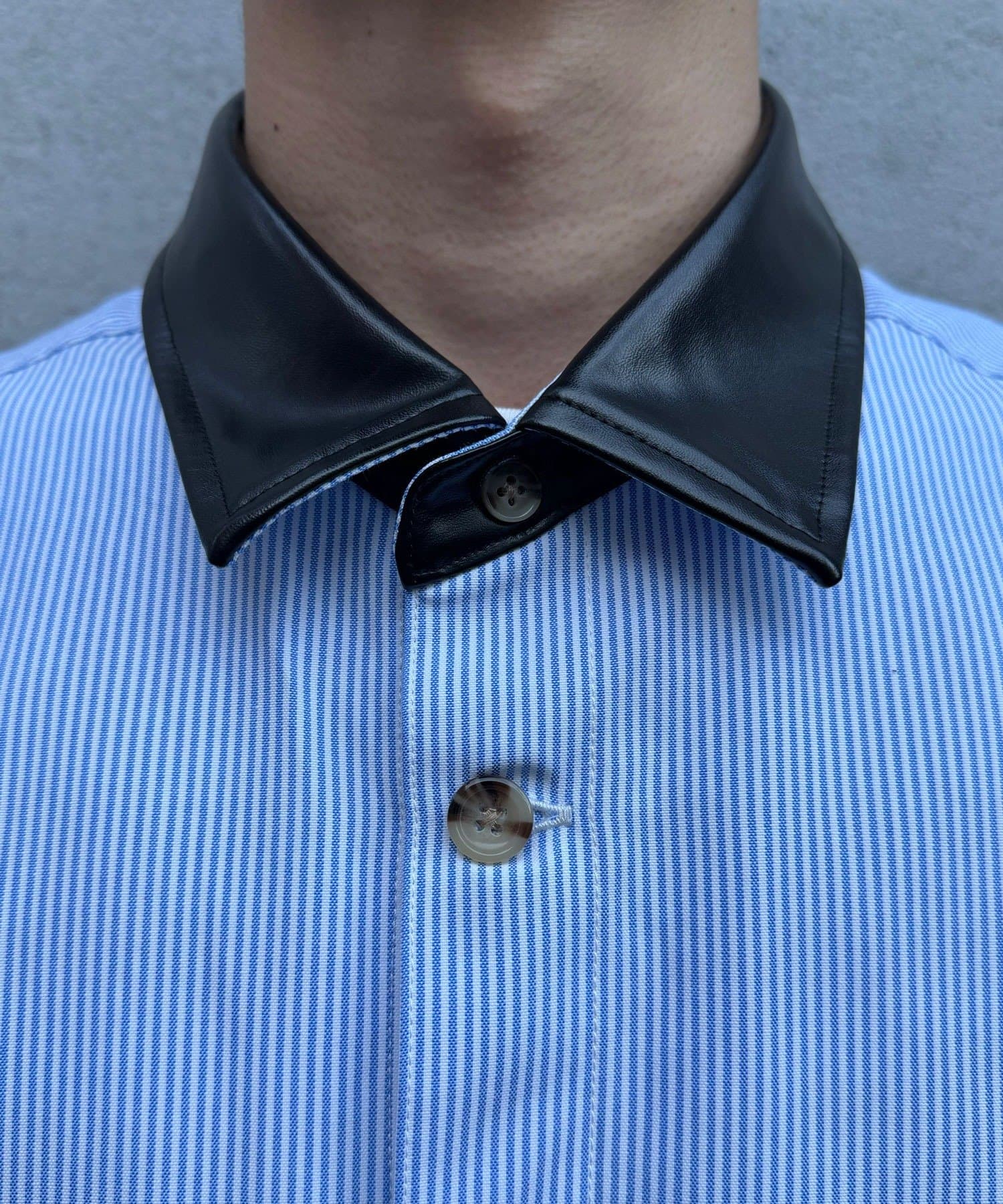 細かなストライプ柄とレザーの質感が絶妙にマッチし、羽織るだけで品のあるワークスタイルが完成します。