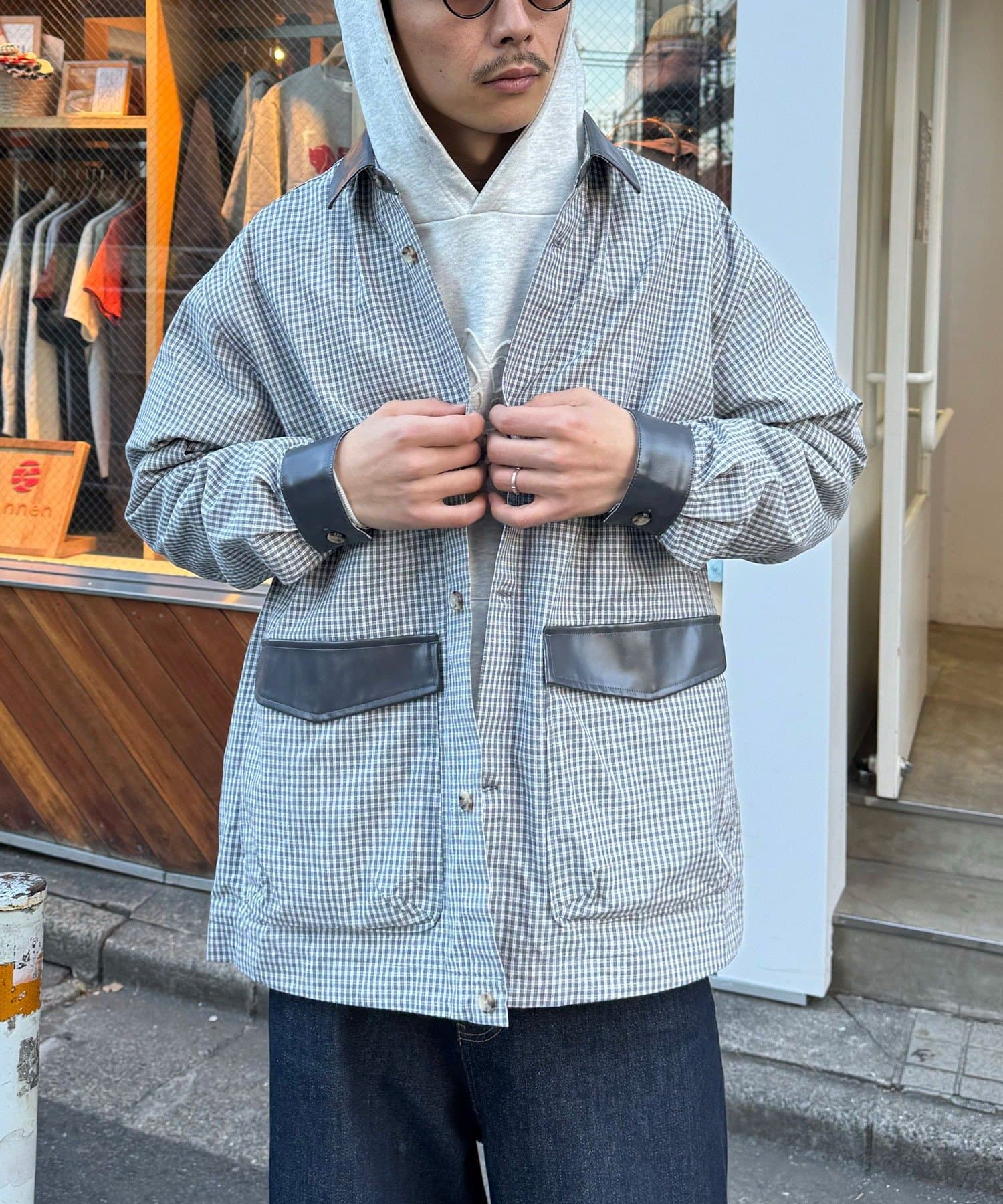 襟や袖口、ポケットにフェイクレザーを配した、素材のコントラストが際立つシャツジャケット。