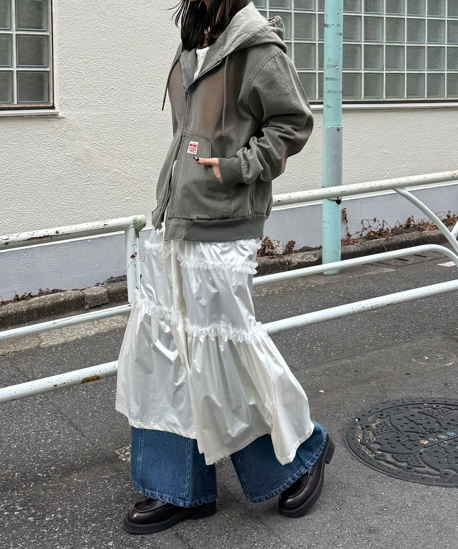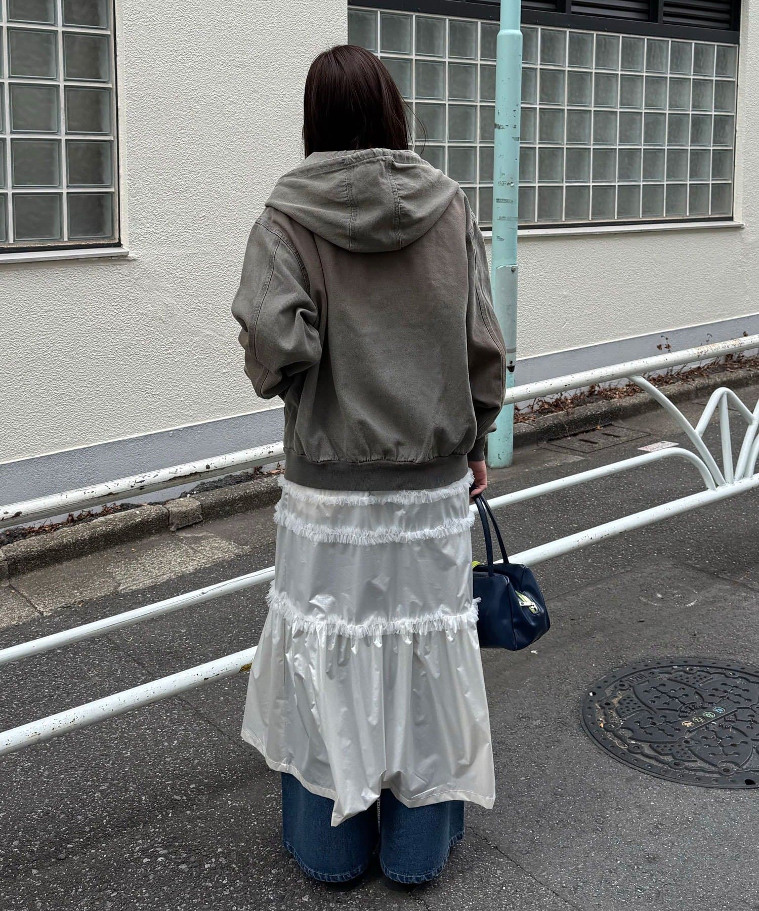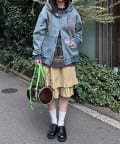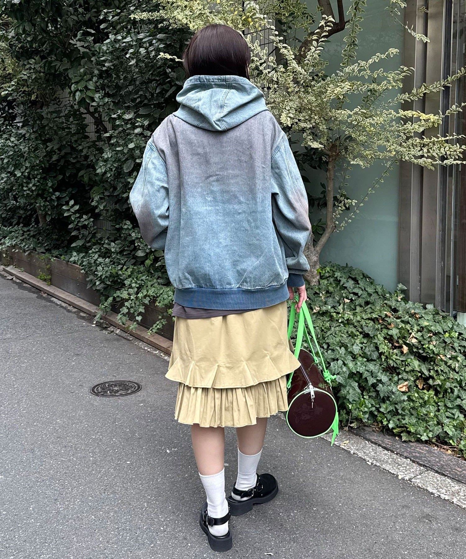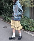 加工感のあるタイプには、あえてガーリーなフリルスカートを合わせると◎