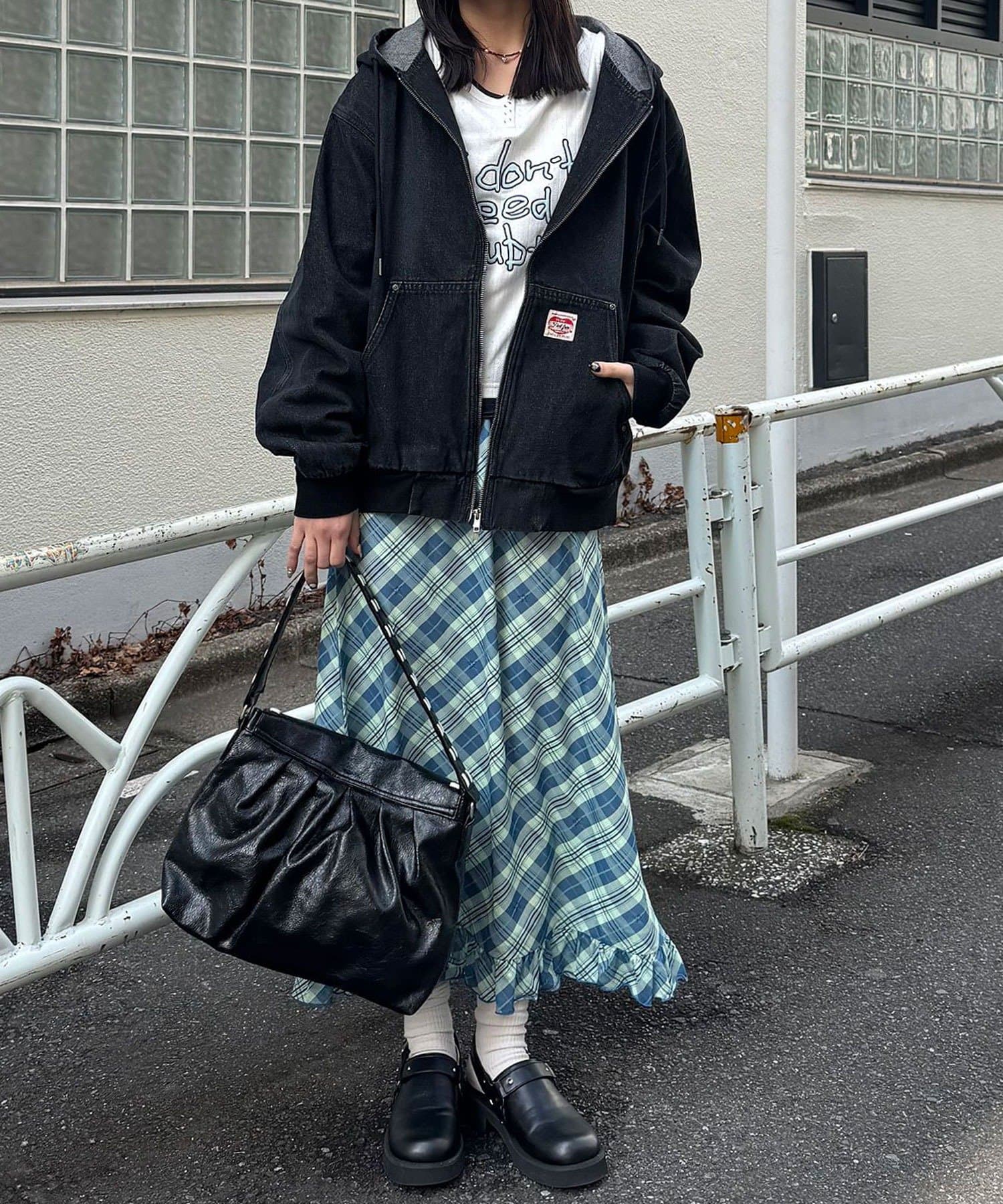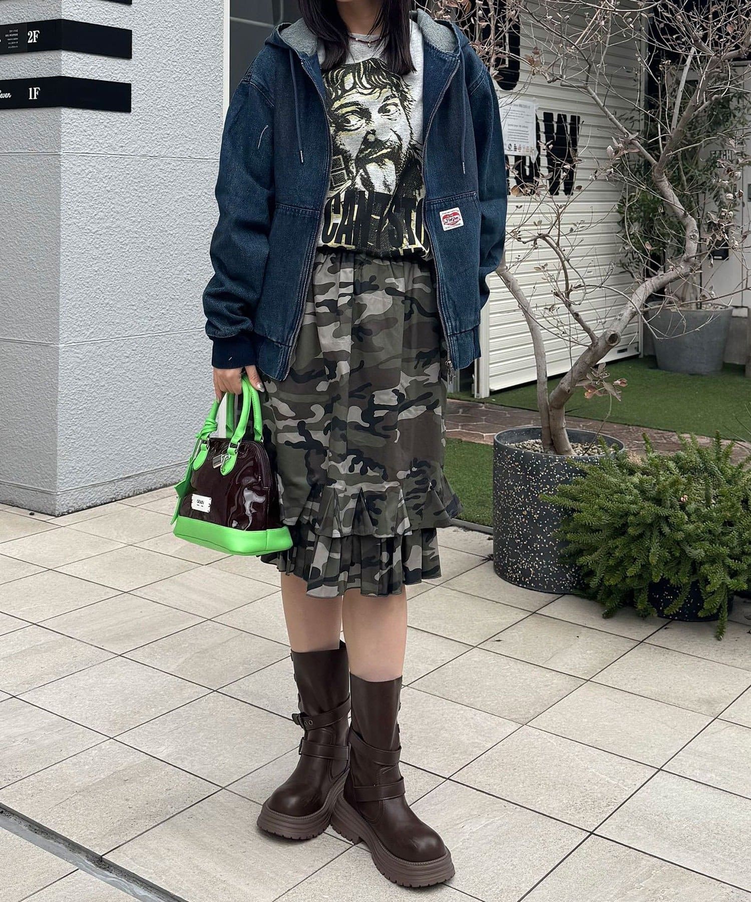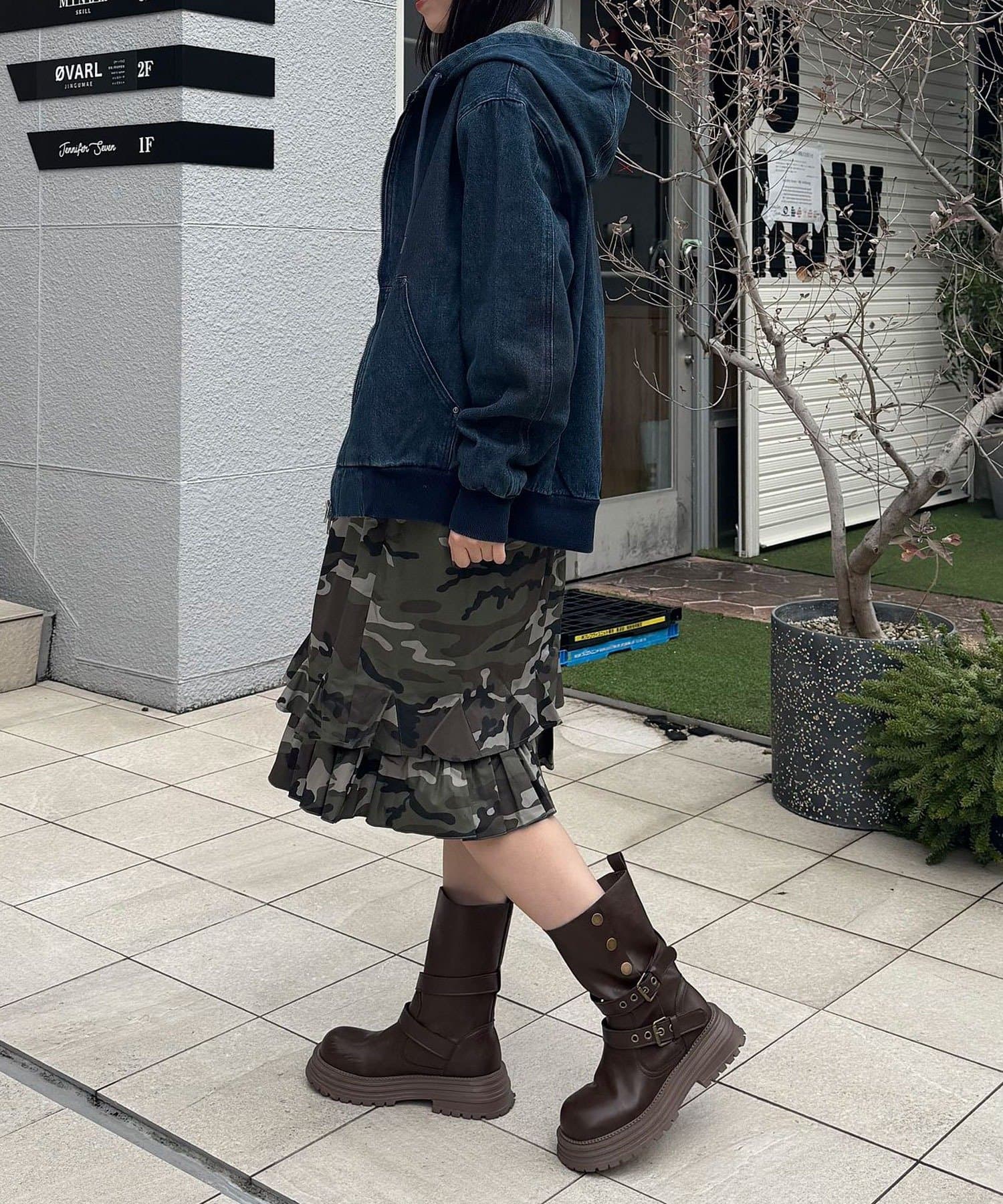加工感のあるタイプには、あえてガーリーなフリルスカートを合わせると◎