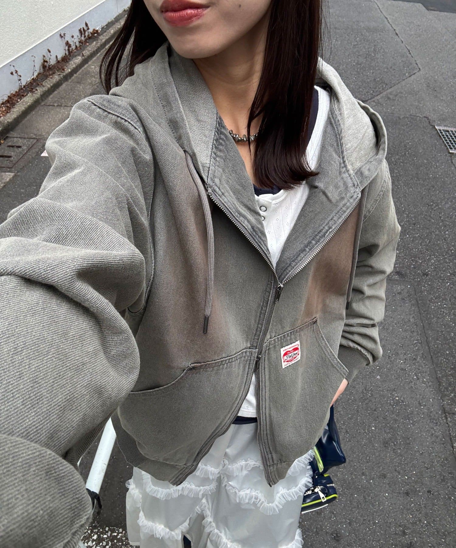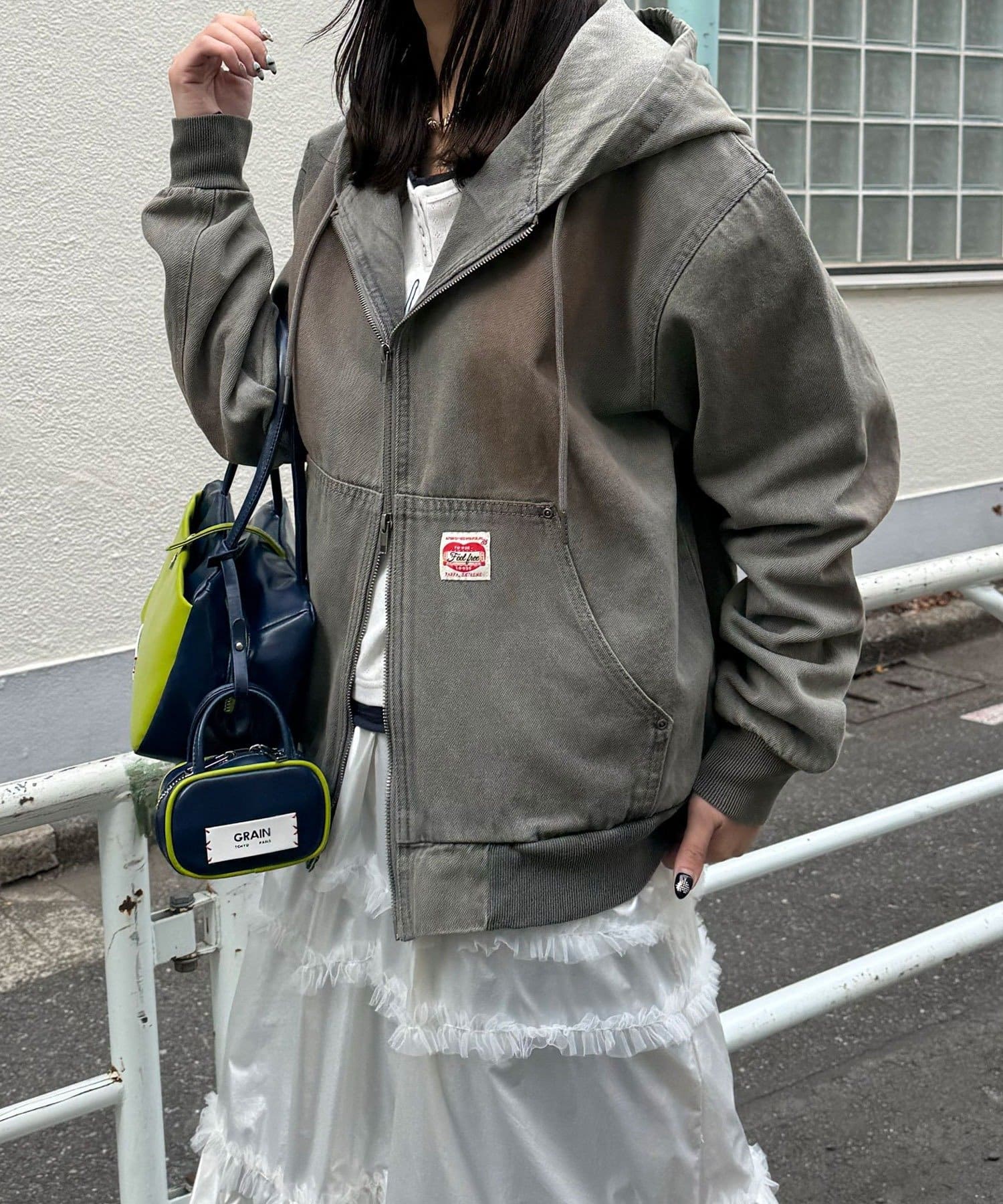 フロントのダブルジップ仕様や、さりげないタグ使いなど、細部までストリートの遊び心を詰め込んだ一着。