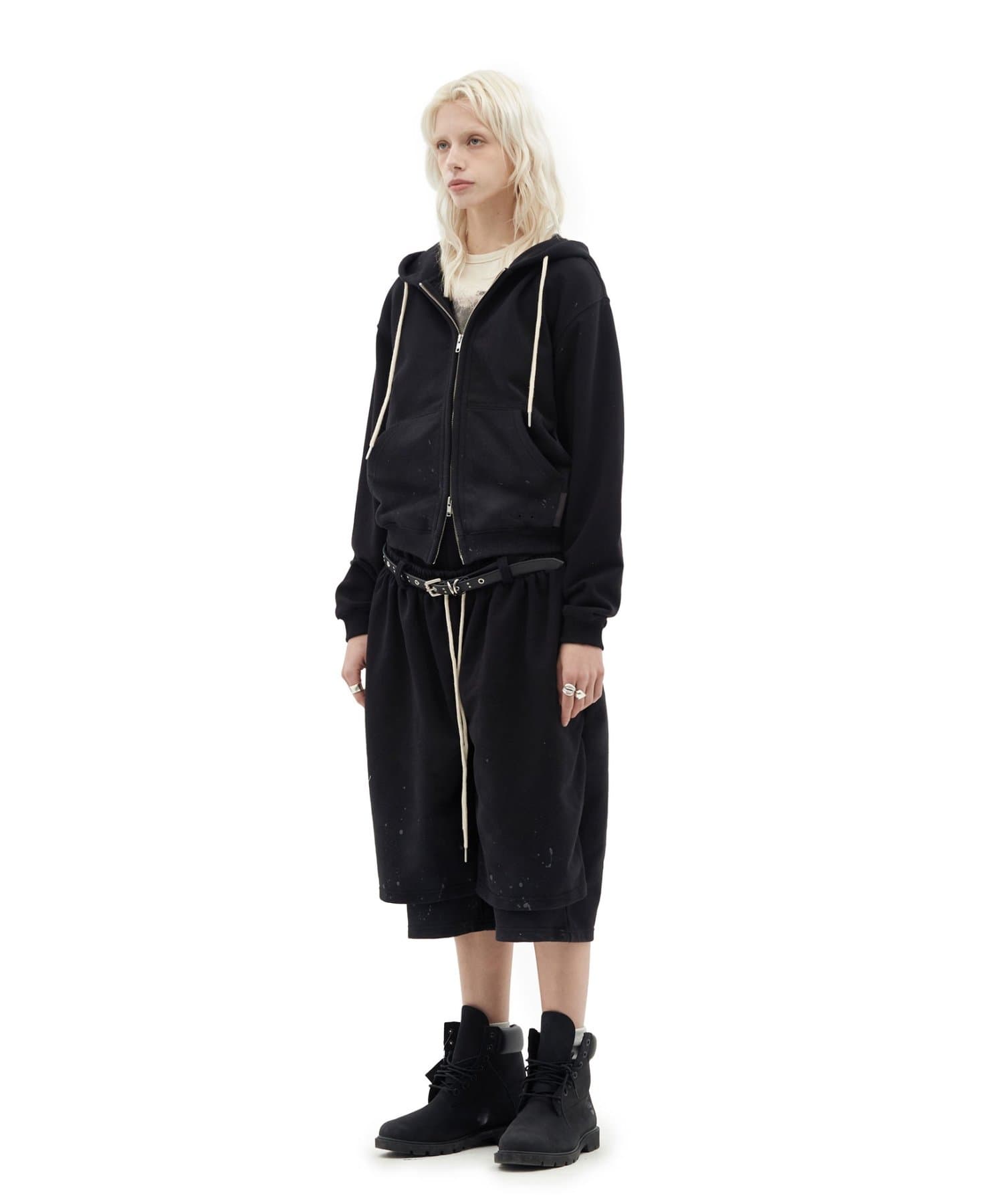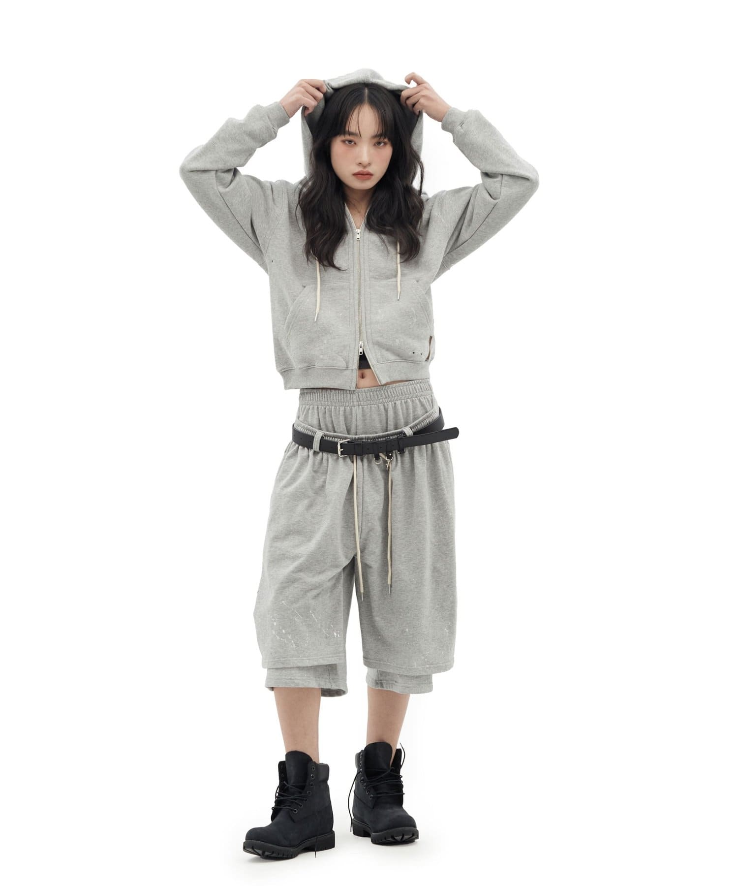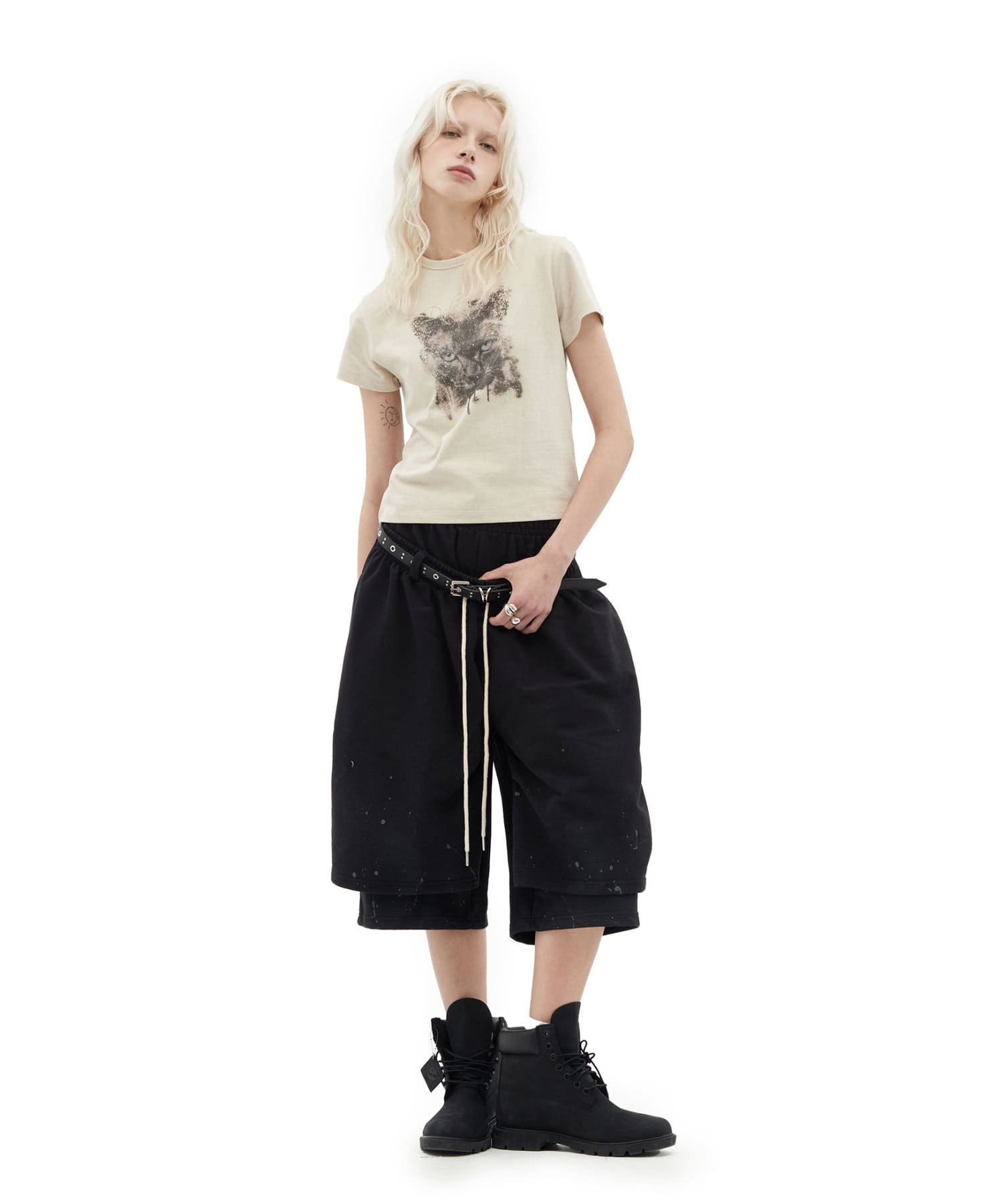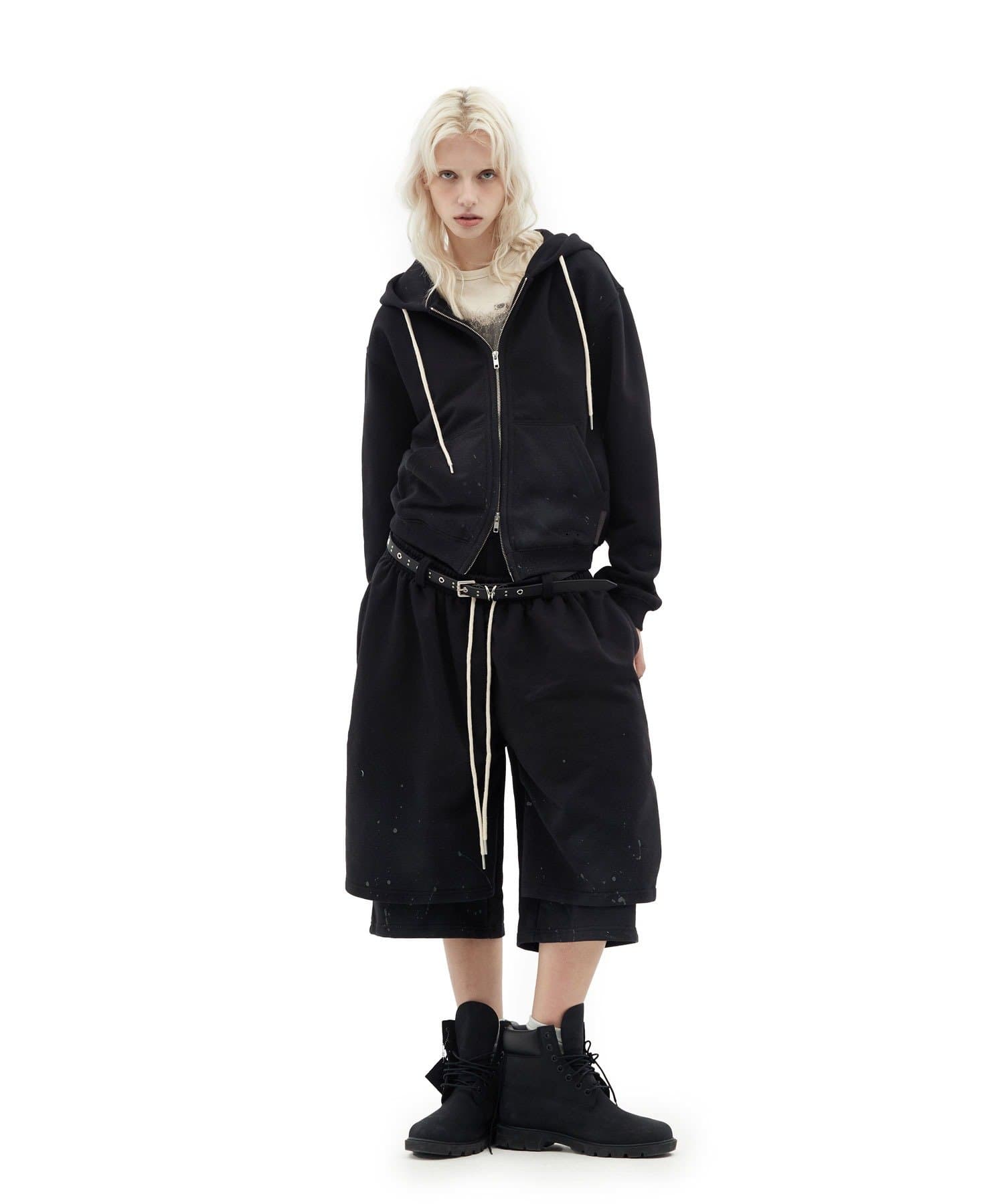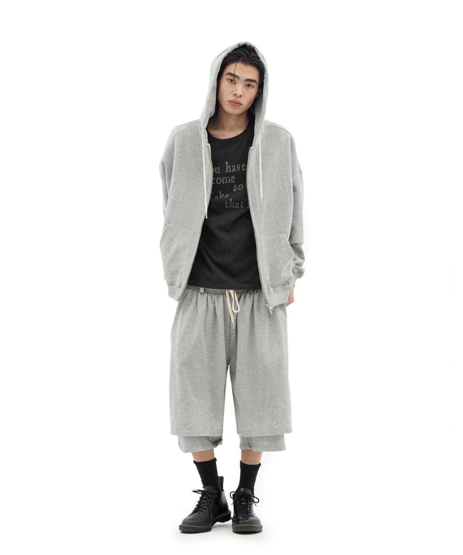 2枚重ねて穿いているような立体的なレイヤードシルエットが目を惹く、デザインスウェットショーツ。