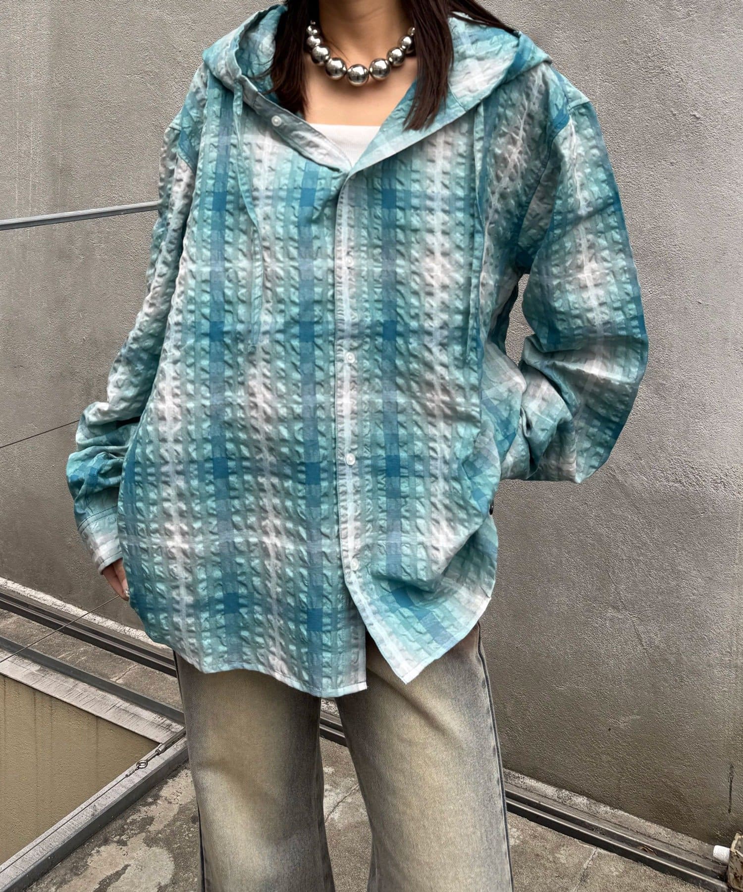 ぽこぽことした表面感のあるサッカー生地を使用した、フード付きの長袖シャツ。
